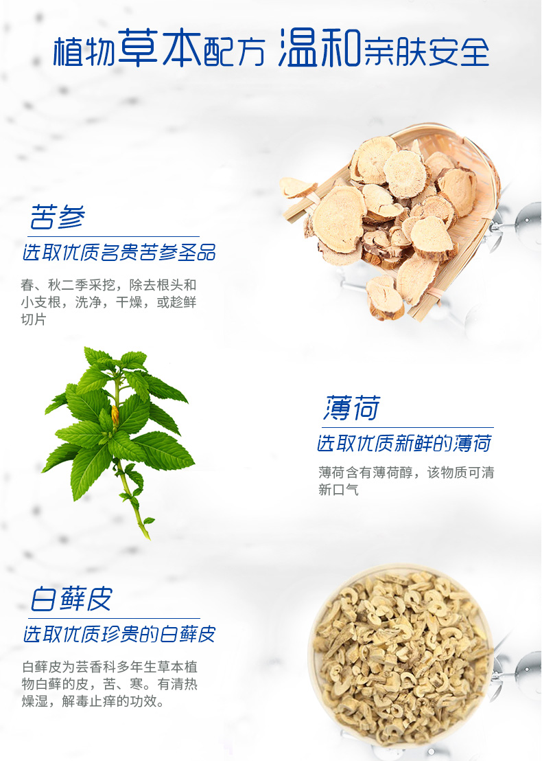 中草药萃取,针对各种皮肤问题,迅速止痒抑菌,温和抑痔,清凉消肿止痛,味道清淡易接受,适合各种人群,减少肛部痛苦,远离痔疮君,轻松解决难言之隐!