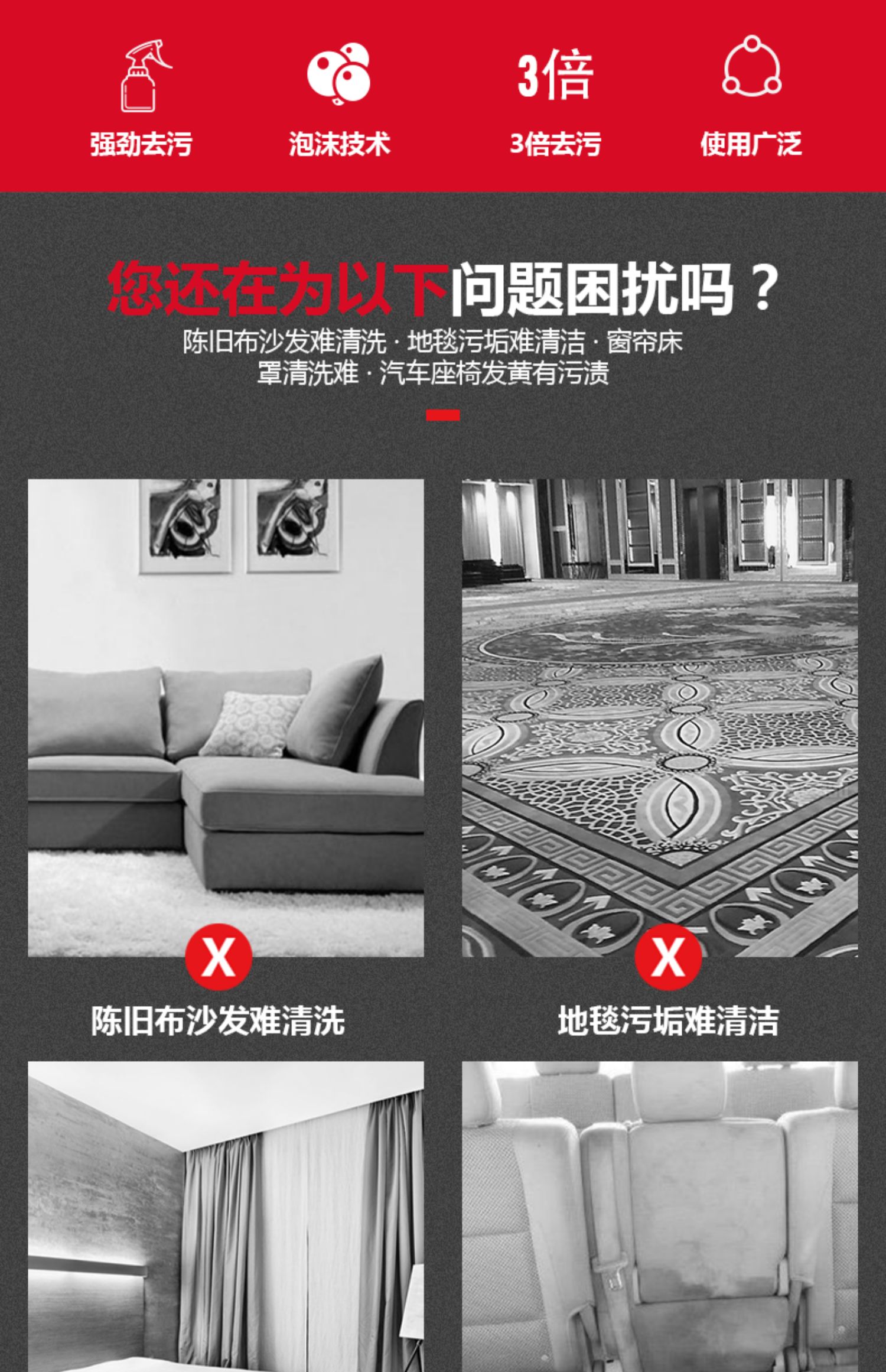 650ML大瓶装带喷头,多功能清洁剂清洗神器,布艺家具,羽绒服,地毯等等都可以使用,免水清洗,深层去污,环保配方,沙发脏了怎么办?用它!用它!喷一喷,轻轻一擦,干净如新~
