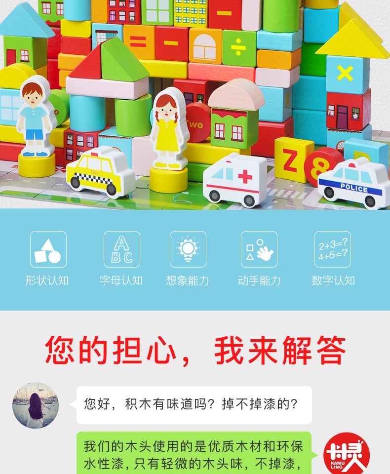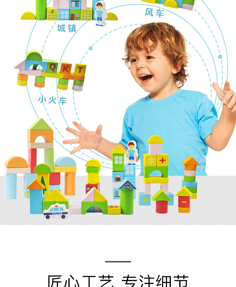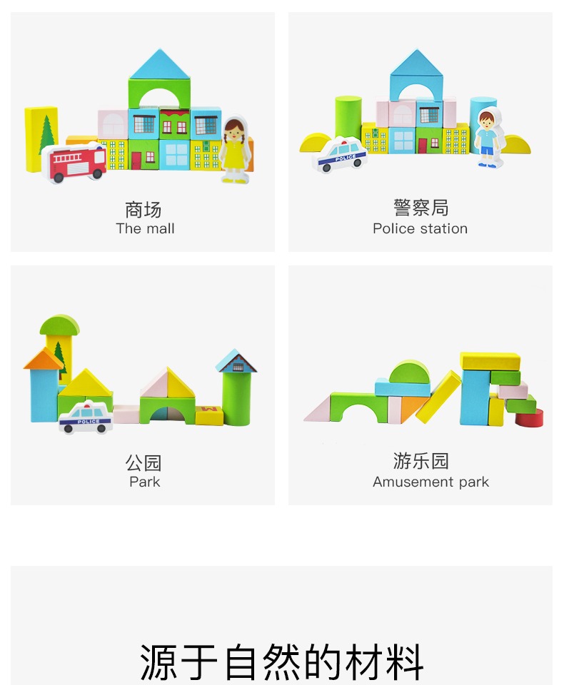 100pcs城市主题积木,选用优质实木,无毒水性漆,更环保安全。多种场景组合搭建,提升表达能力,大颗粒积木,安全环保,通过质量检测,放心完全使用,让我们的宝宝都成为小天才