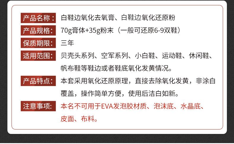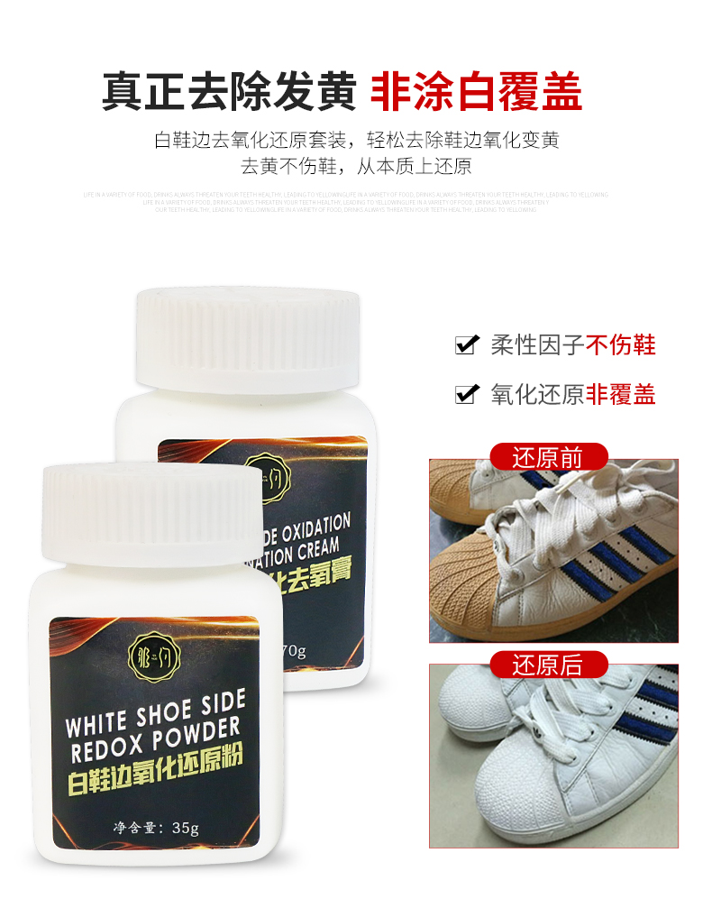 喜欢穿各种小白鞋推荐入手,专业去氧化还原套餐,做到真正的去除发黄增白,非一次性涂白覆盖。主要也是方便,特别是着急出门的时候,用它擦一擦旧鞋也变新鞋穿!超值速抢!!