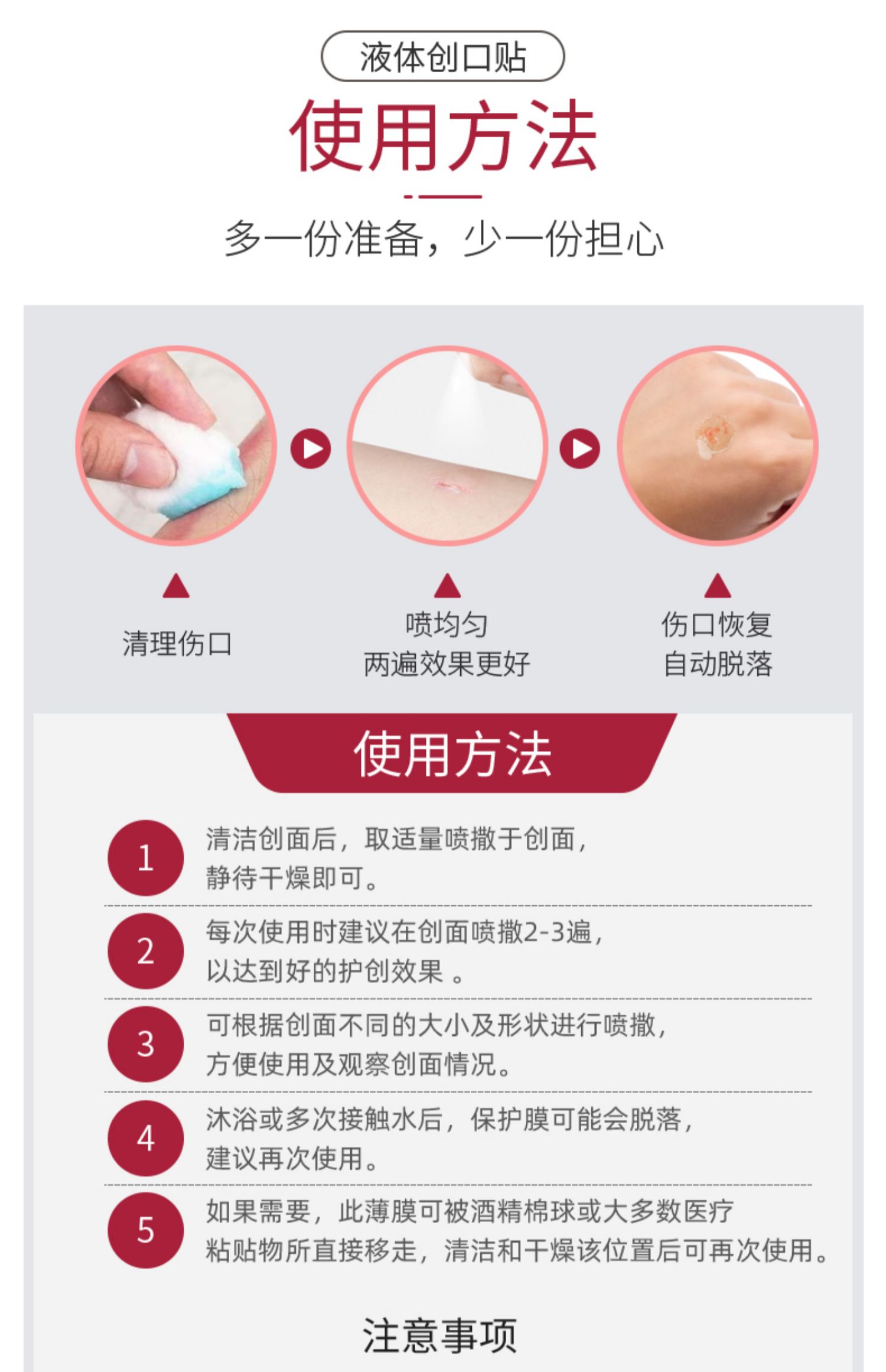 主要成膜材料采用丙烯酸盐共聚物,无细胞毒性,无刺激致敏作用,在体温作用下约1分钟,形成一层无色透明、透气的保护膜,及时保护伤口,防止二次伤害,家庭常备哦!