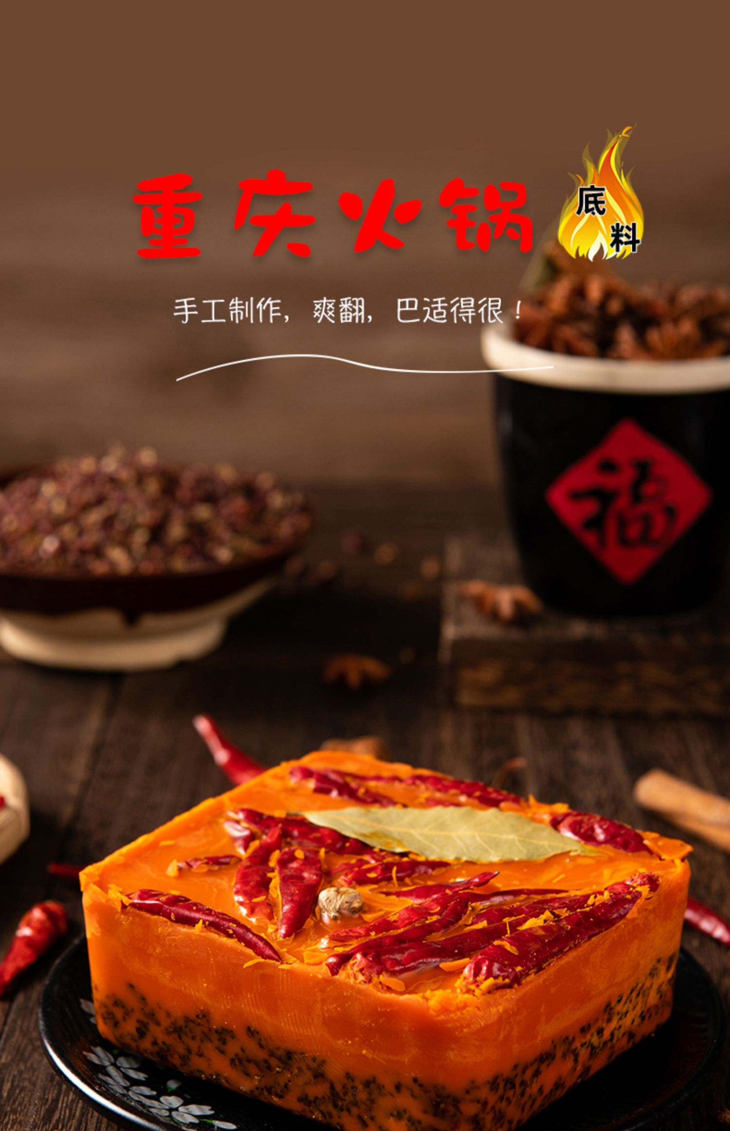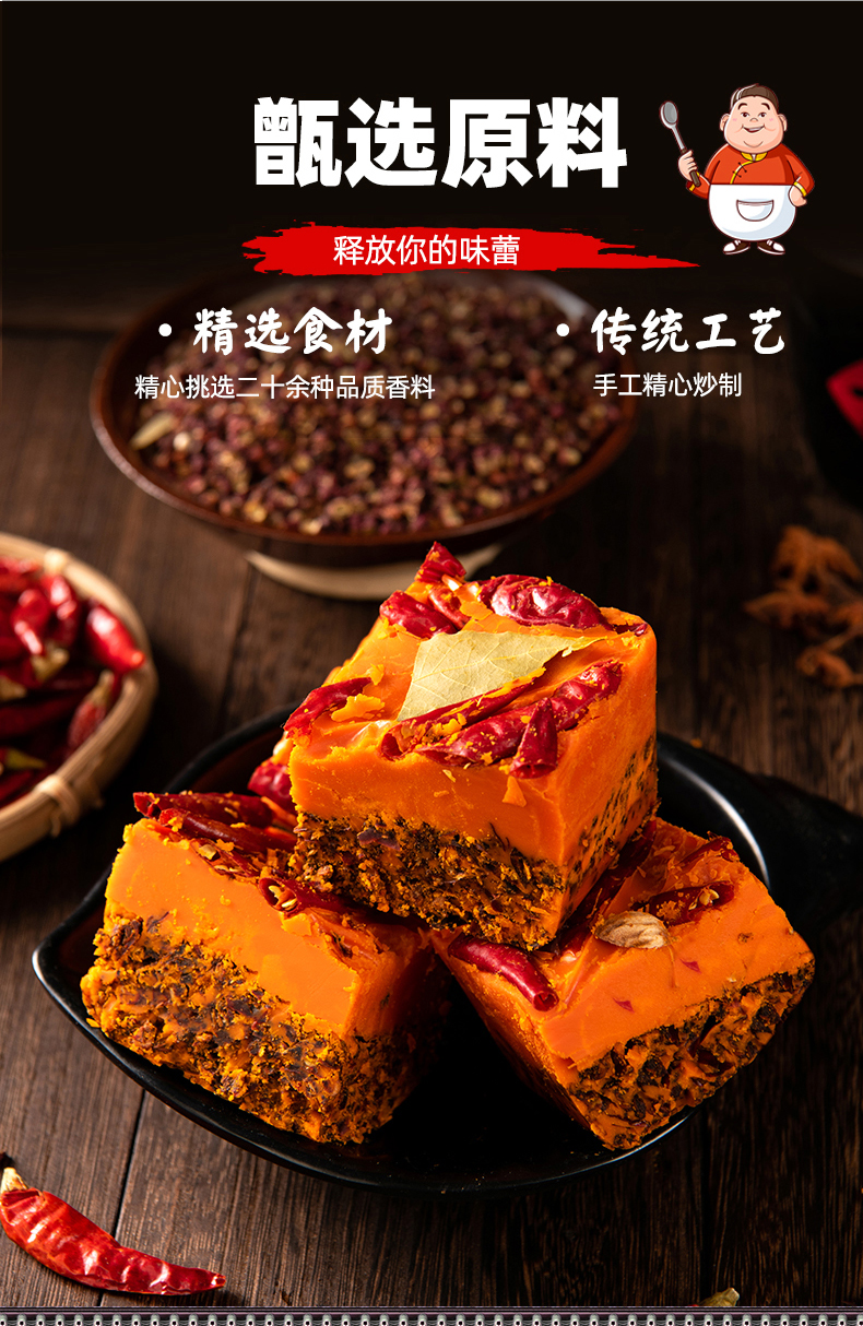 重庆火锅底料,手工制作,爽翻,巴适得很!精选食材,精心挑选二十余种品质香料,传统工艺,手工精心炒制。