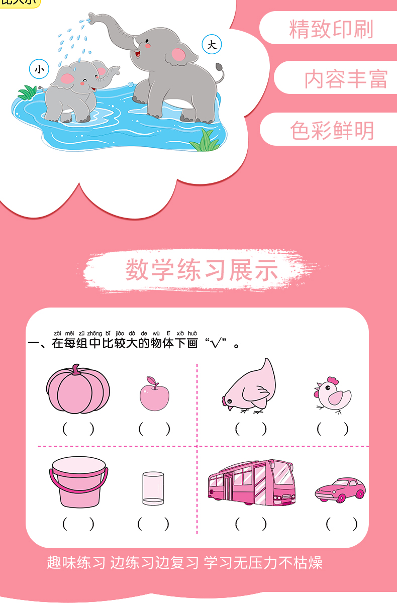本套教材由易到难,配图丰富生动,便于激发孩子的数学潜能,为小朋友打下坚实基础,让孩子边学边玩,轻松学习,爱上上学。培养逻辑思维。