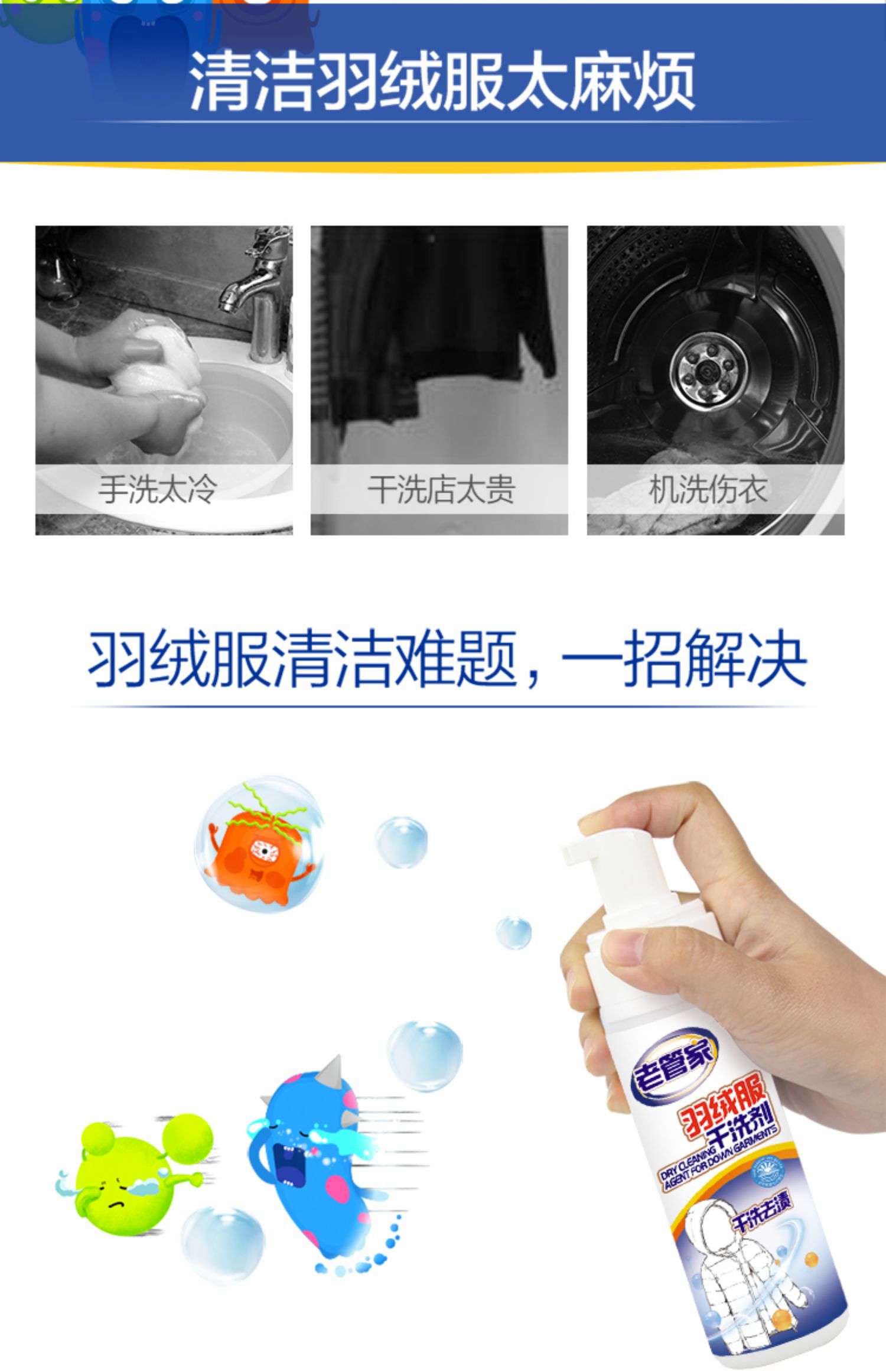 老管家羽绒服干洗剂,免水洗去污神器。轻轻一喷洁净如新,高档羽绒服泡沫干洗剂配高端清洗剂,摆脱清洁困扰,跟污渍说拜拜,血渍果汁油渍轻松除,居家好帮手,必备神器,免水洗!