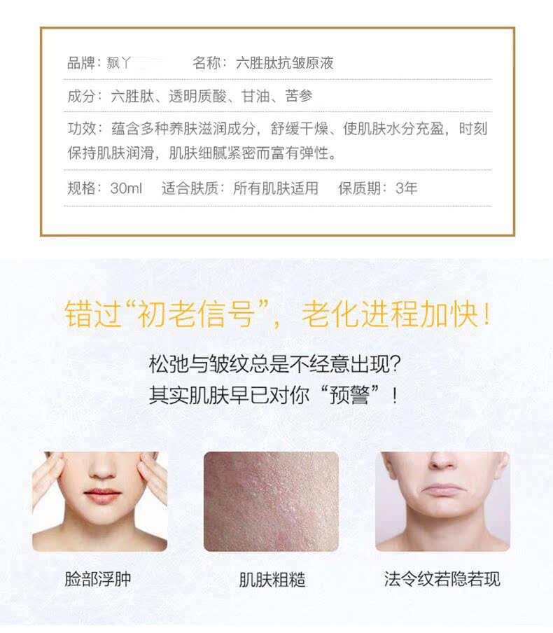 屈臣氏同款62元一瓶!飘丫六胜肽抗皱原液,高活性六性肽,有效去淡化皱纹、抬头纹、法令纹等,补水保湿,提拉紧致,减缓老化,减少细纹,打造零毛孔光感美肌