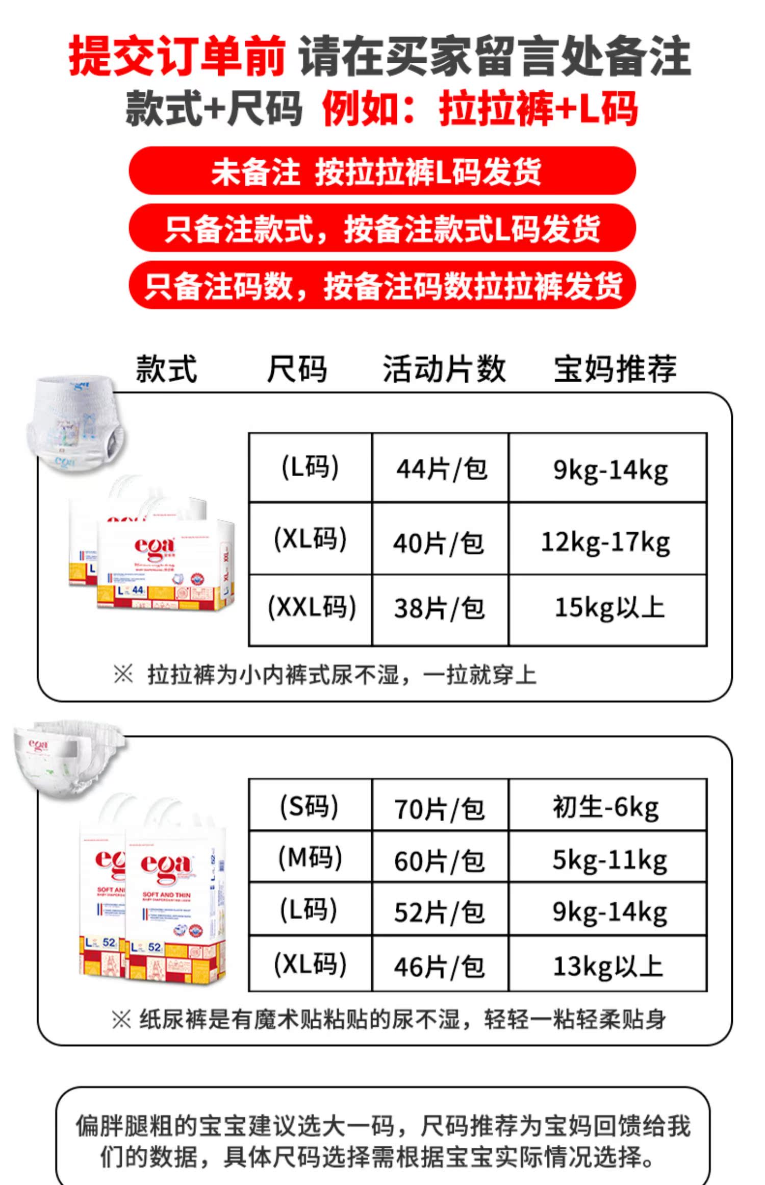 【下单备注尺码+款式,默认发拉拉裤L码】超薄透气拒绝红PP,干爽透气不起坨,柔软亲肤,瞬间吸水,多层锁水,多层防漏,一片好尿不湿从(芯)开始,选ega,让宝宝更快乐!
