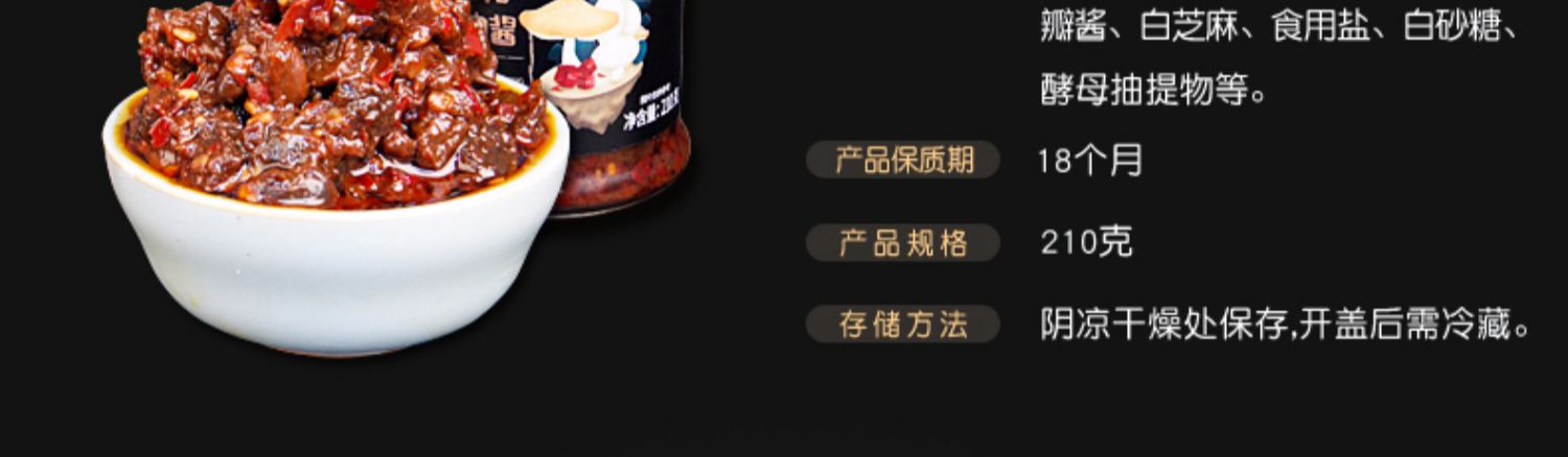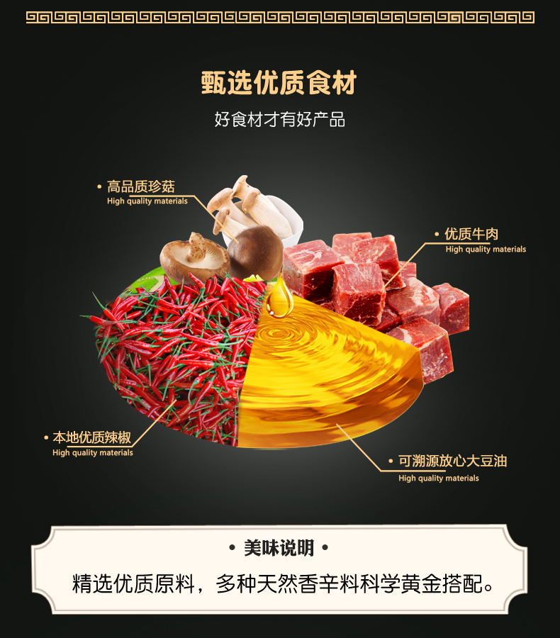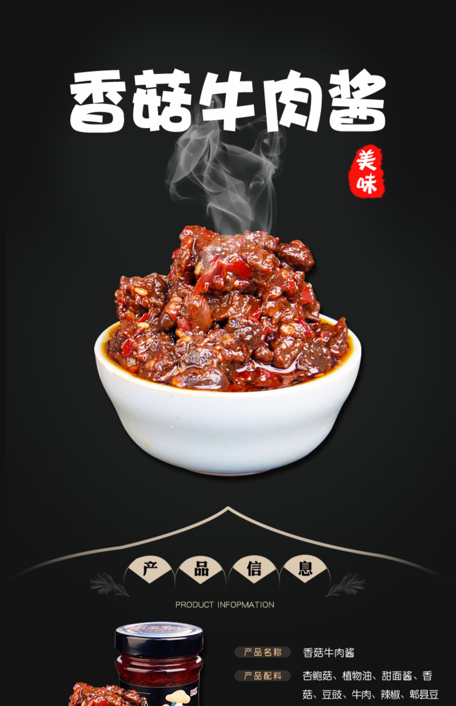 高品质珍菇,优质牛肉,本地优质辣椒,可溯源放心大豆油。牛肉香软,香菇糯绵,酱香浓郁,回味悠长~