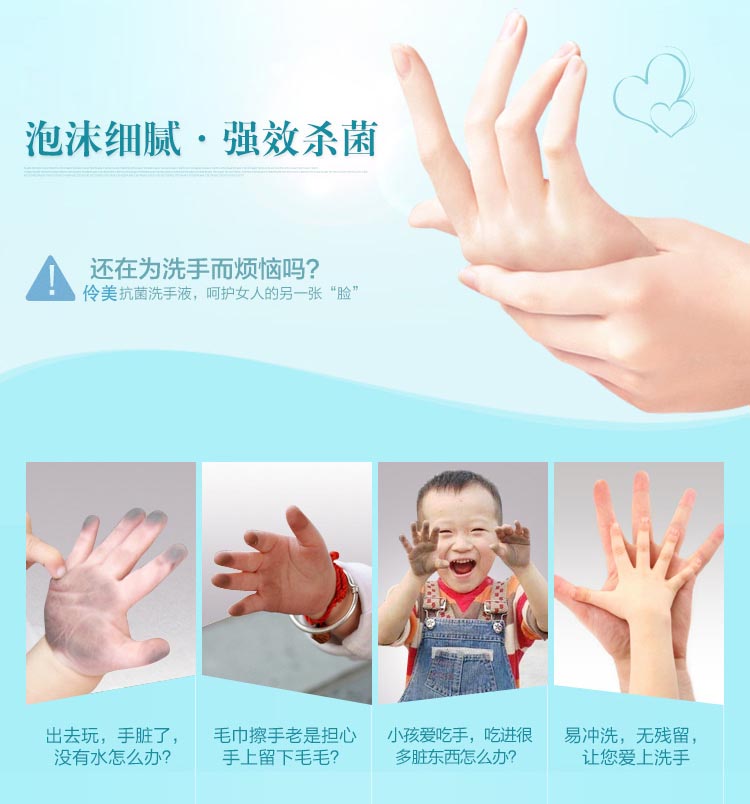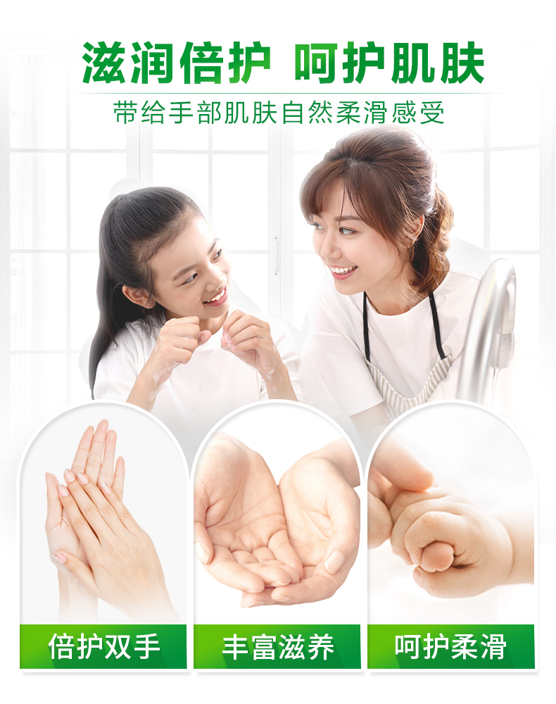 呵护双手肌肤,有效去除手部细菌,超微泡沫泵头,泡沫丰富,用量更节省,温和不粘手随时随地,从此爱上洗手~