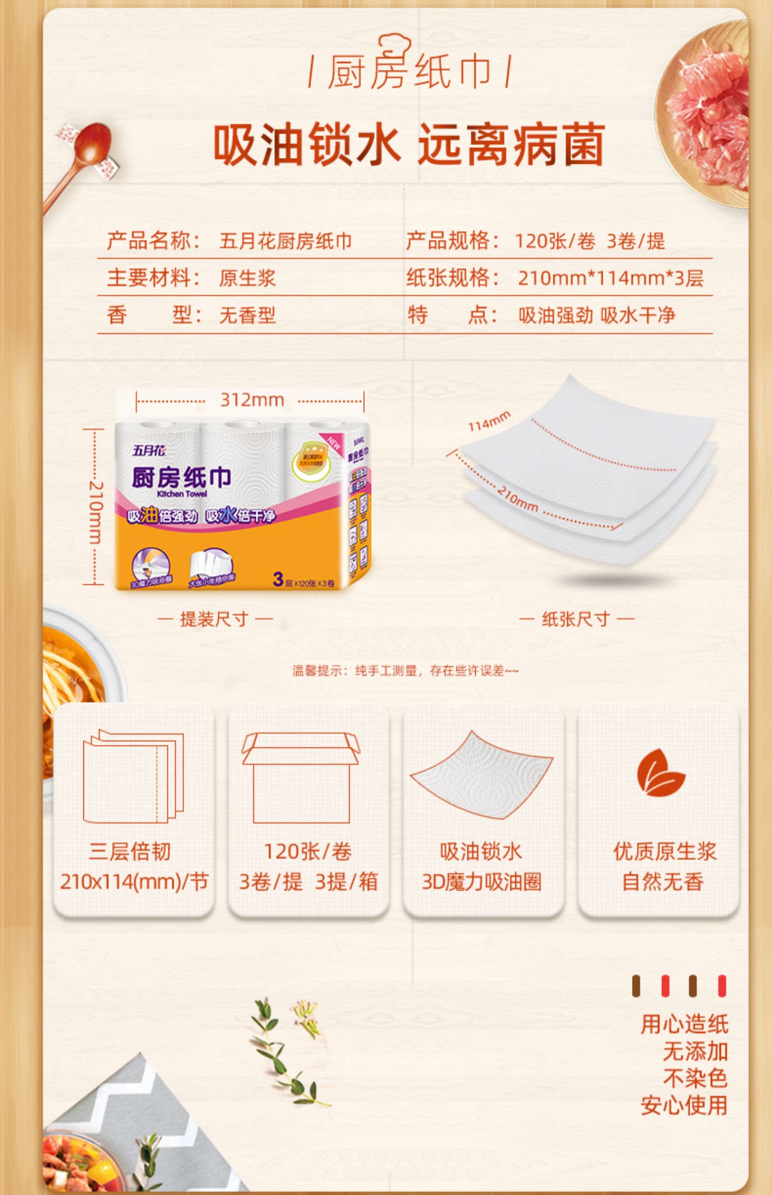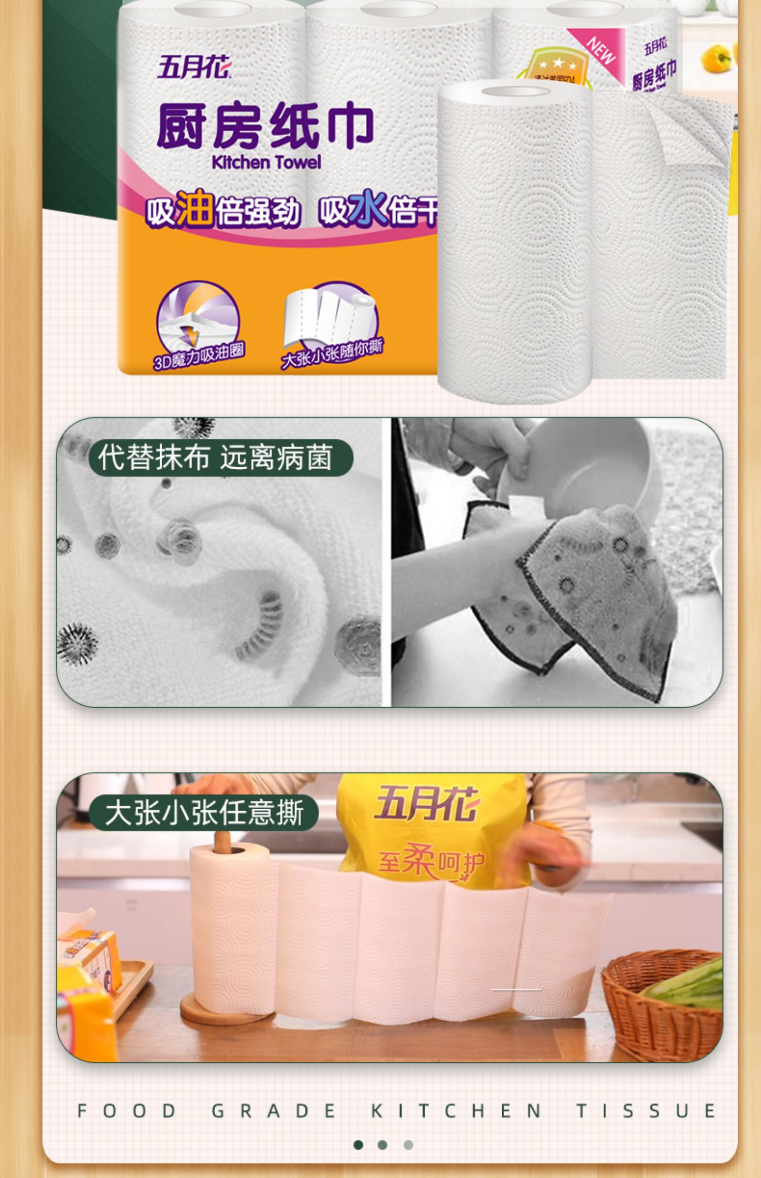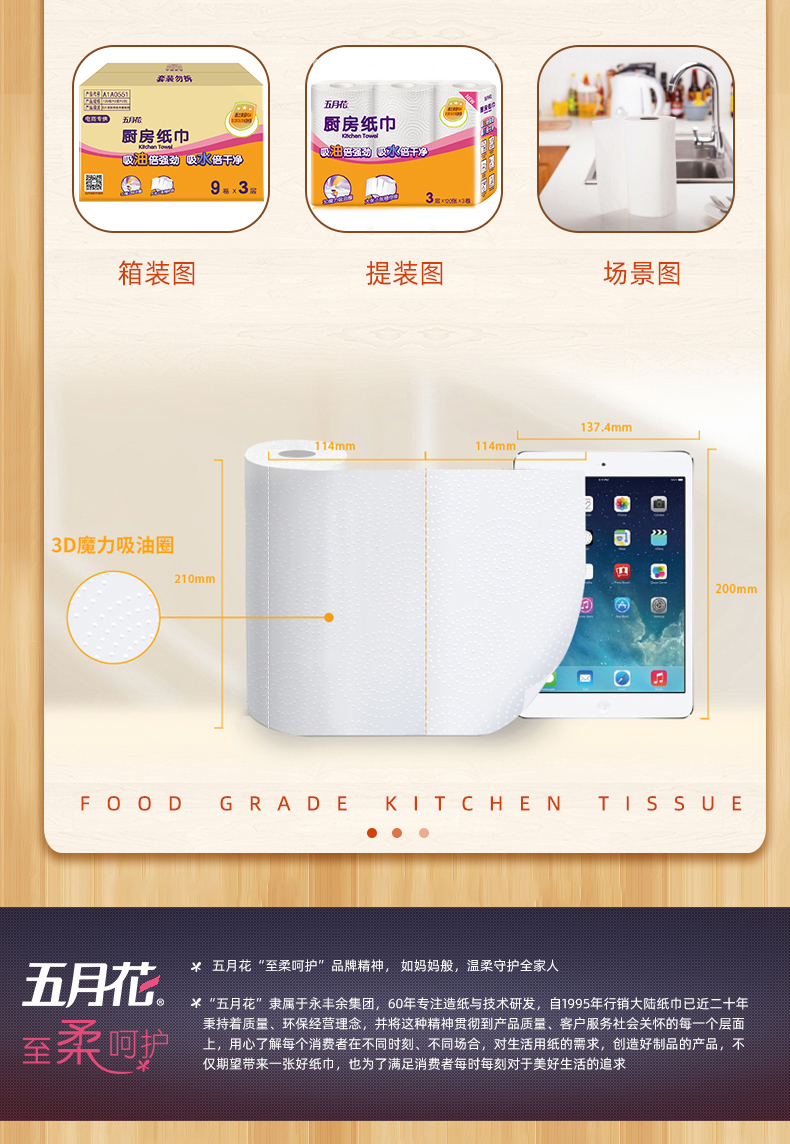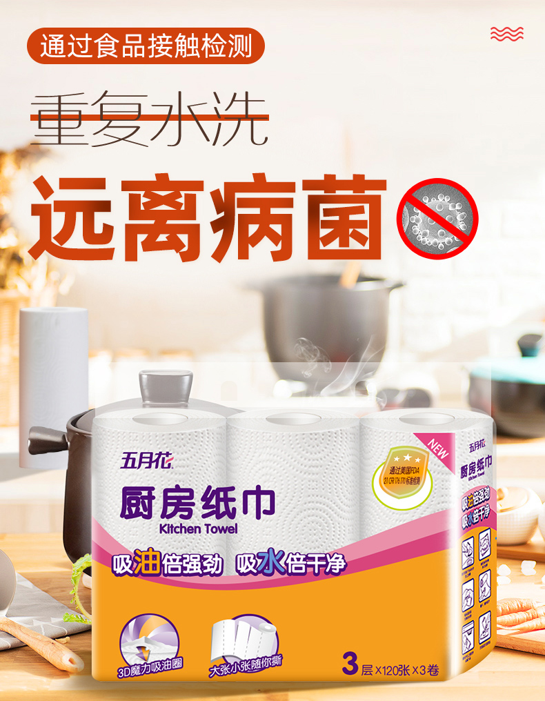 五月花厨房卷纸,3层加厚,120张/卷,共3卷,优质原生木浆,食品级吸油纸,高温消毒,不添加漂白剂,安全无毒,超强吸油吸水。干湿两用,代替抹布,家庭必备帮手~