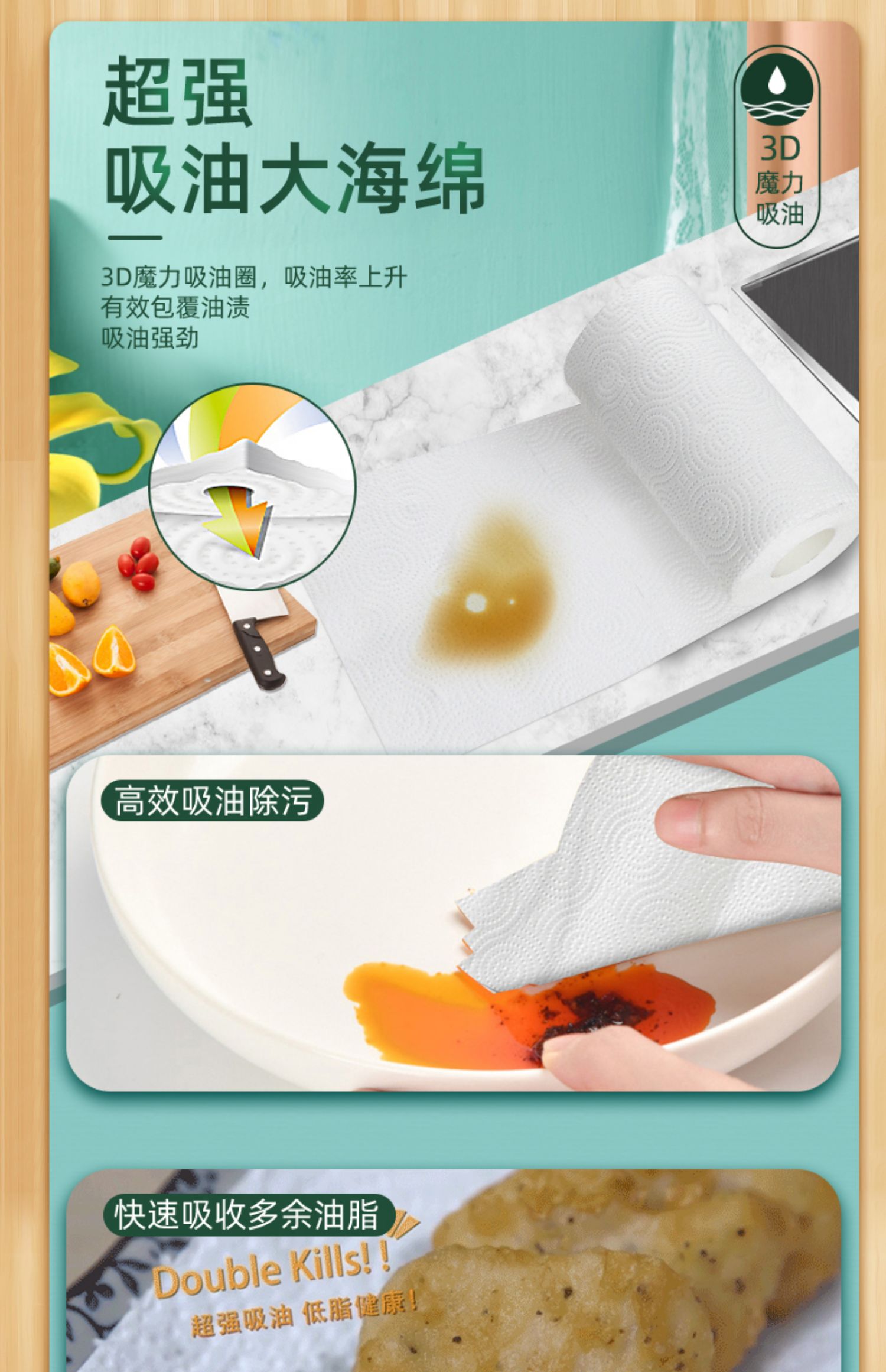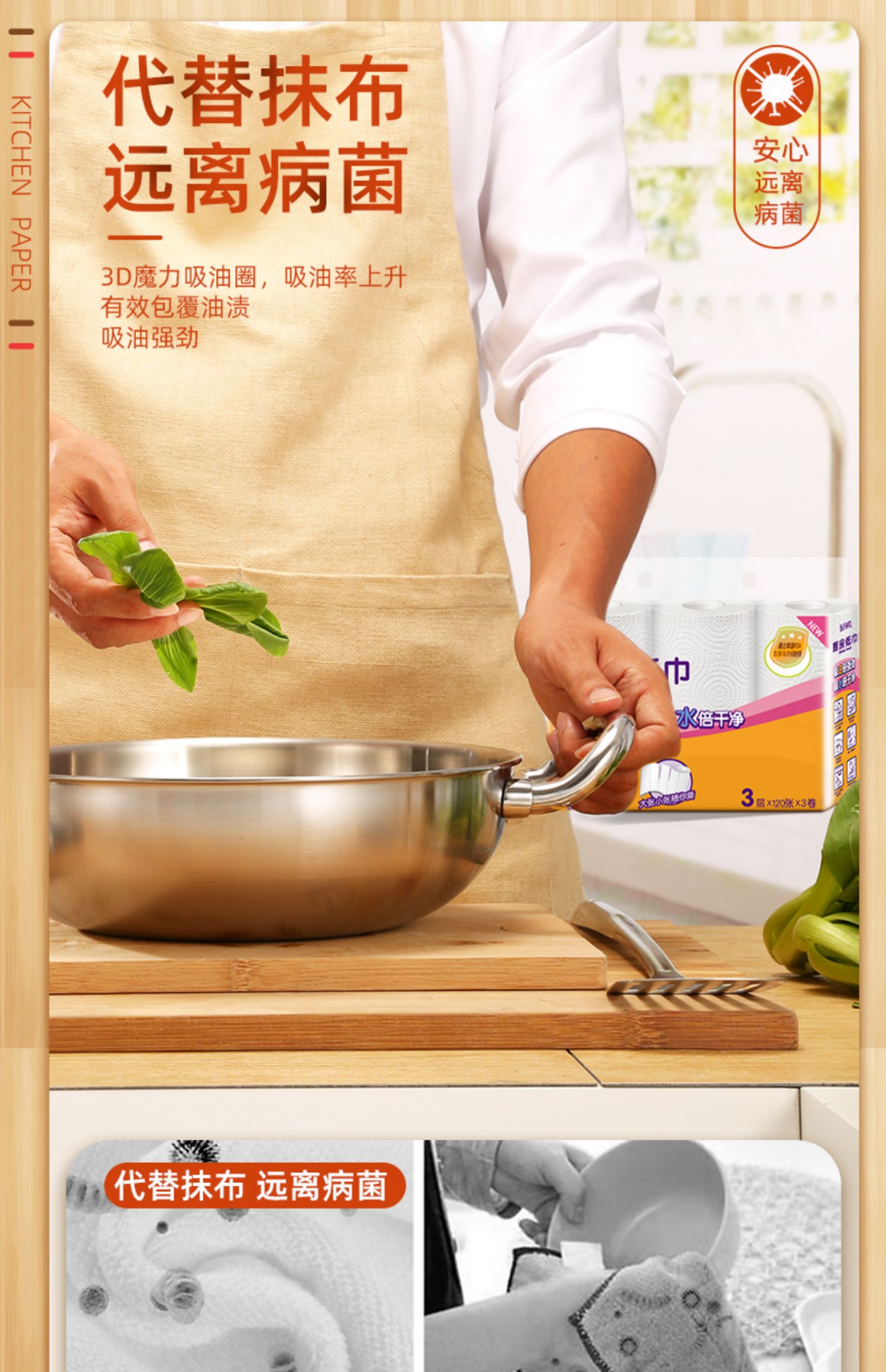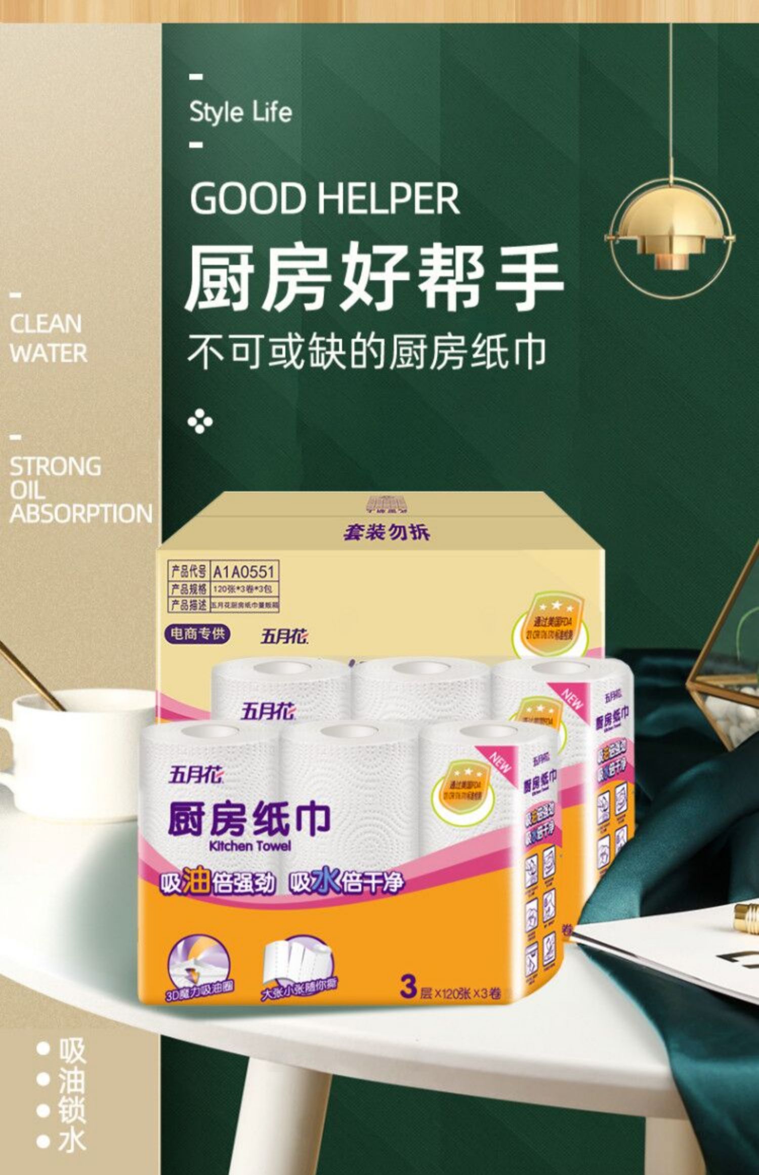 五月花厨房卷纸,3层加厚,120张/卷,共3卷,优质原生木浆,食品级吸油纸,高温消毒,不添加漂白剂,安全无毒,超强吸油吸水。干湿两用,代替抹布,家庭必备帮手~