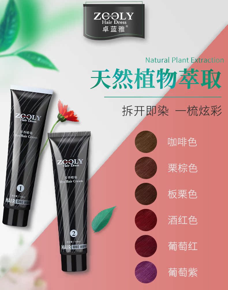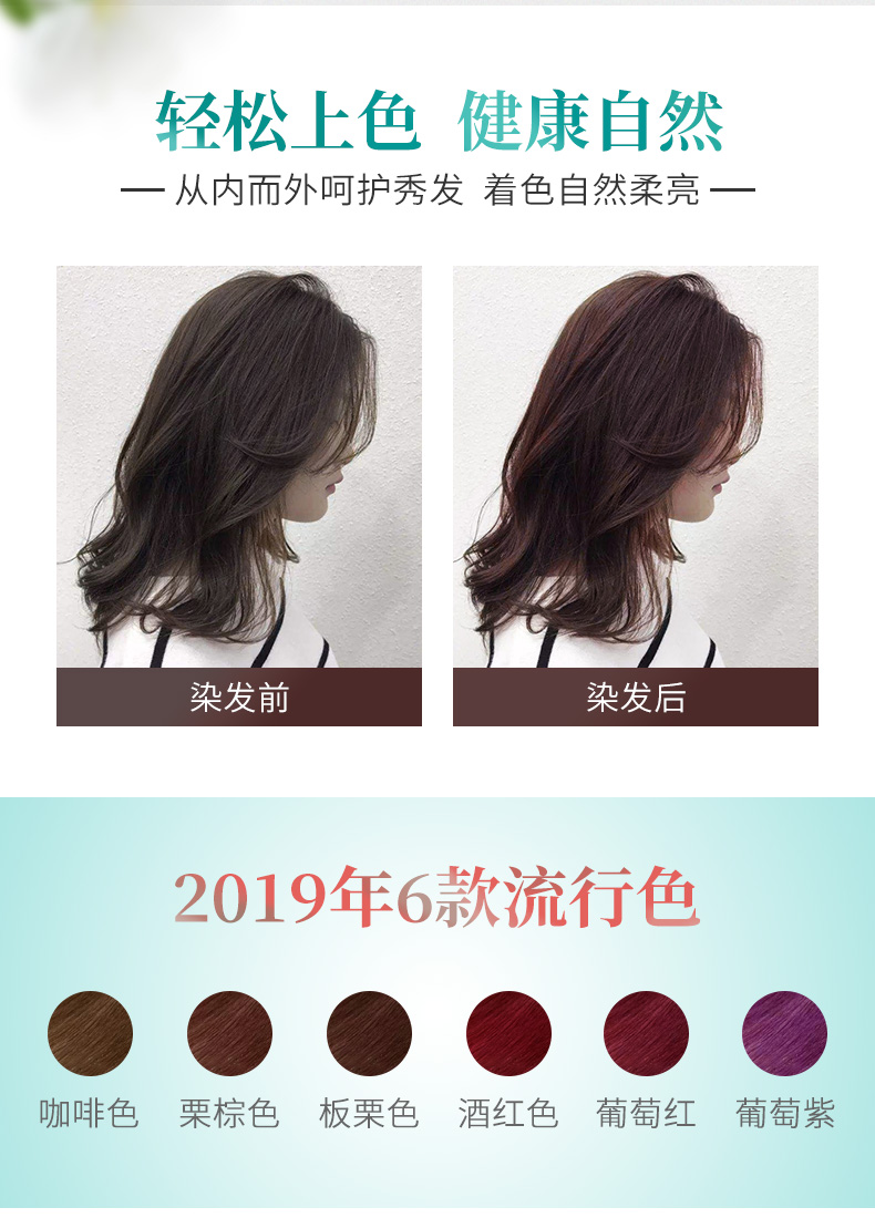 天然无刺激,健康盖发色,着色更久,葡萄紫、板栗色,送全套染发工具非常方便,让你在家就可以轻轻松松染发!