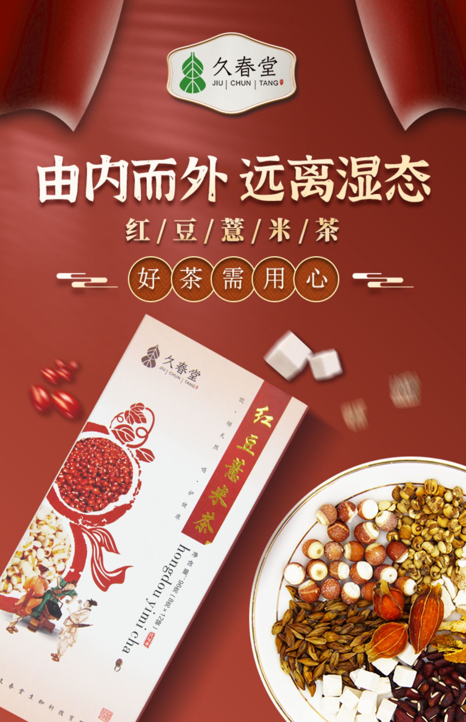 久春堂红豆薏米茶,精选多种谷物,独立小包装,天然食材,色泽金黄,无添加,驱寒排湿,养润之道,科学配比,口感醇厚,摆脱身体湿气、无湿一身轻,四季皆宜。祛湿减肥两不误~