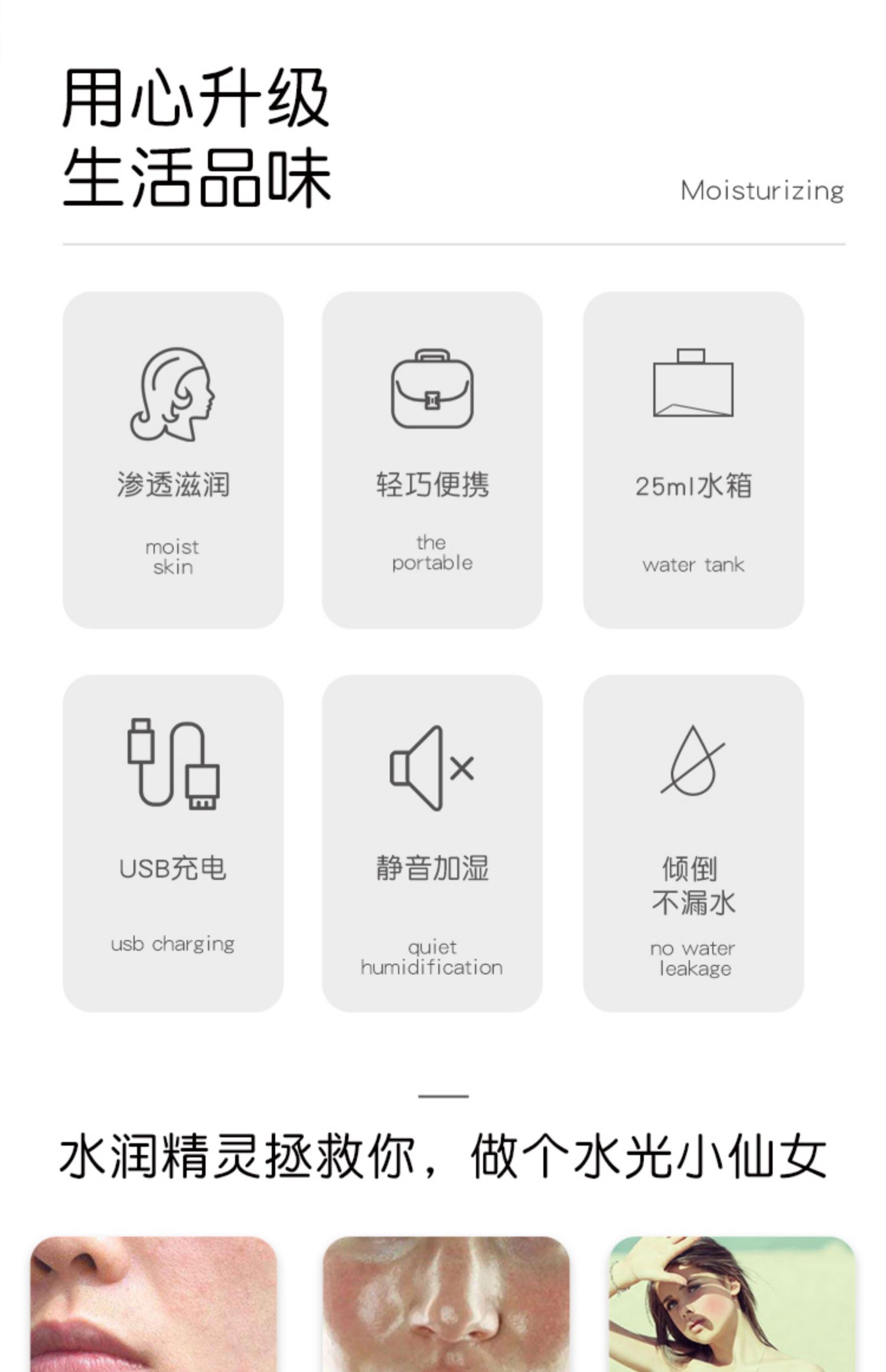 纳米喷雾补水仪,带USB手机充电功能,轻巧方便携带,藏在包包里的补水精灵,随时随地喷一喷,补水保湿还凉快哟!解决肌肤缺水的烦恼。【赠运费险】【七天无理由退换】
