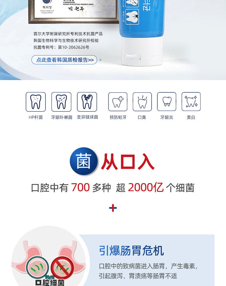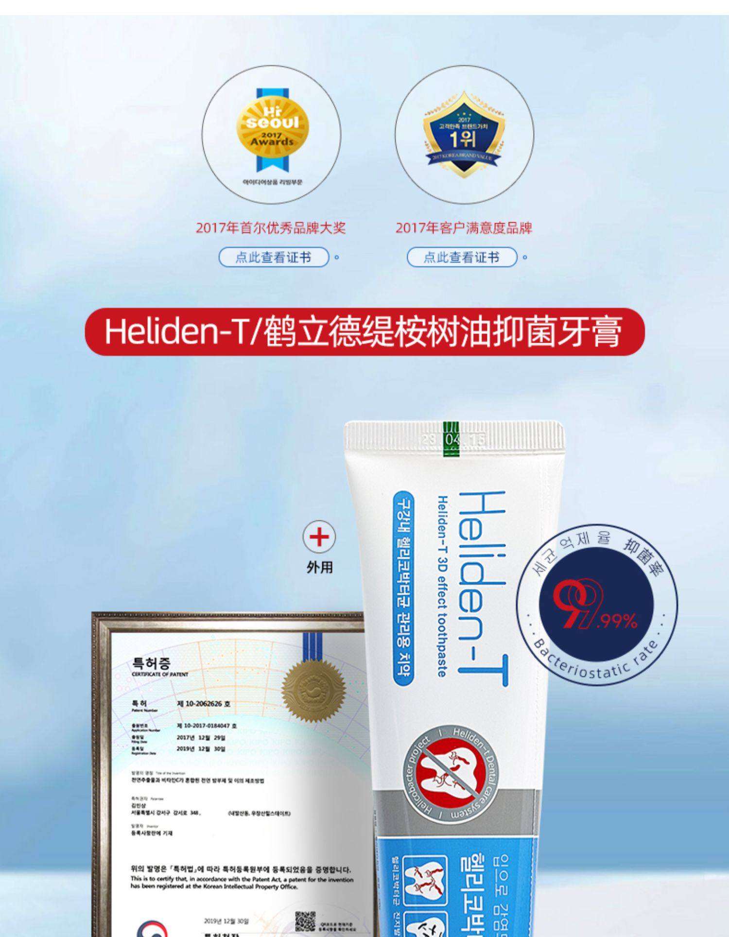 韩国抑菌专利helident桉树油牙膏添加珍贵无比“液体黄金”桉树精油,主要成分还有柠檬,维生素C,可有效杀死上呼吸道的致病菌,缓解疼痛,预防龋齿,刺激免疫系统【赠运费险】