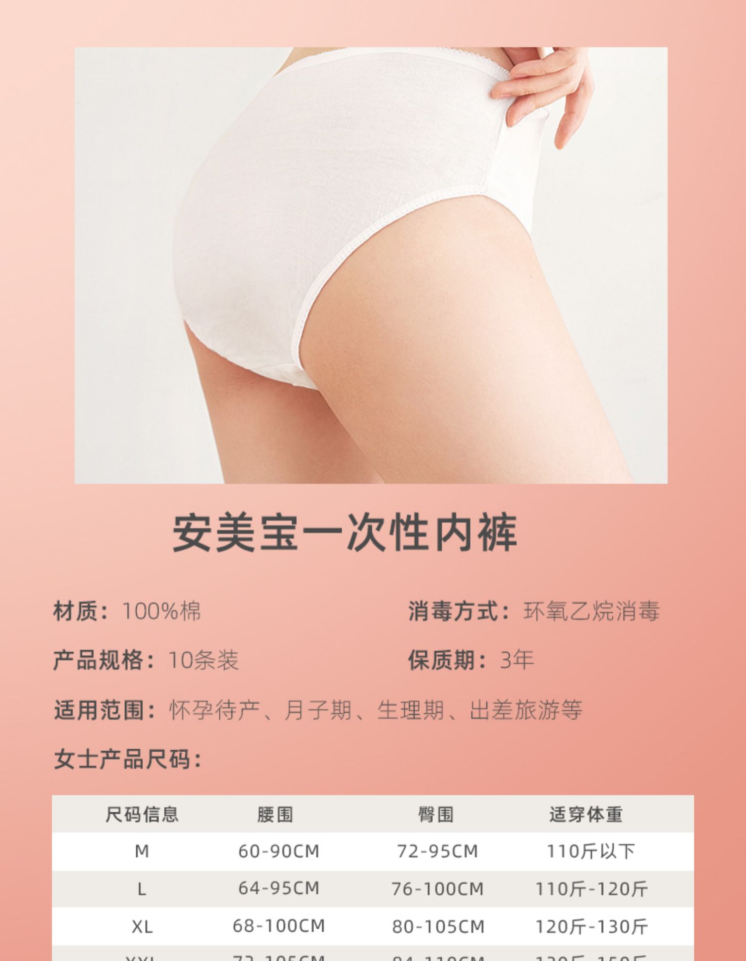 亲肤纯净全棉,EO灭菌,贴身穿超放心~无荧光剂,舒适透气,独立包装,适用于临产期,月子期,女性生理期,外出旅游等,男,女性人群。