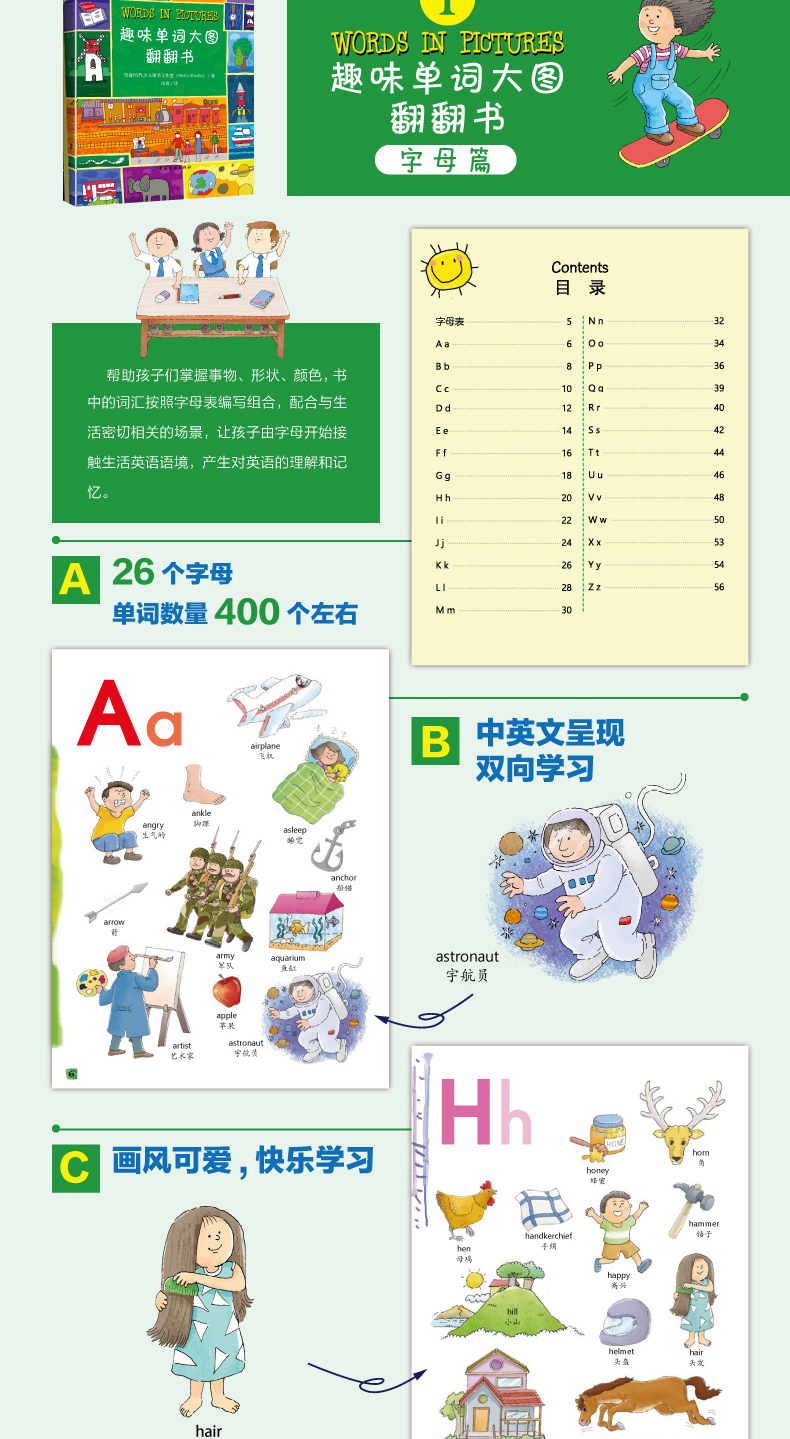 【彩绘大开本翻翻书】英语入门教材书,友好的“视觉加强”体验科学的分级学习方法,让英语单词更生动有趣,26个字母,单词数量400个左右,画风可爱,快乐学习。