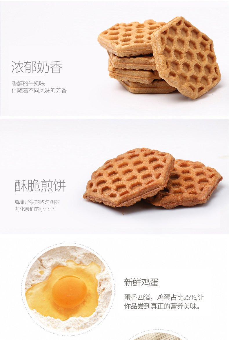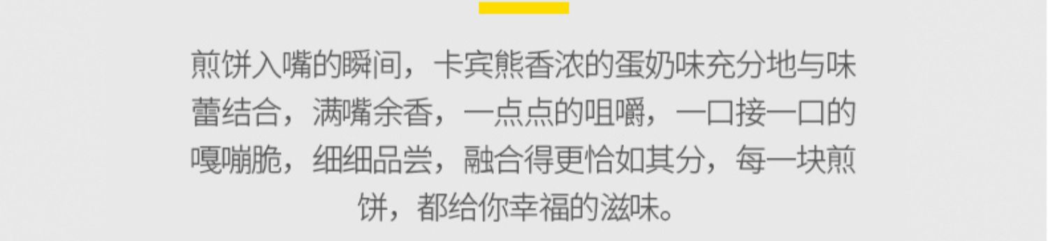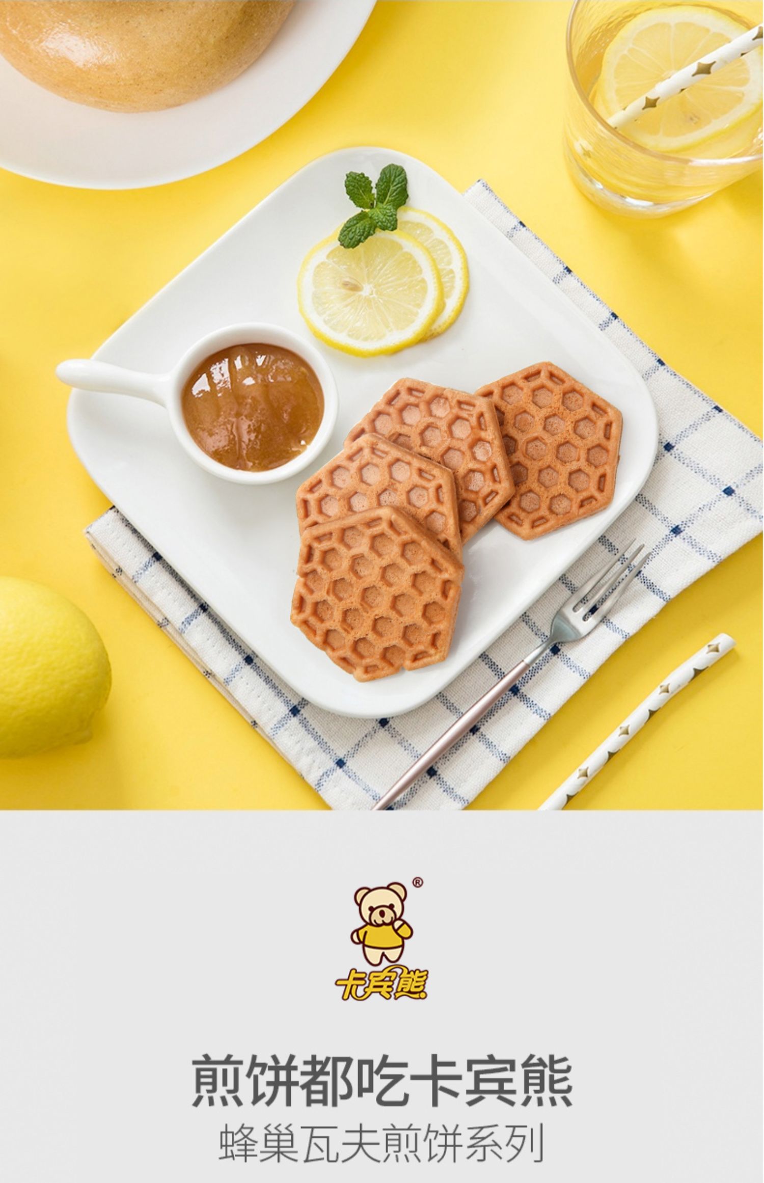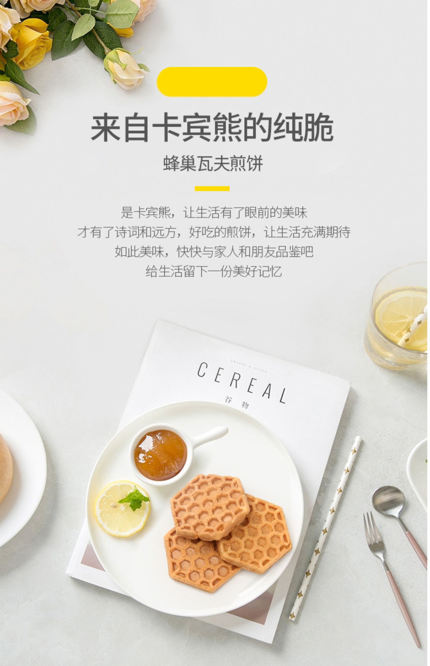 网红休闲小零食,卡宾熊蜂巢瓦夫煎饼,煎饼入嘴的瞬间就感受到香浓的奶味,一点点的咀嚼细细品尝,两种口味可选~每一块煎饼都给你幸福的滋味!【赠运费险】