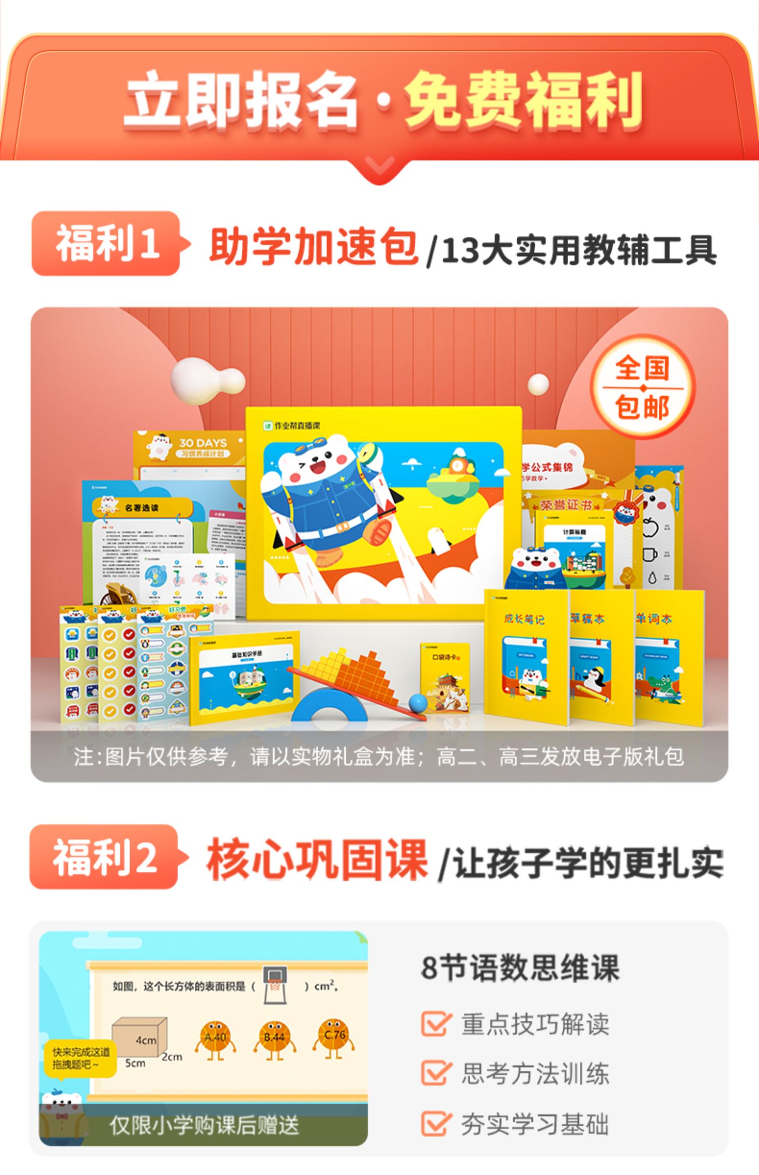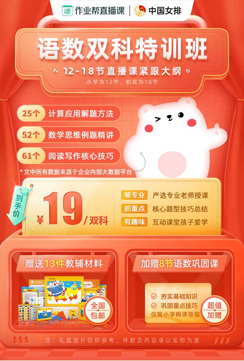 【赠送15件教辅材料】作业帮直播课19元语数双科,18节课紧跟提纲,1对1课后答题,双师教学为每个孩子学习负责,突破重点,衔接课内思维,孩子收获多多,送教辅礼盒15件。