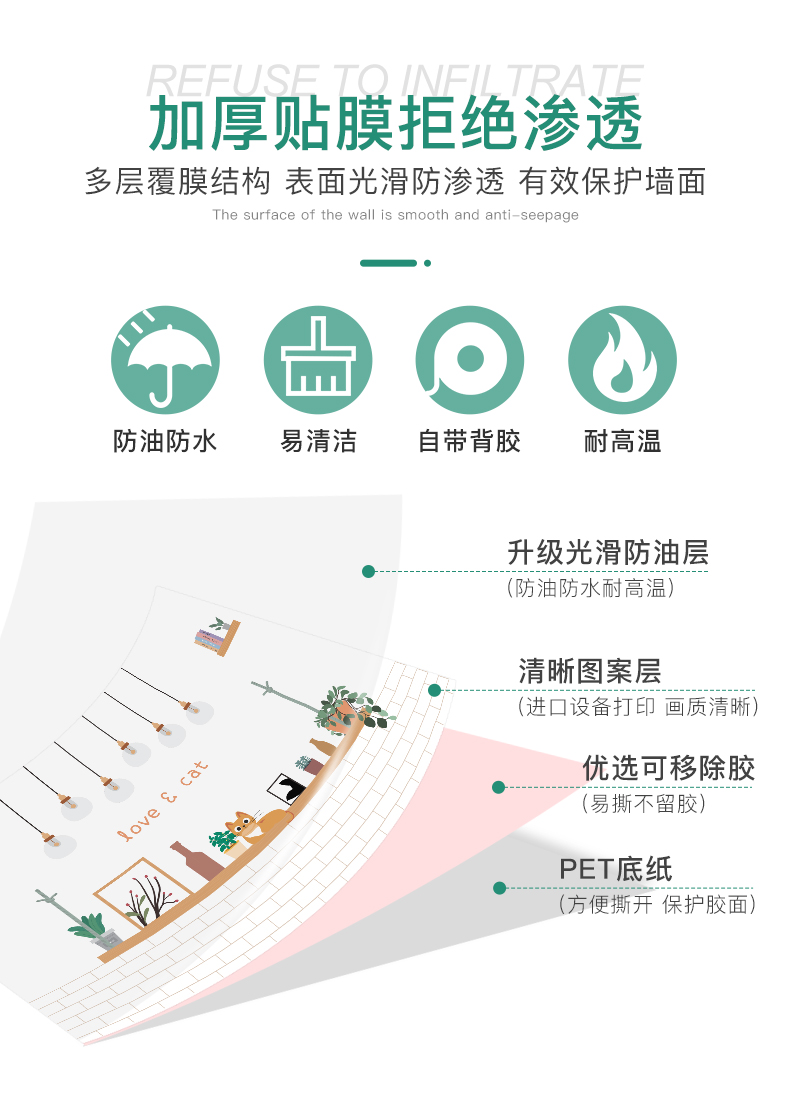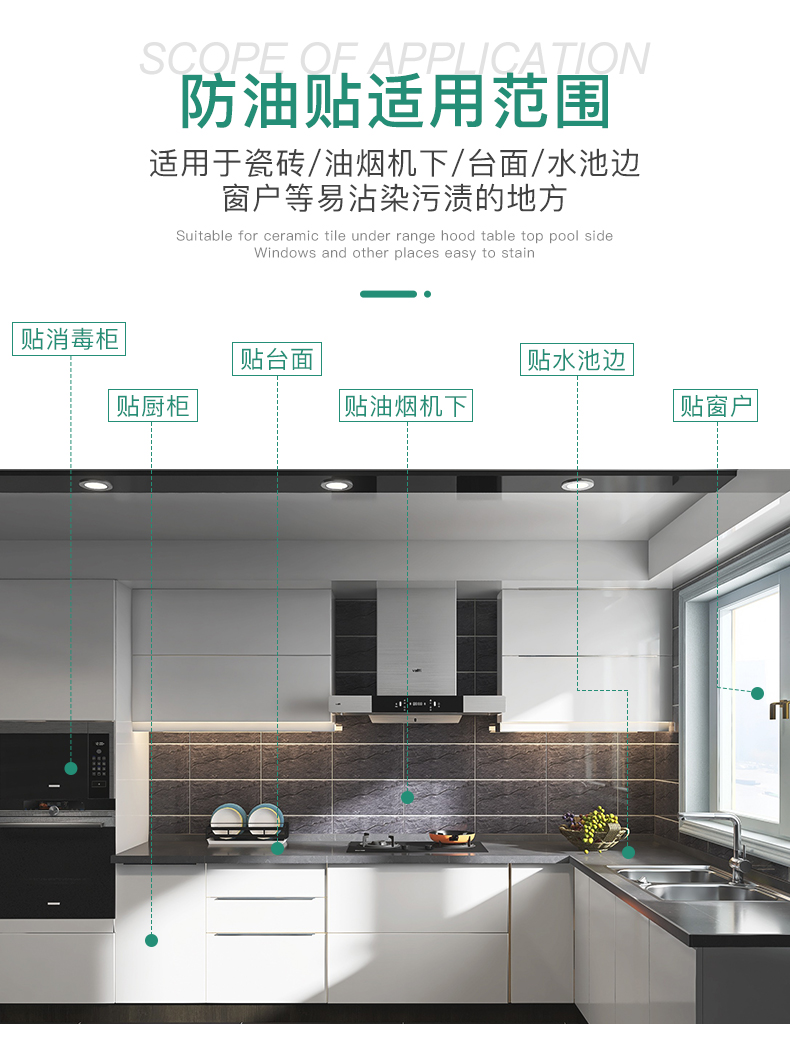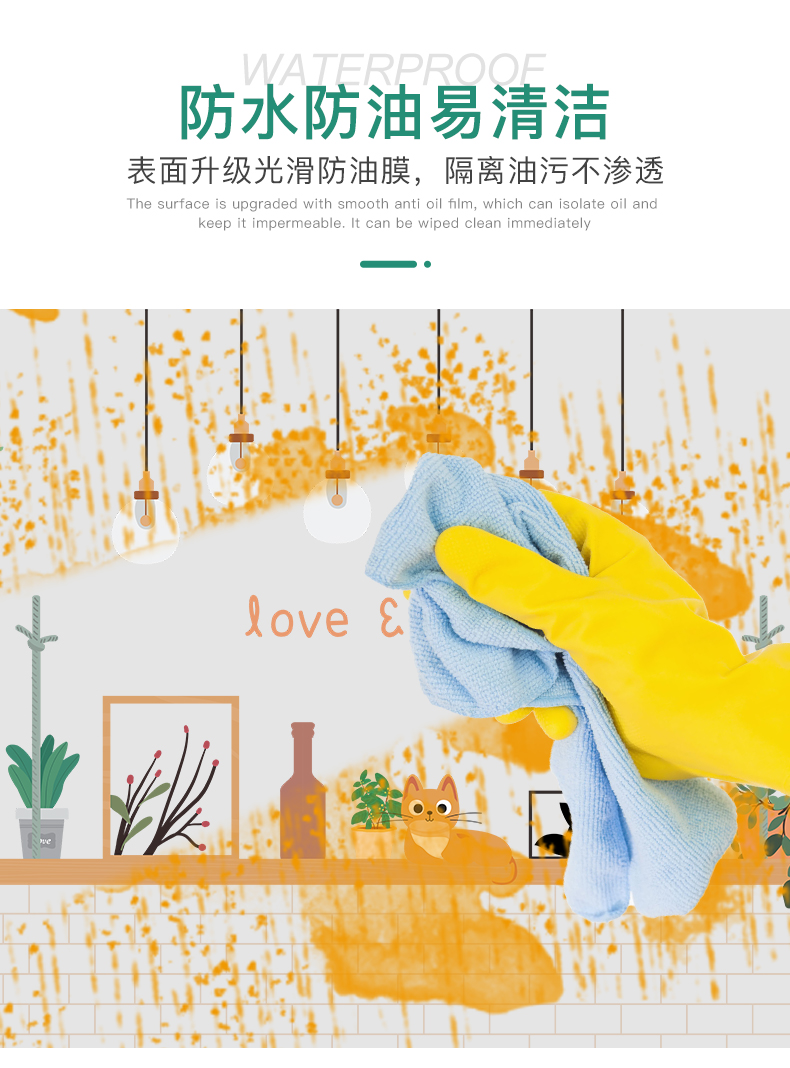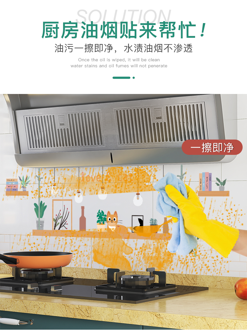 全新升级防油污贴纸,优选环保材质,不褪色,自由裁剪,耐高温,防污防潮,易清理,全新纹理,粘贴更美观,耐用,易贴易撕!让TA来给你一个靓丽的厨房!