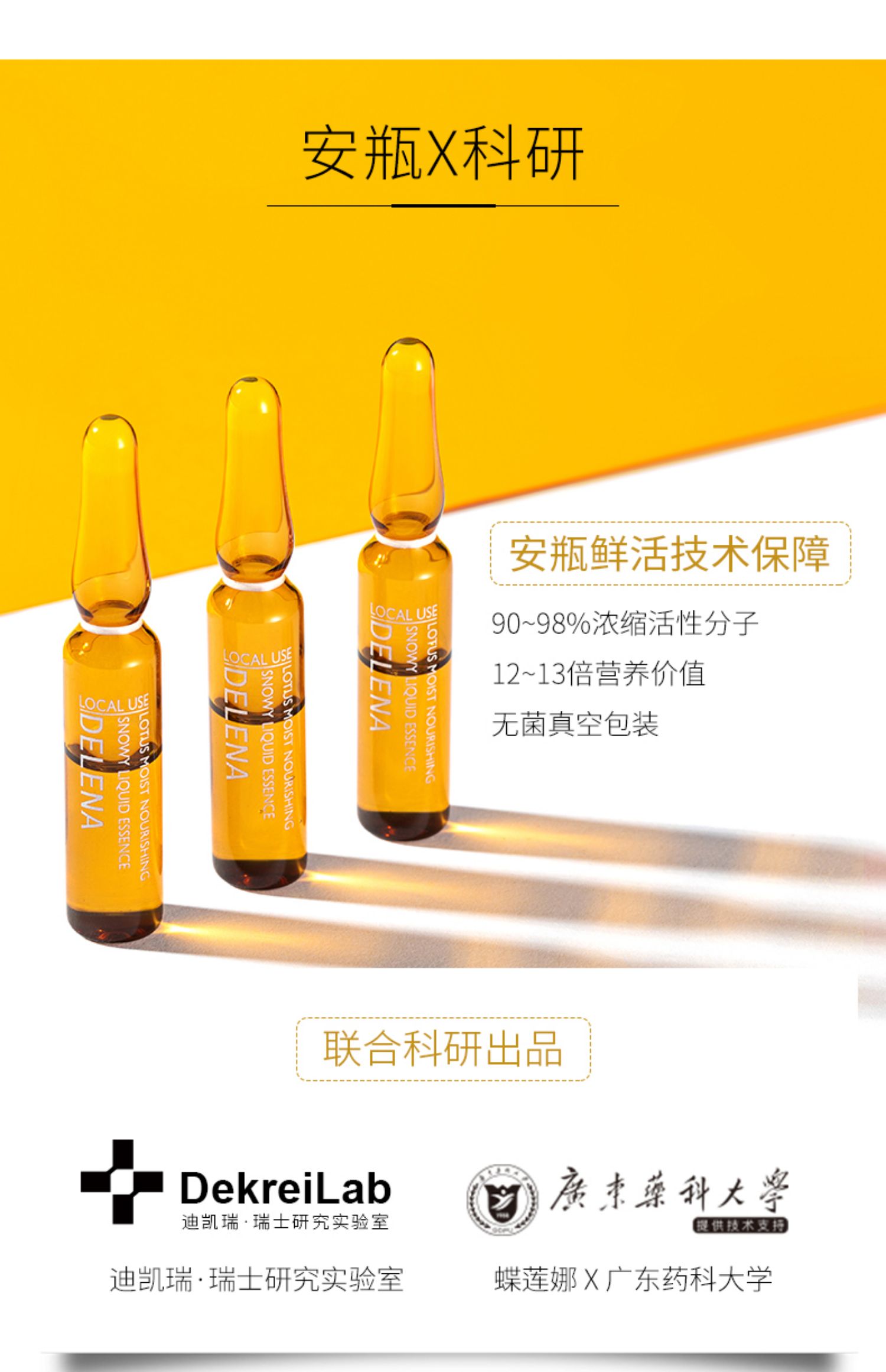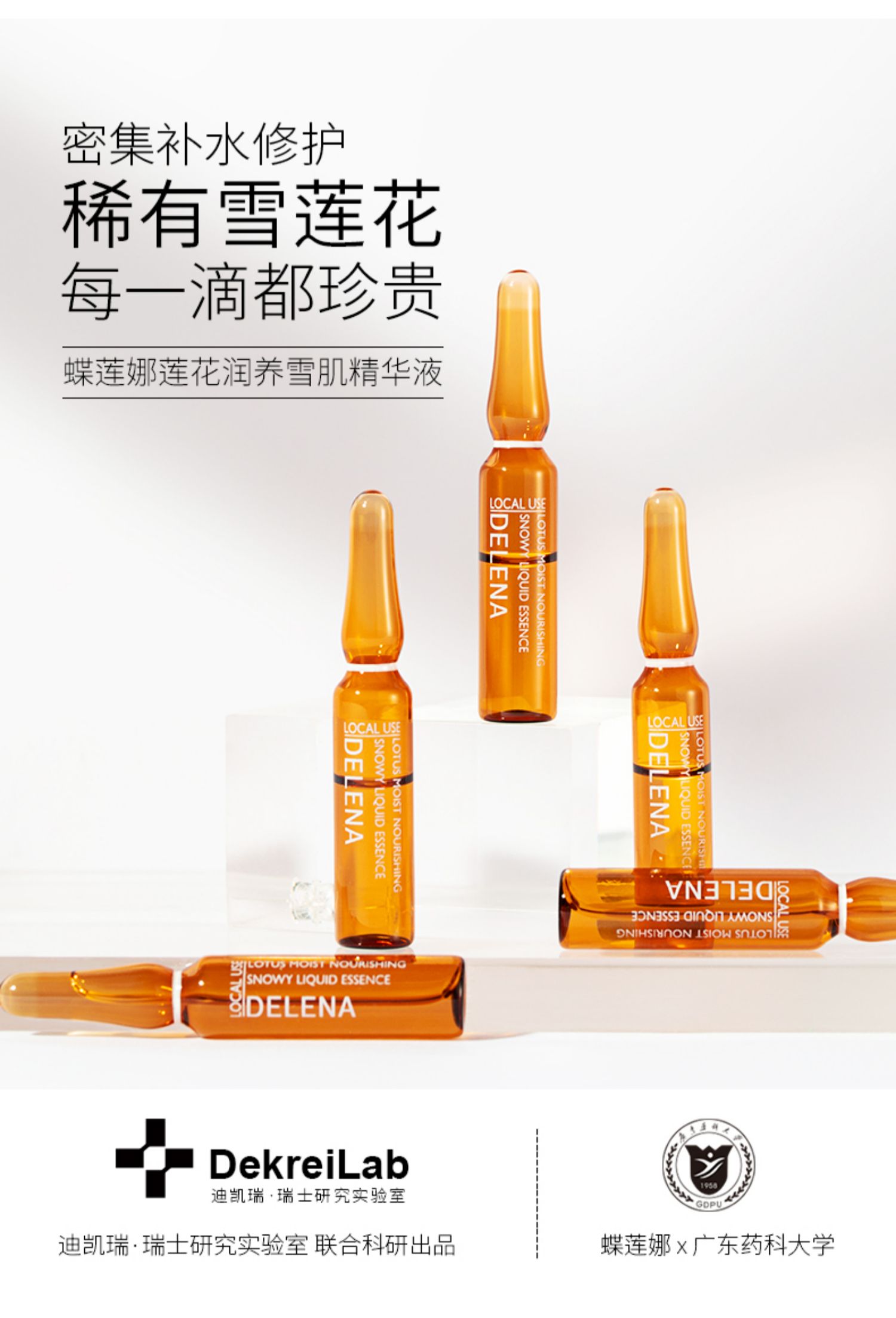 蝶莲娜雪莲花安瓶精华液,补水保湿,深层修复受损肌肤,淡化皱纹,温和滋养,收细毛孔,加速新陈代谢,减少黑色素,改善肌肤触感柔软滋润,焕发青春光彩。每一滴都珍贵。