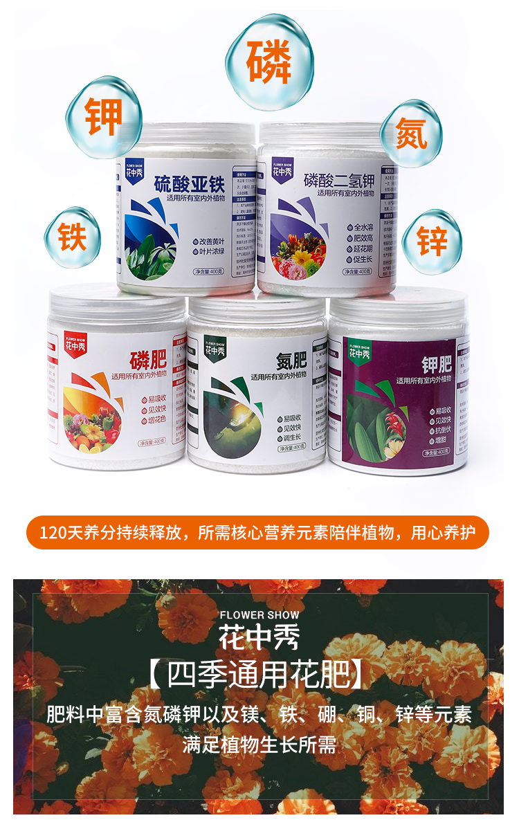 【花中秀】四季通用花肥。肥料中富含氮磷钾多种元素。控制营养流失,肥效持久,结构紧密,养分均匀释放。科学施肥,植物更健康!