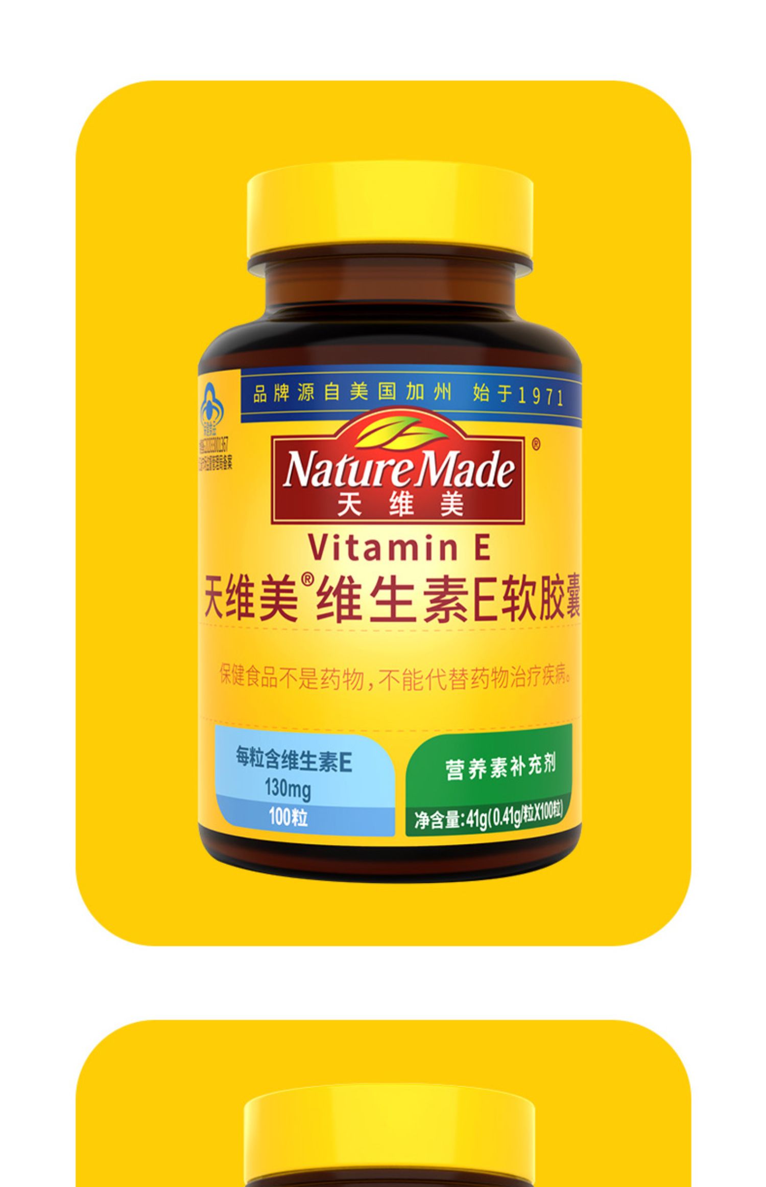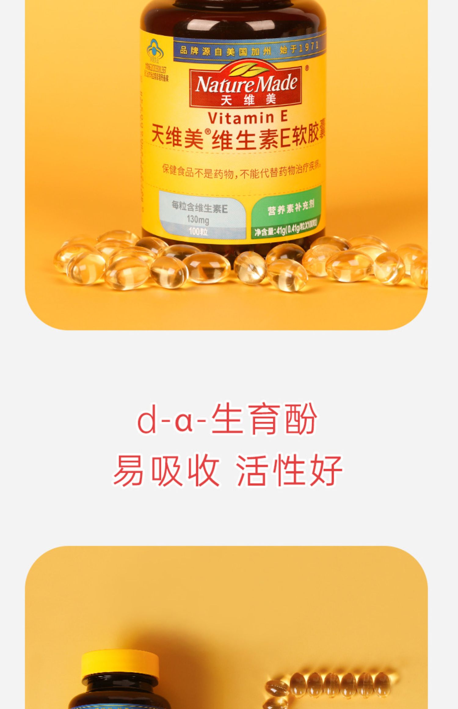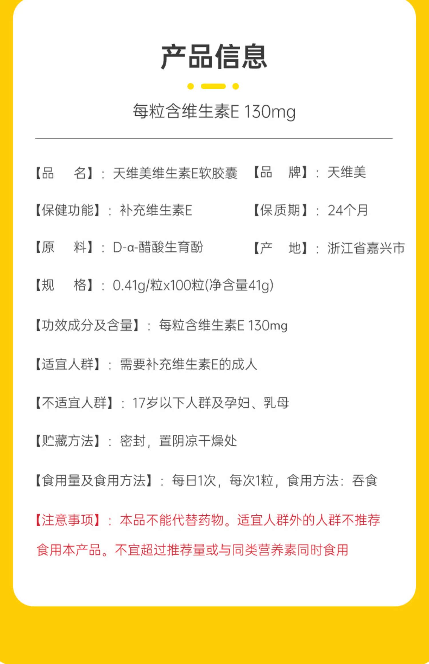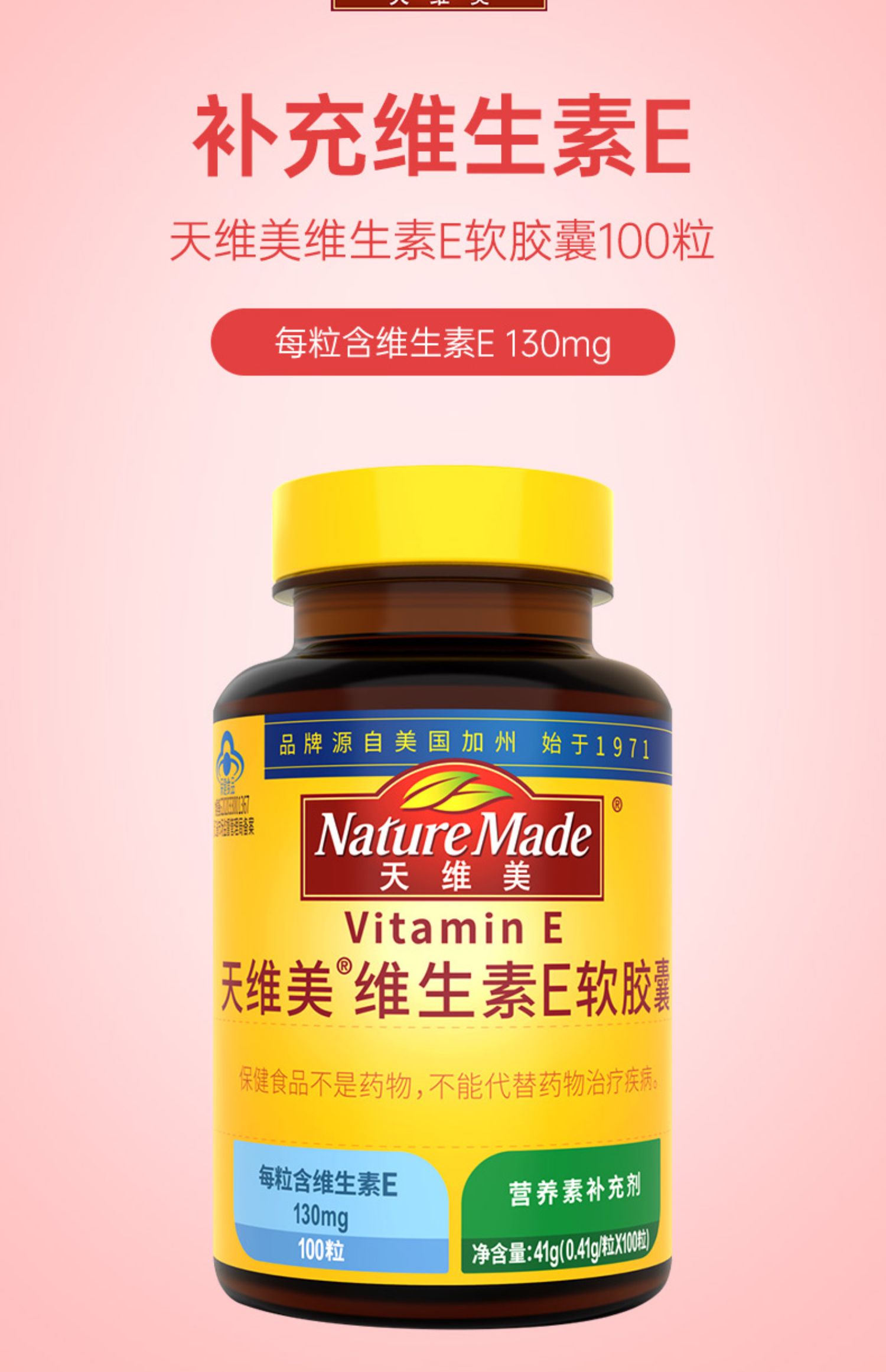 【满2件75折】100粒只要79,天然维E,生育酚含量高达130MG/粒,更易吸收,每天1粒,美容养颜抗衰老,内服外敷,滋养肌肤。唤醒肌肤红润光泽,还可外敷做面膜,有蓝帽子认证,放心屯!【赠运费险】