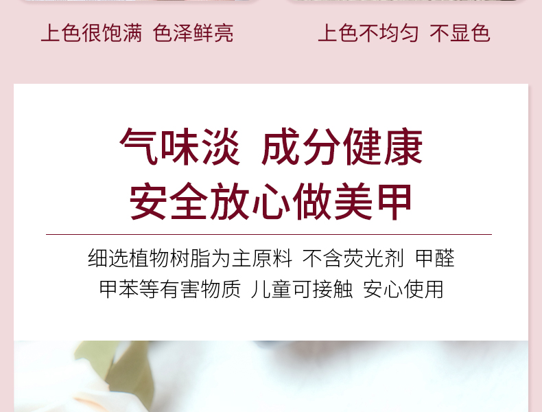 植物树脂为原料,不含荧光剂,甲醛等有害物质,一笔上色,厚薄均匀,颜色鲜亮饱满,安全放心,多种颜色可选,美甲店专用。操作简易效果出众,小仙女必备。