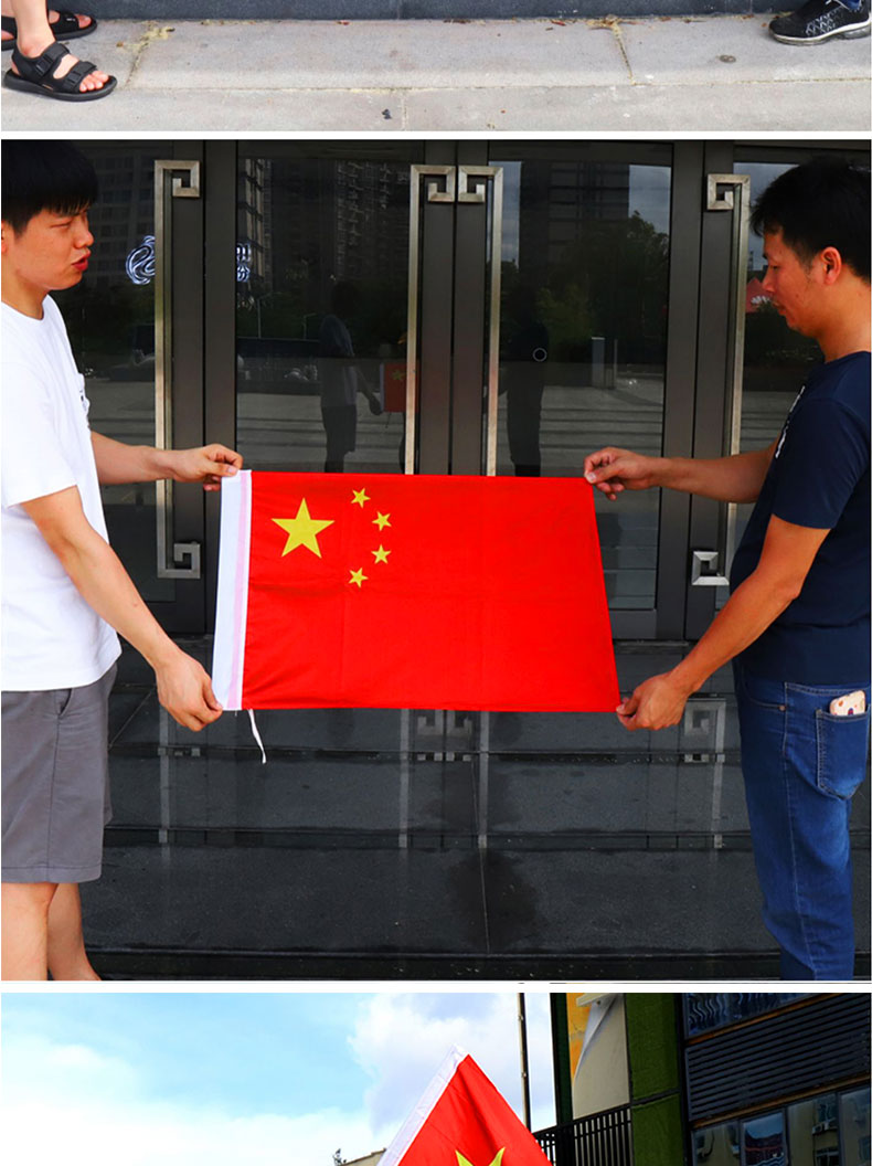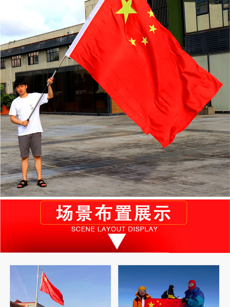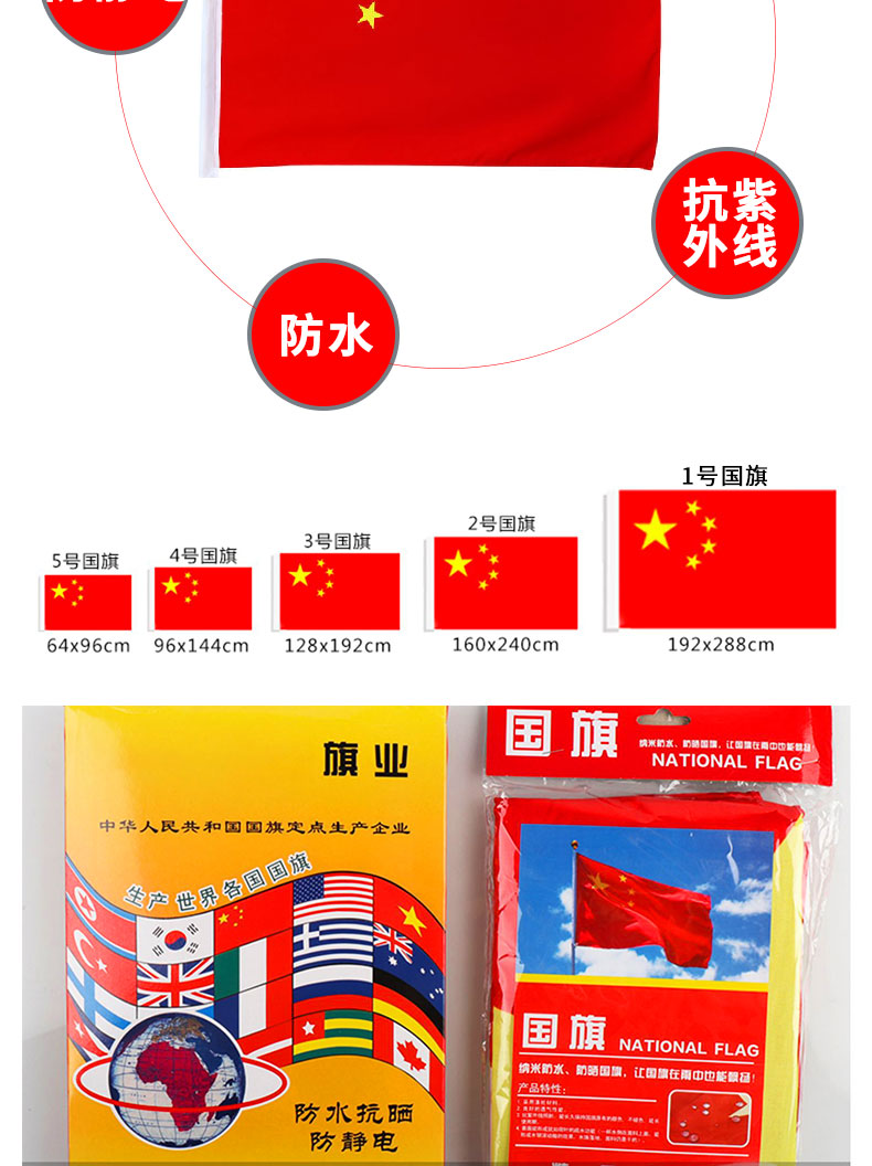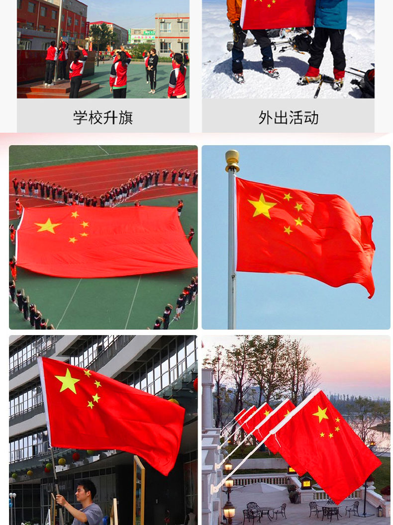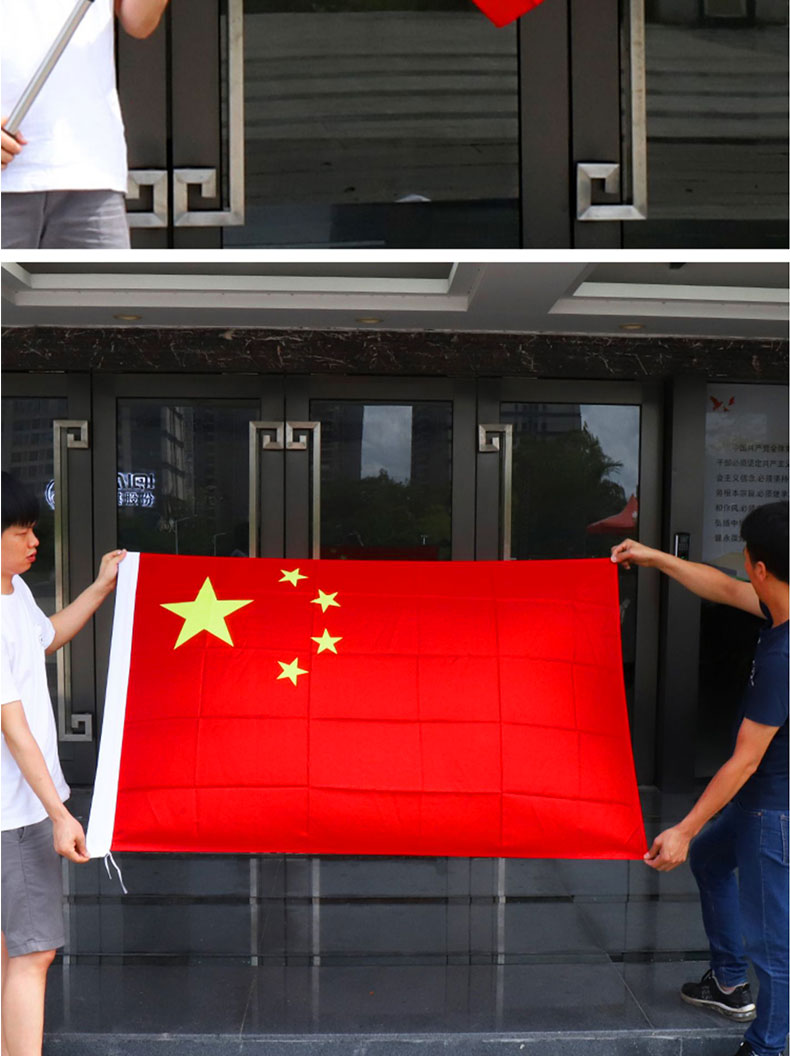 爱国无处不在~快囤6号五星红旗!采用防水抗晒,防静电材质,水洗不掉色!双车线缝制,针眼超细腻!颜色鲜艳又靓丽!让国旗随风飘扬!