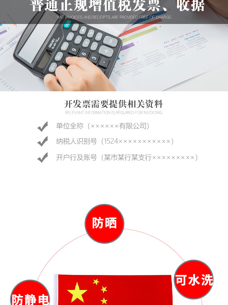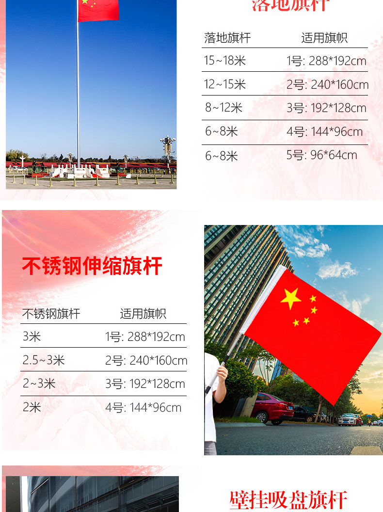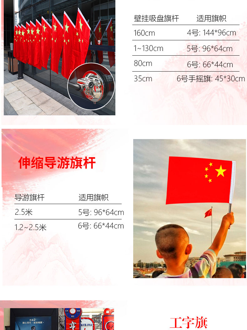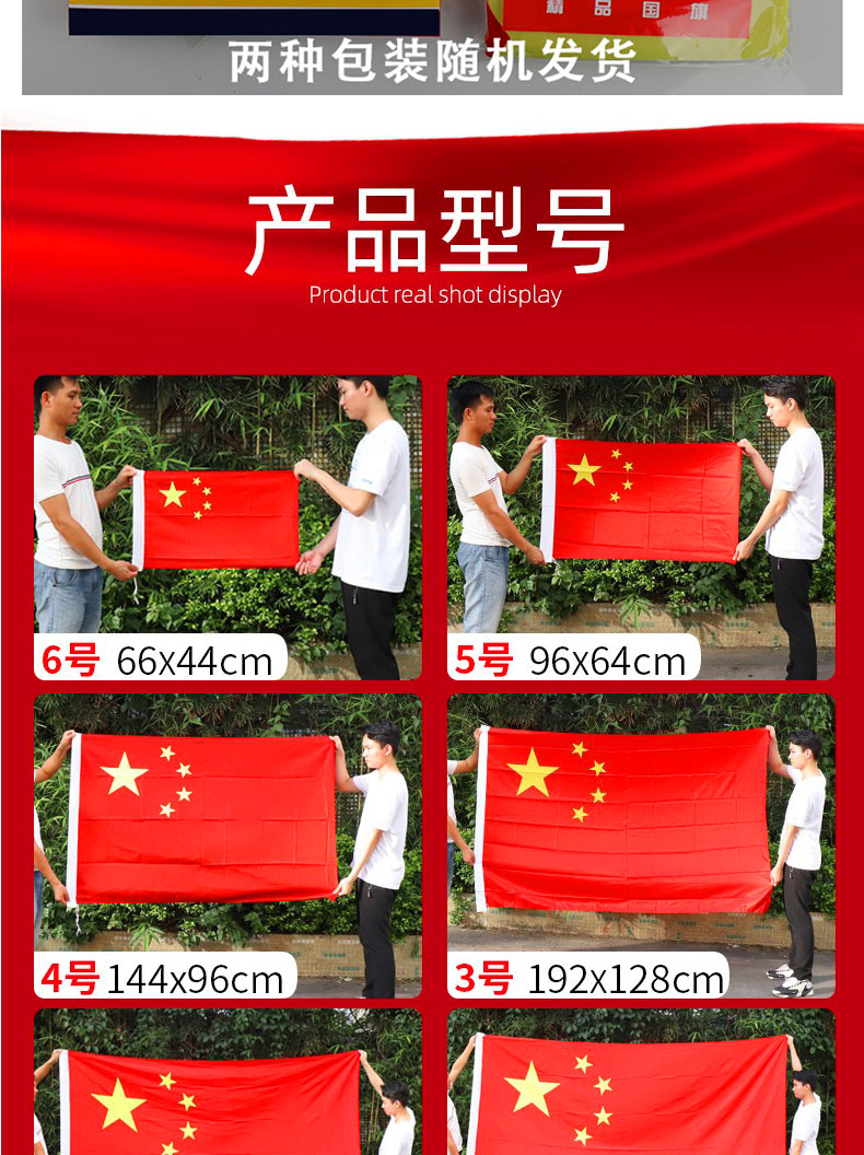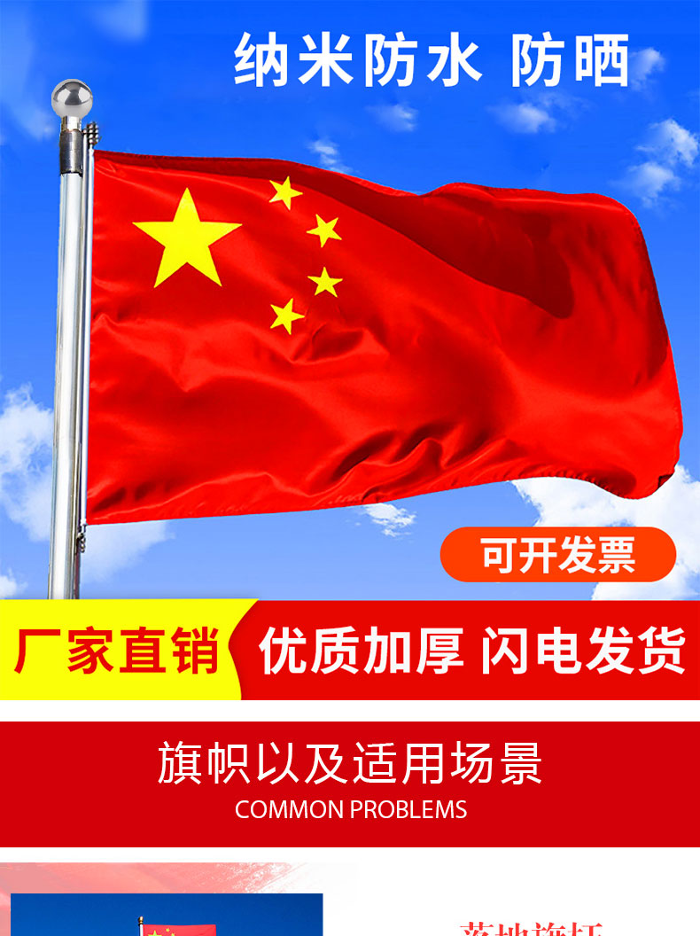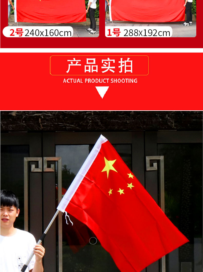爱国无处不在~快囤6号五星红旗!采用防水抗晒,防静电材质,水洗不掉色!双车线缝制,针眼超细腻!颜色鲜艳又靓丽!让国旗随风飘扬!