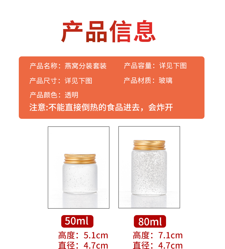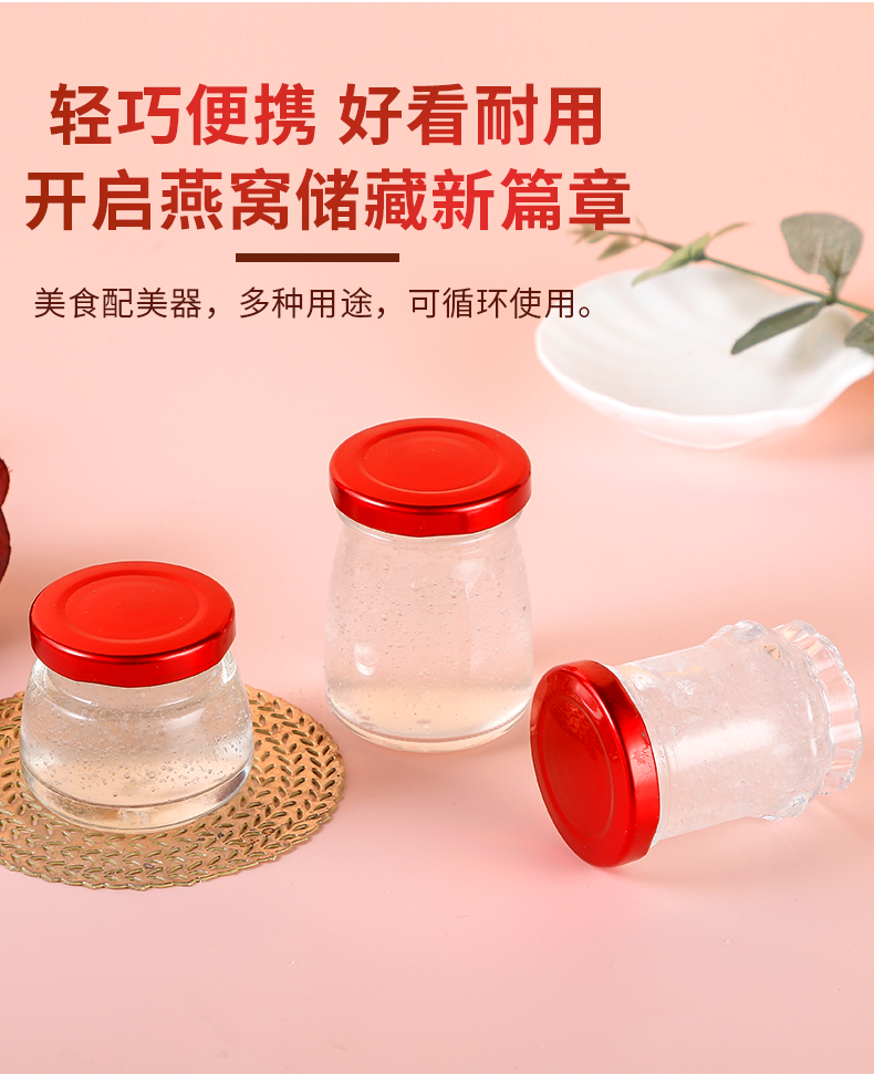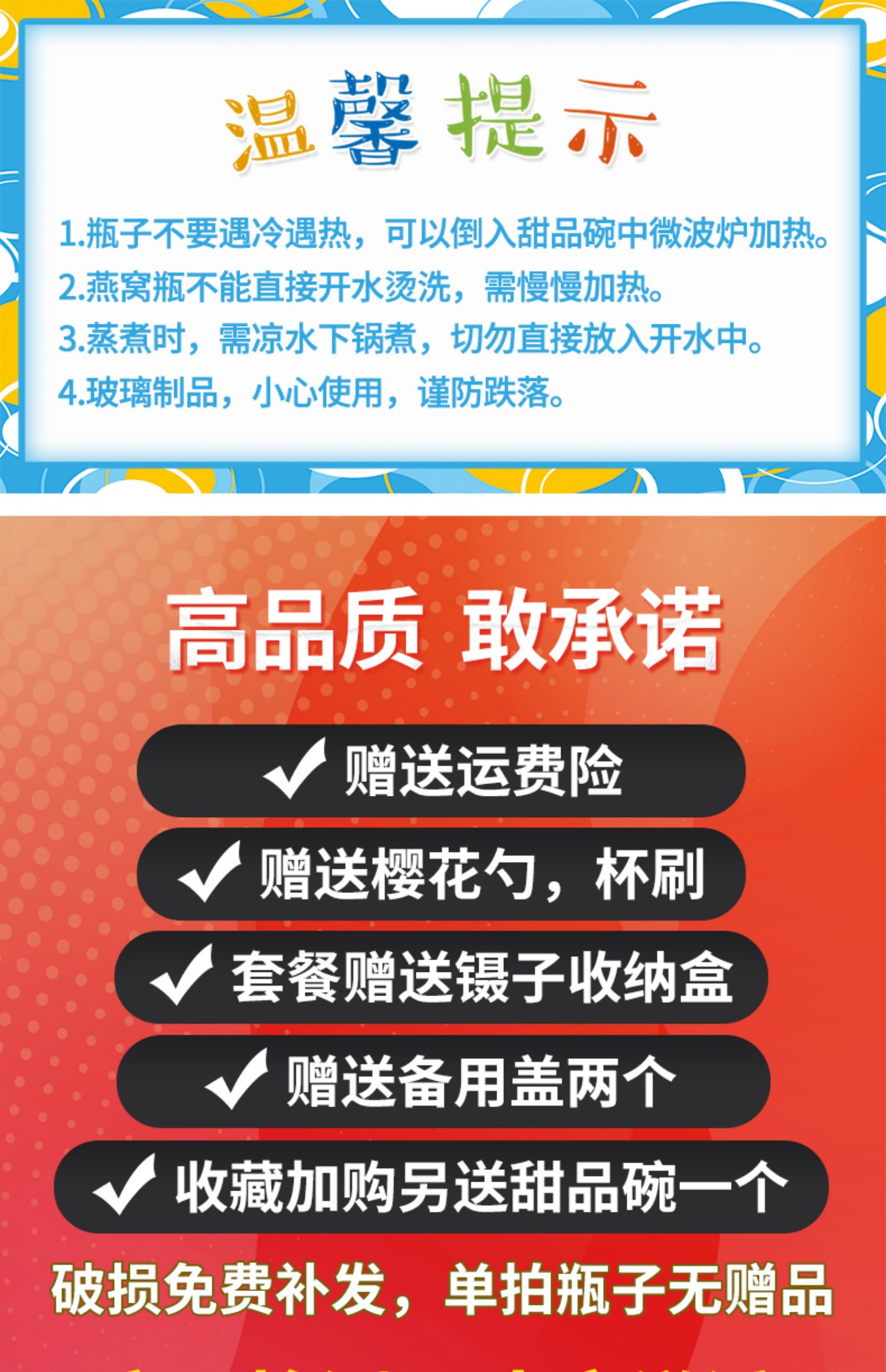 两只玻璃瓶燕窝分瓶装,多种规格,加厚玻璃,耐高温。密封性能好,挑毛存储,一套搞定。存储时在也不用担心有燕毛的烦恼了。密封存储,锁住每一寸新鲜。【赠运费险】