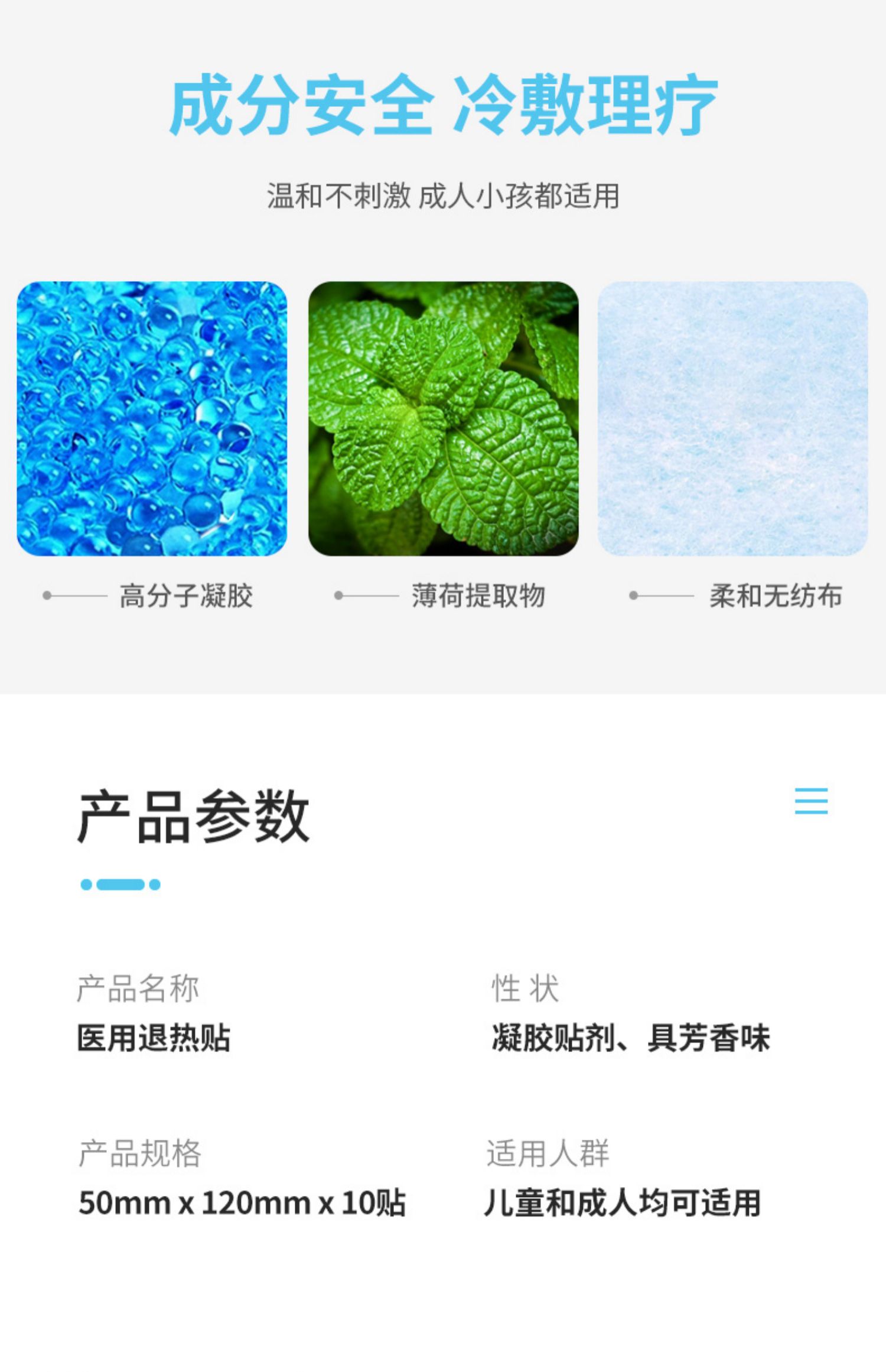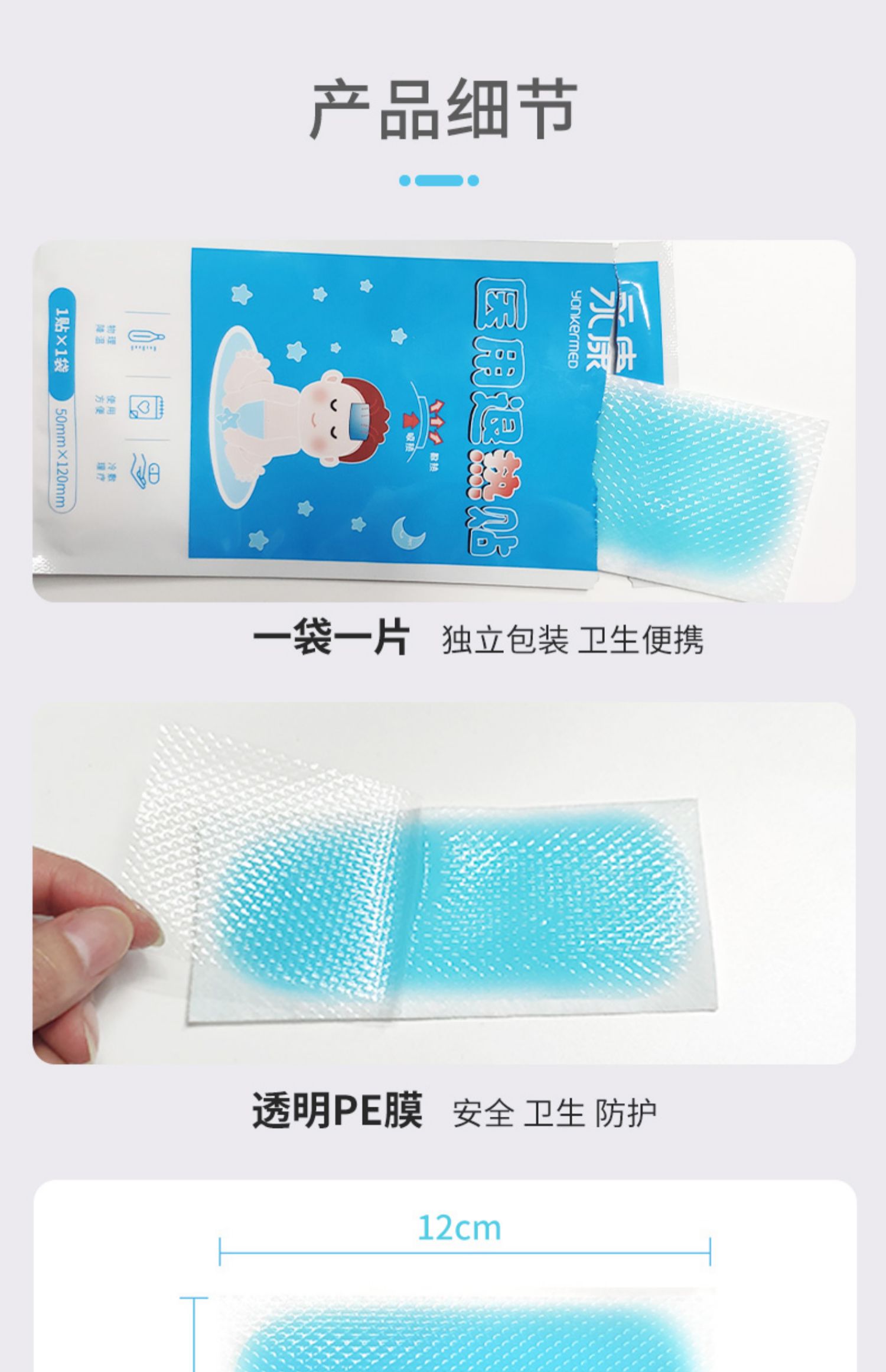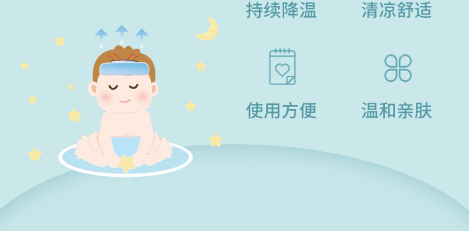 天然植物成分,搭配无纺布材质,成分安全健康,温和不刺激,舒适亲肤,清爽降温~独立包装设计,一袋一片,干净卫生,超大PE膜接触面,安全防护,快速降温,守护儿童健康!