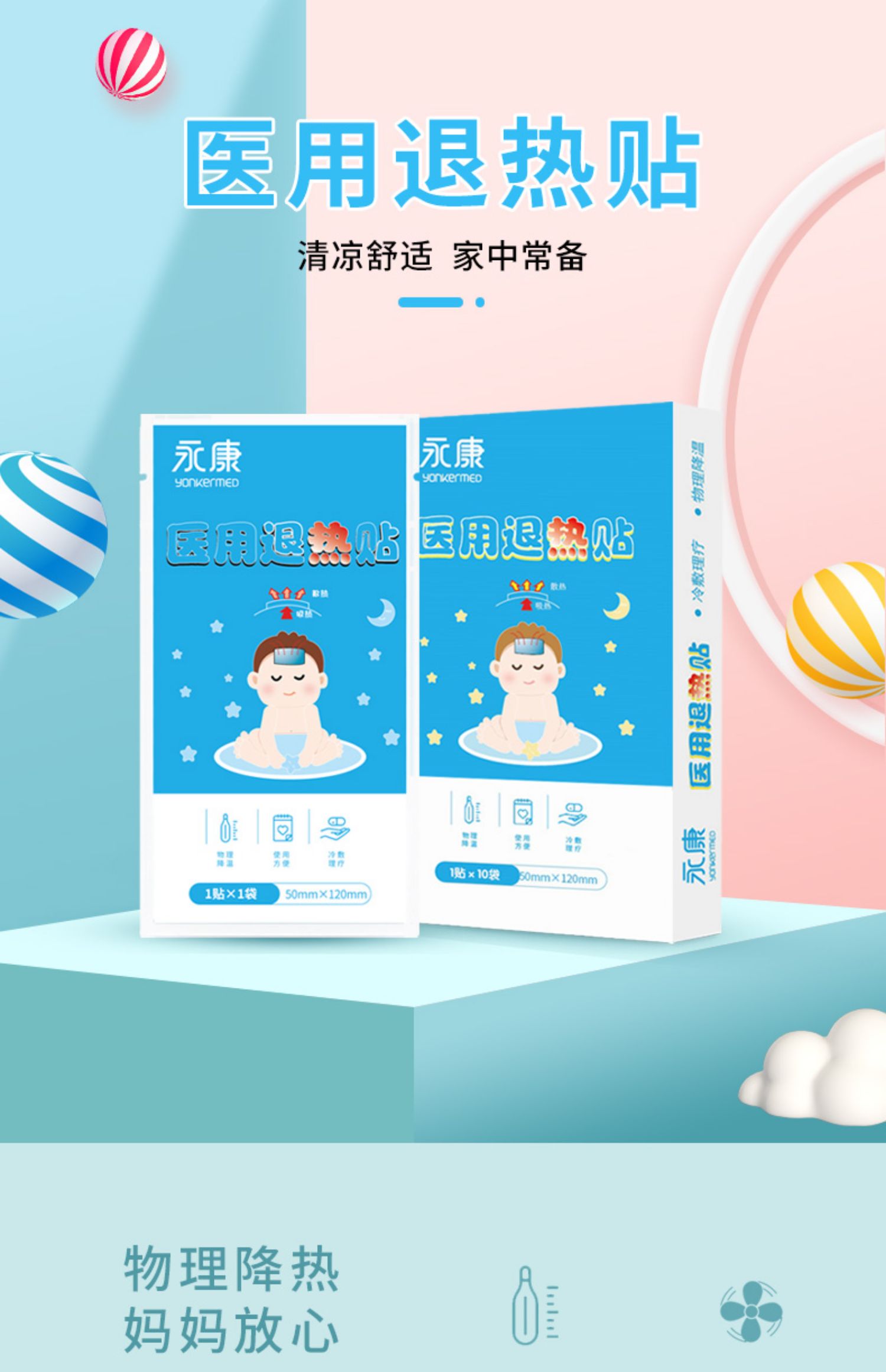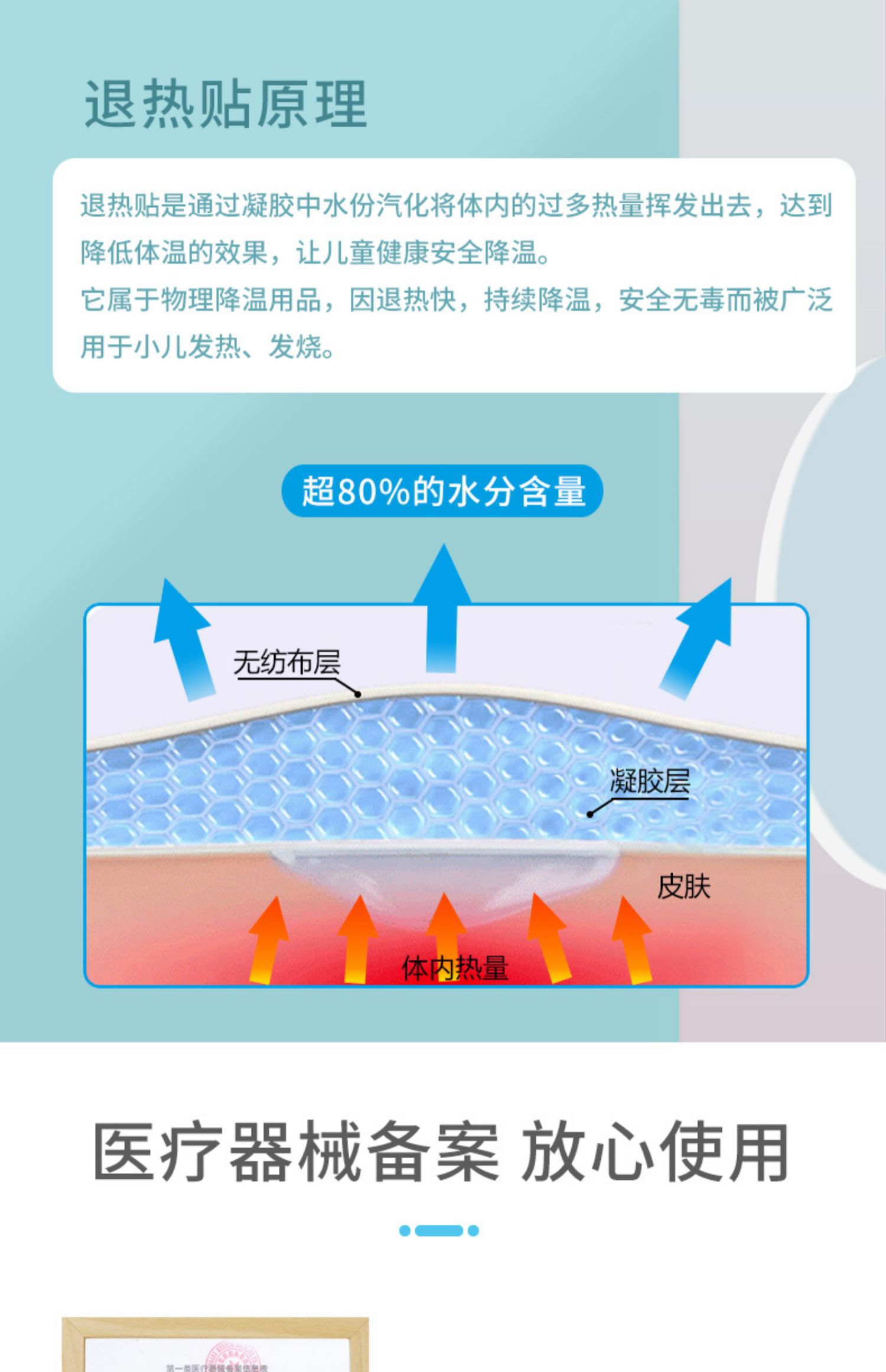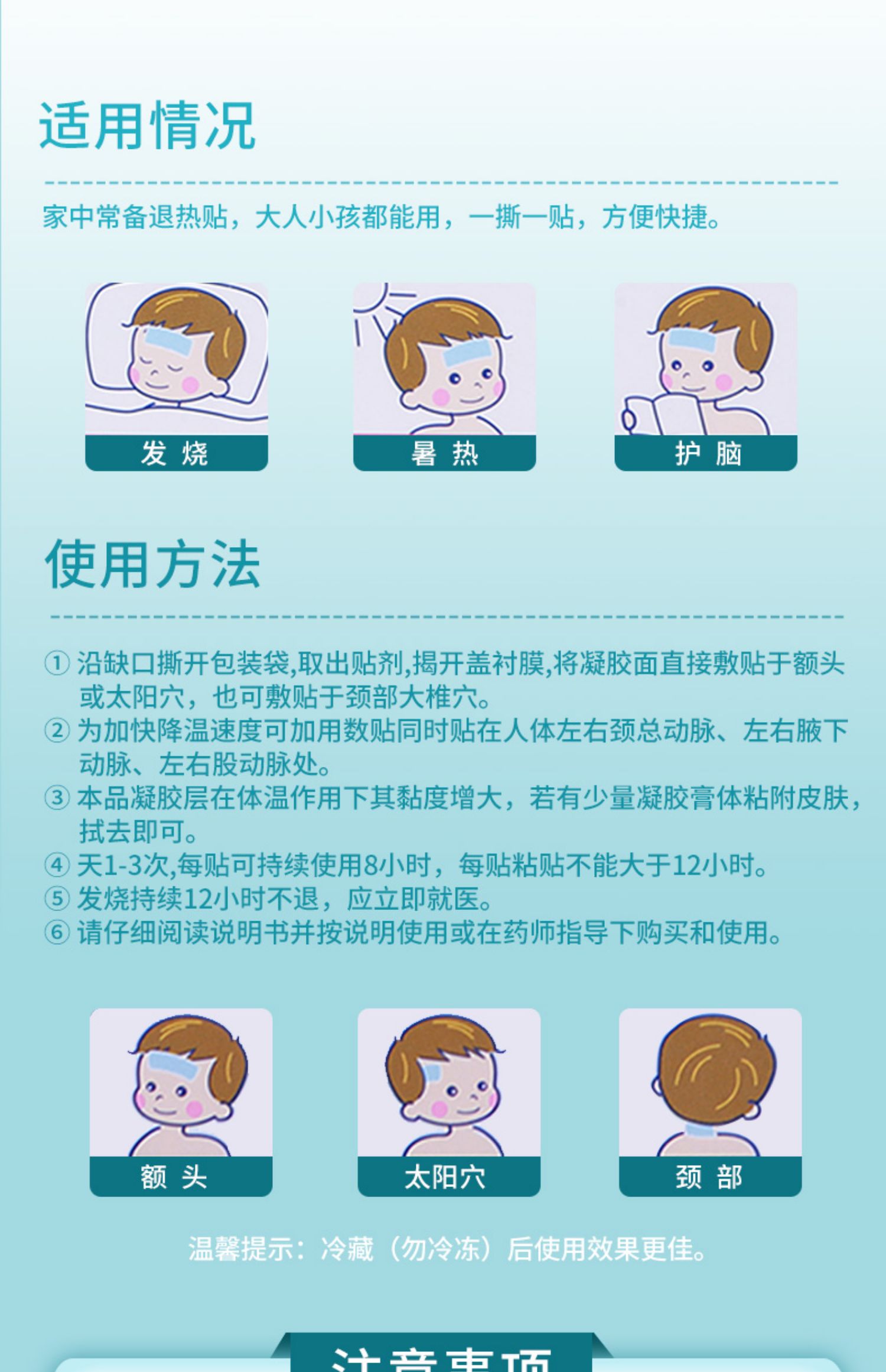 天然植物成分,搭配无纺布材质,成分安全健康,温和不刺激,舒适亲肤,清爽降温~独立包装设计,一袋一片,干净卫生,超大PE膜接触面,安全防护,快速降温,守护儿童健康!