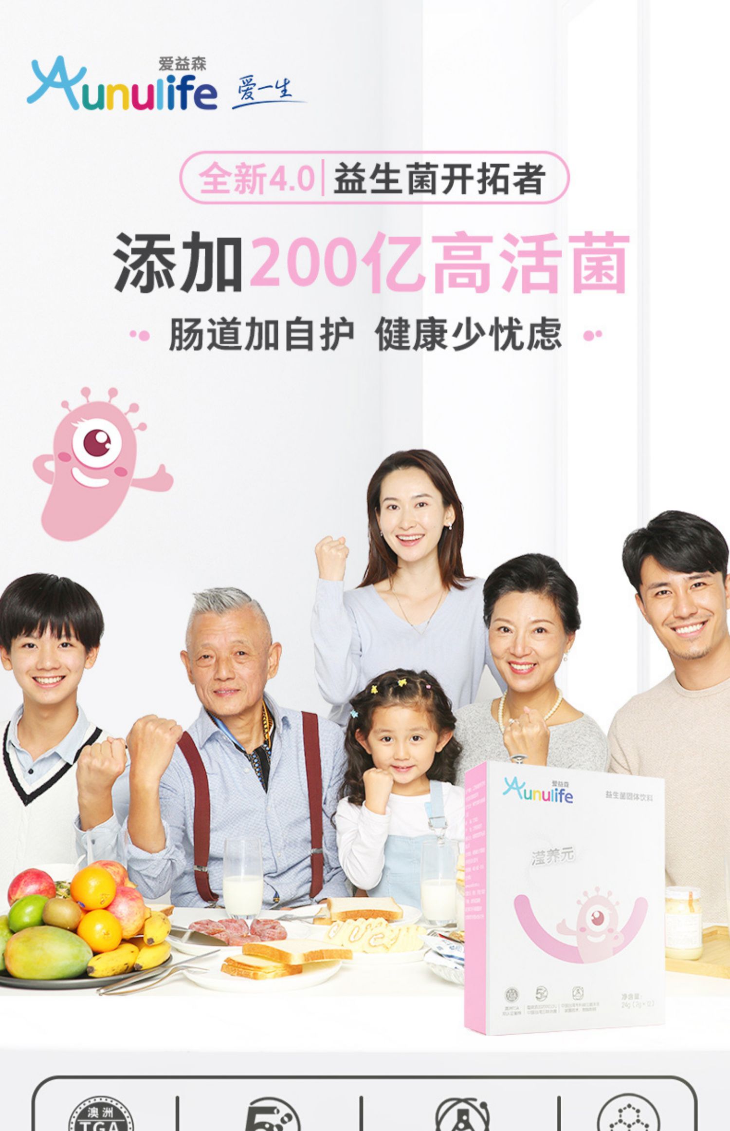 爱益森益生菌,提前中国肠胃自主研发,更适合中国人的益生菌,每袋添加200亿五联活菌,TOP级活菌数,中国专利装置技术,双重稳定活性,高效维稳,告别亚健康。