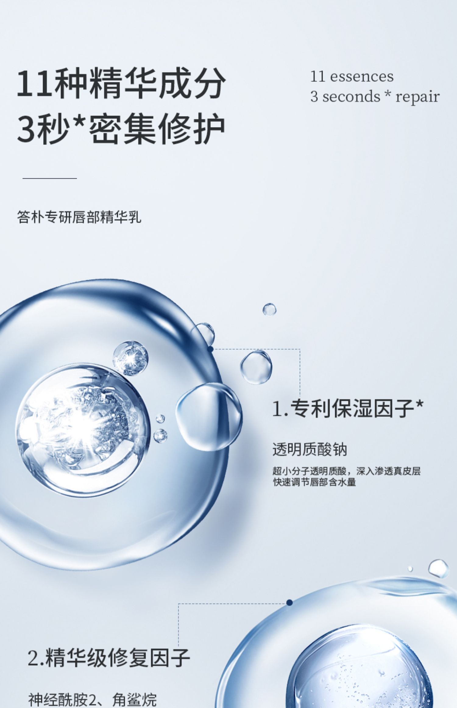 【赠运费险】答朴玻尿酸润唇精华乳,深层修护,润而不油,即刻补水,缓解干裂,淡化唇纹,深层滋养,修护屏障,持久保湿,11种精华成分,专利保湿因子,天然活性成分,精华乳液质地,一抹吸收,不粘不腻!