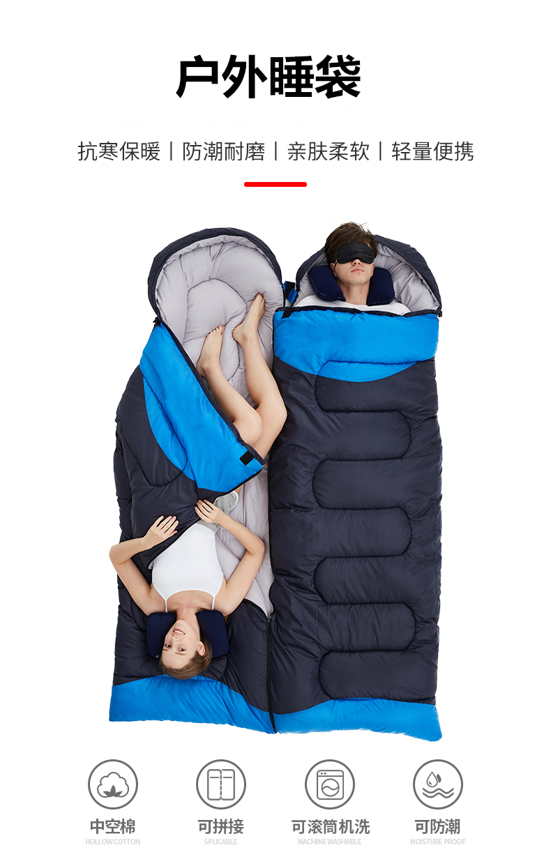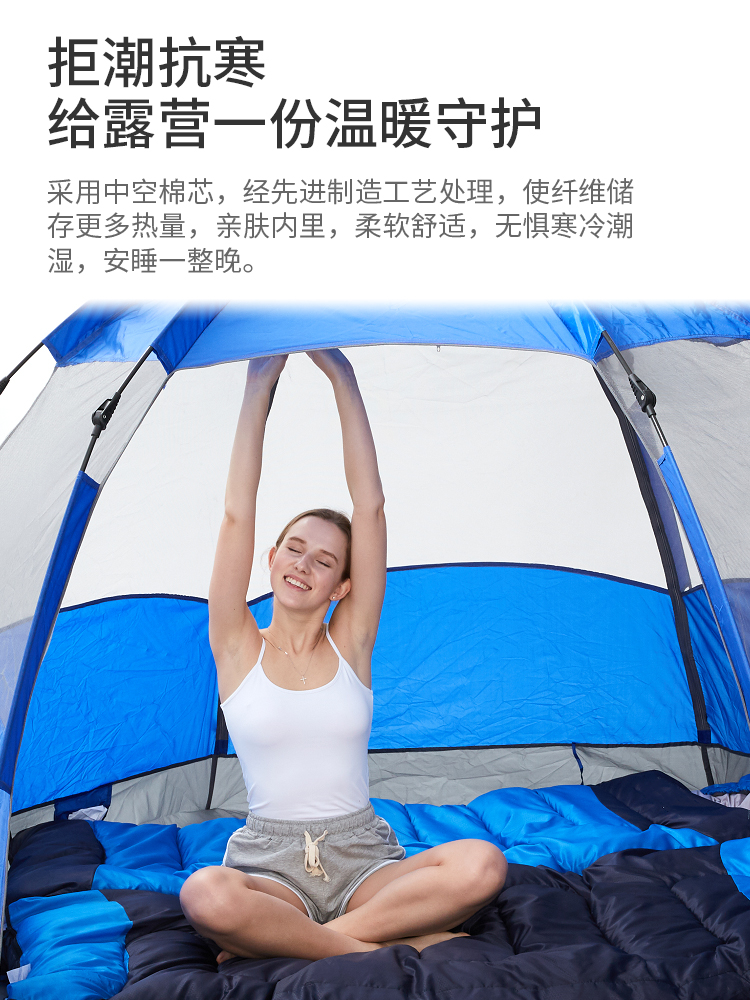 户外露营睡袋用途多样,选取优良中空棉,不含荧光剂,亲肤柔软透气,隔脏清洁,清爽透气,方便携带,舒心洁净,至美旅行~