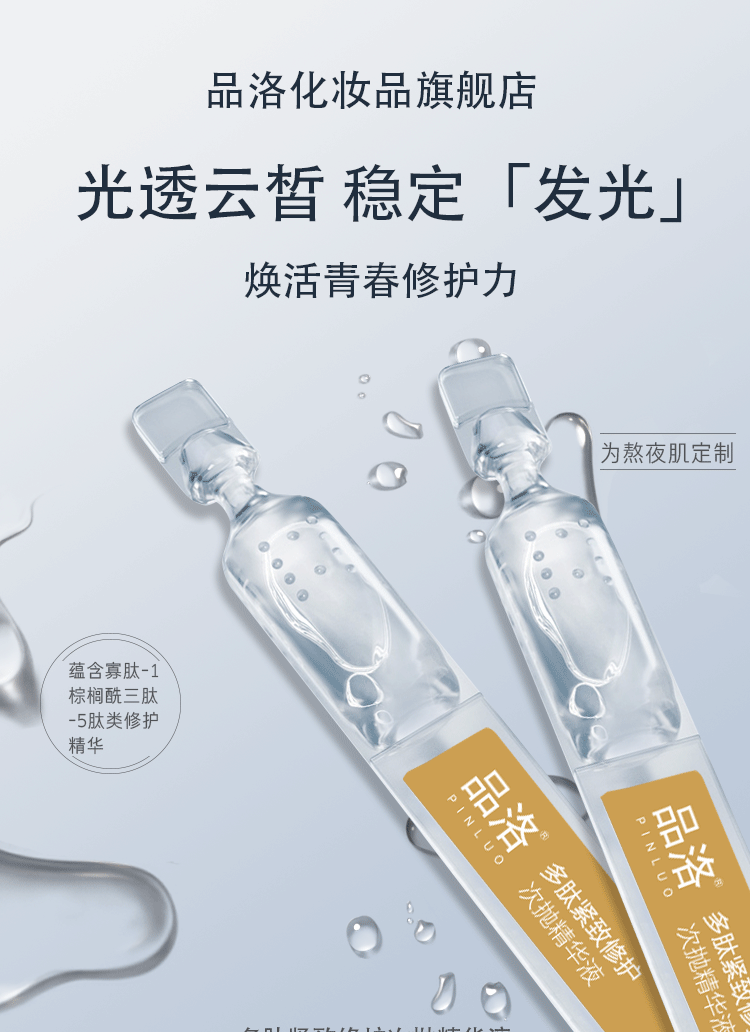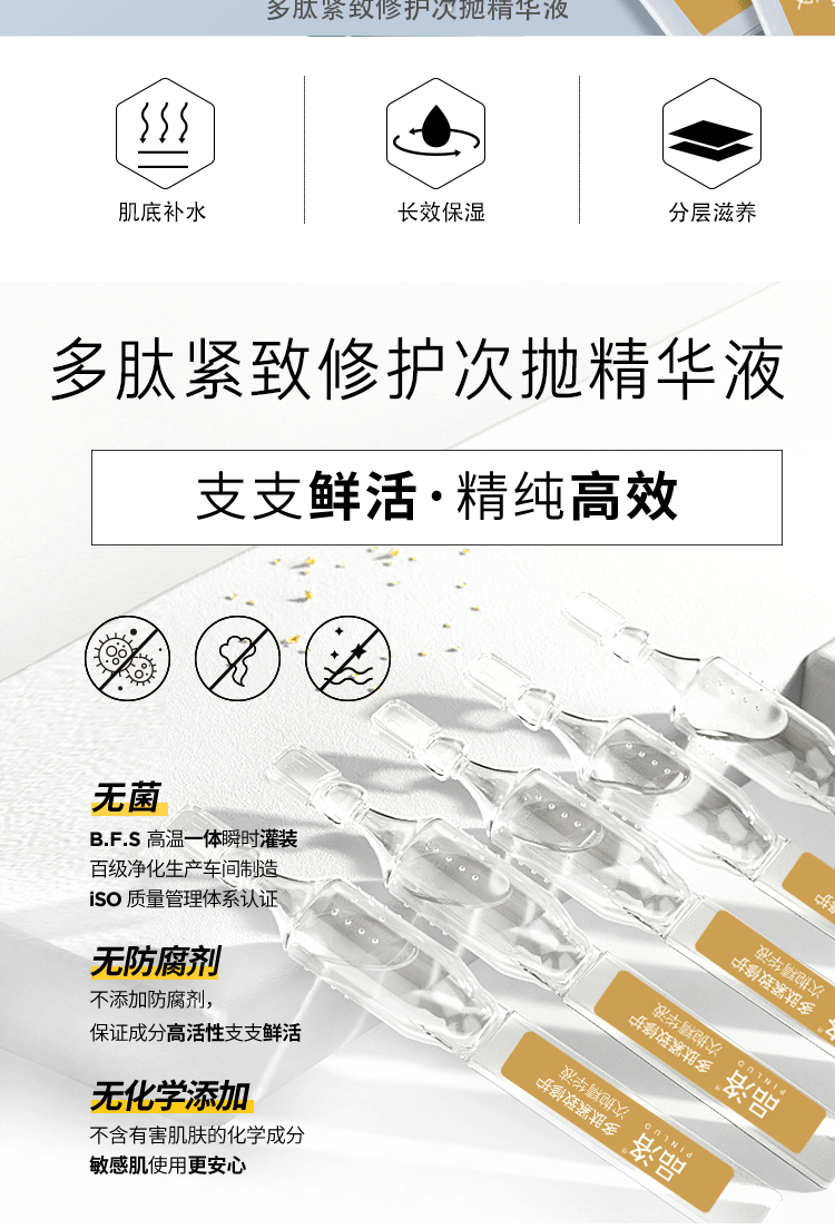 多肽紧致修护次抛精华液,支支鲜活,精纯高效,长效补水,提亮肤色,调节水油,改善粗糙肤质,柔滑细腻嫩肤,为熬夜肌定制。