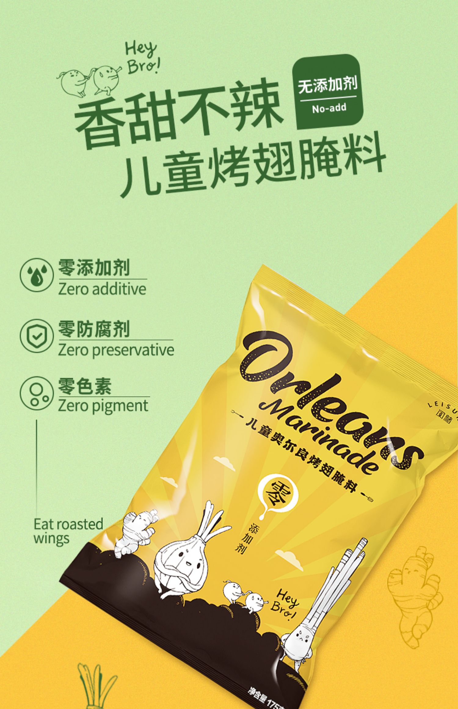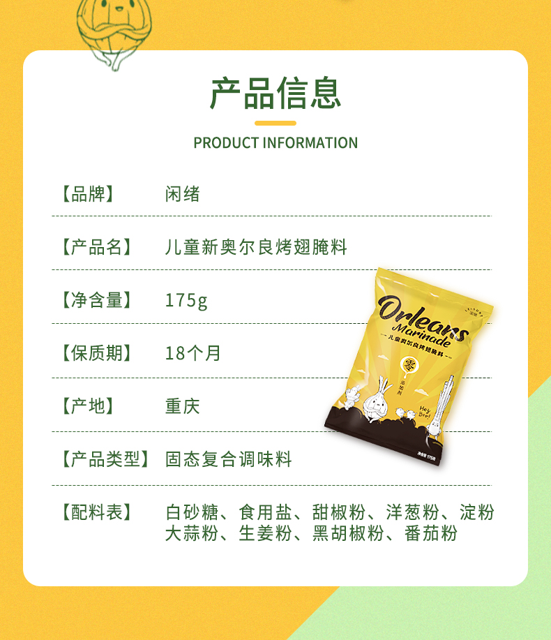 闲绪儿童奥尔良烤翅腌制料,烧烤调料官方旗舰店,儿童配方,零添加剂,零人工色素,零防腐剂!