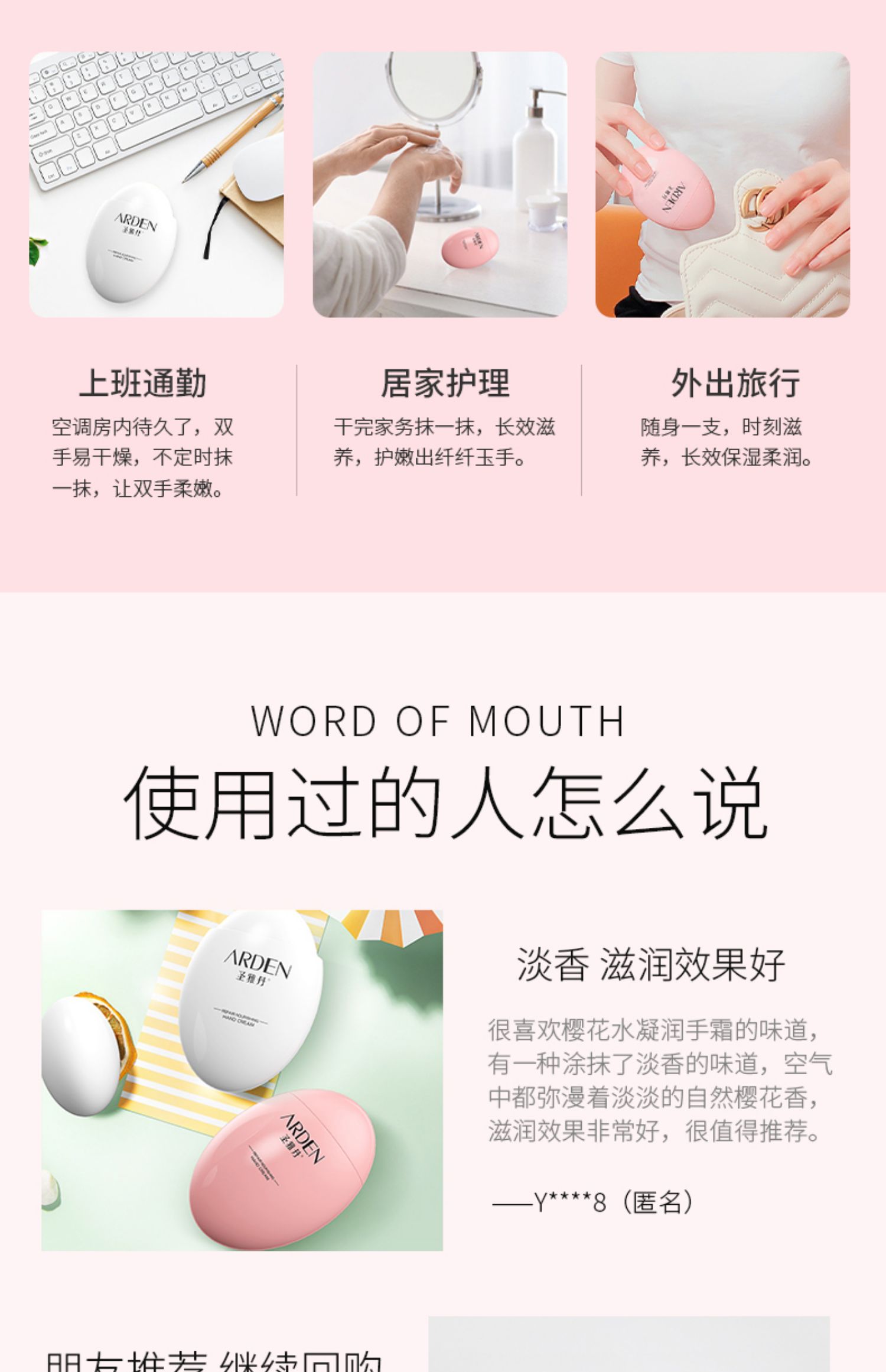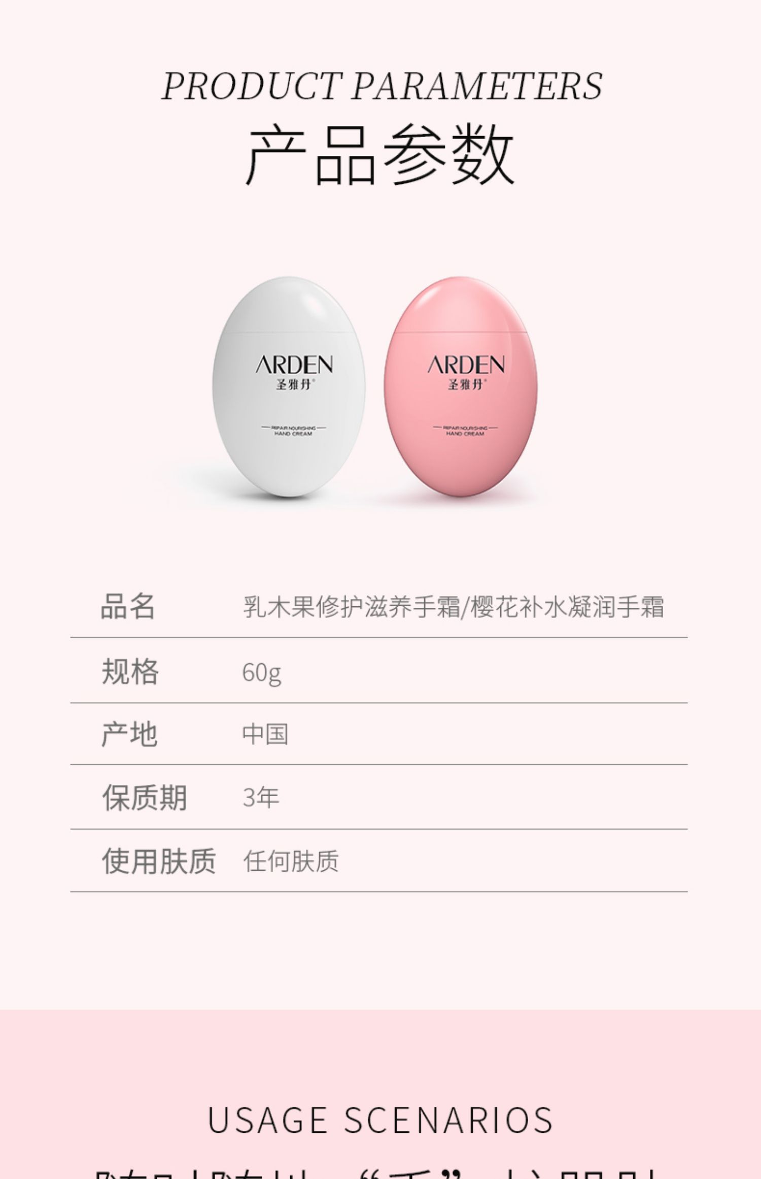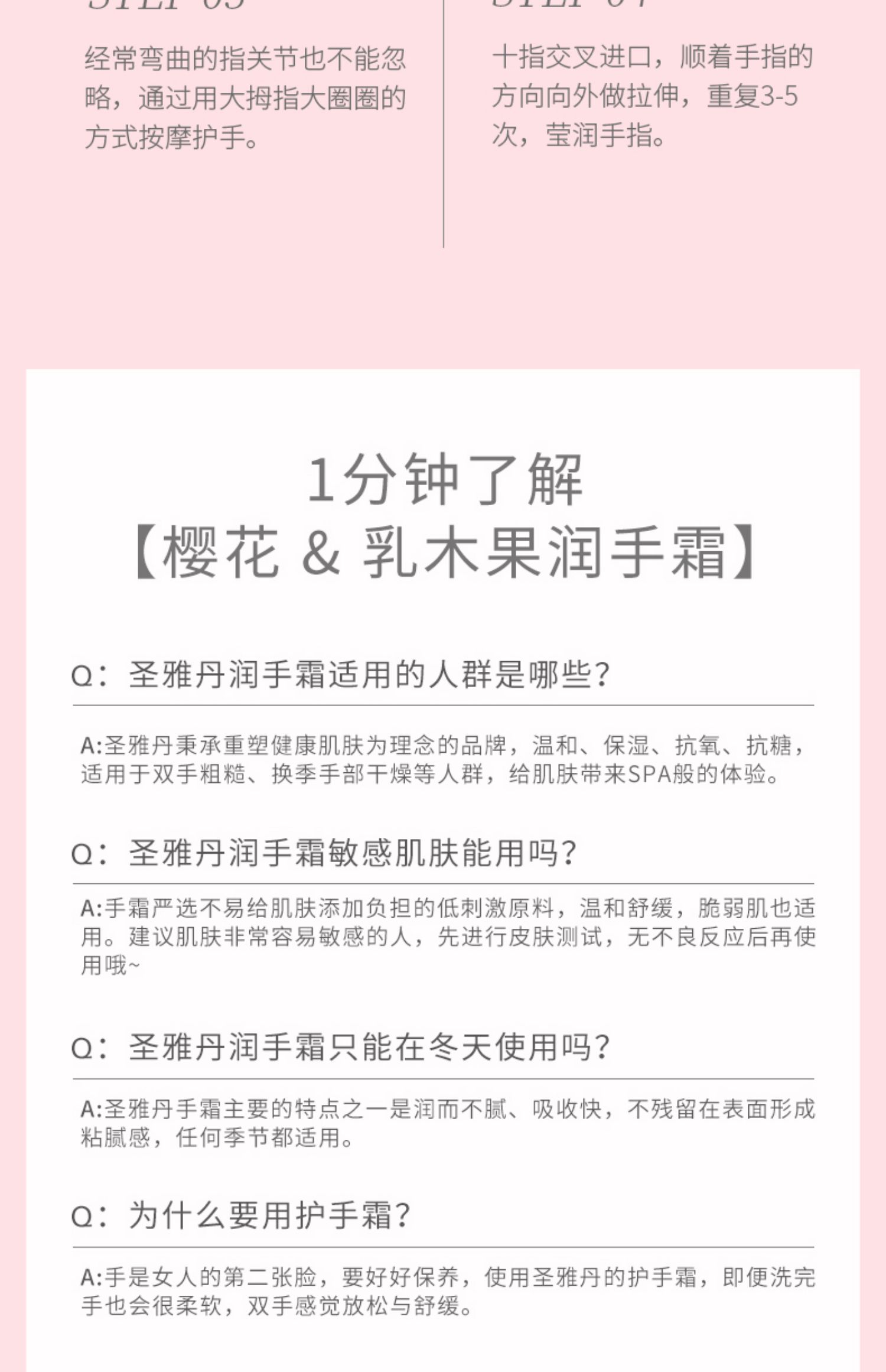 圣雅丹樱花护手霜,深层补水滋养双手,舒缓干燥肌,鹅蛋设计,清香不油腻,很滋润,味道很好闻,一点都不油腻,保湿防干裂,嫩白双手