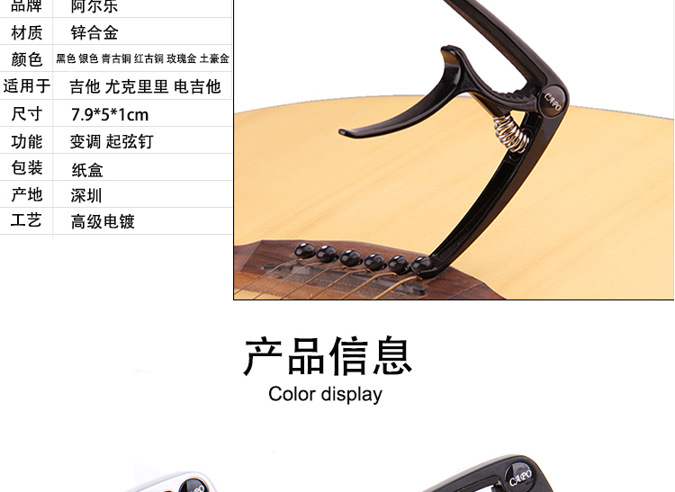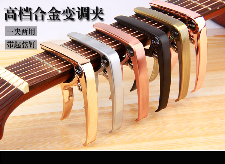 每一个玩乐器的人,都应该要有一个变调夹,今天下单还送5个拨片+琴弦1套+调音器+绒布袋!!一夹多用附带起钉器,简洁的线条,人性化曲面设计,采用凹凸设计换人起钉器结合,以免拔钉时对弦钉造成不必要的伤害!