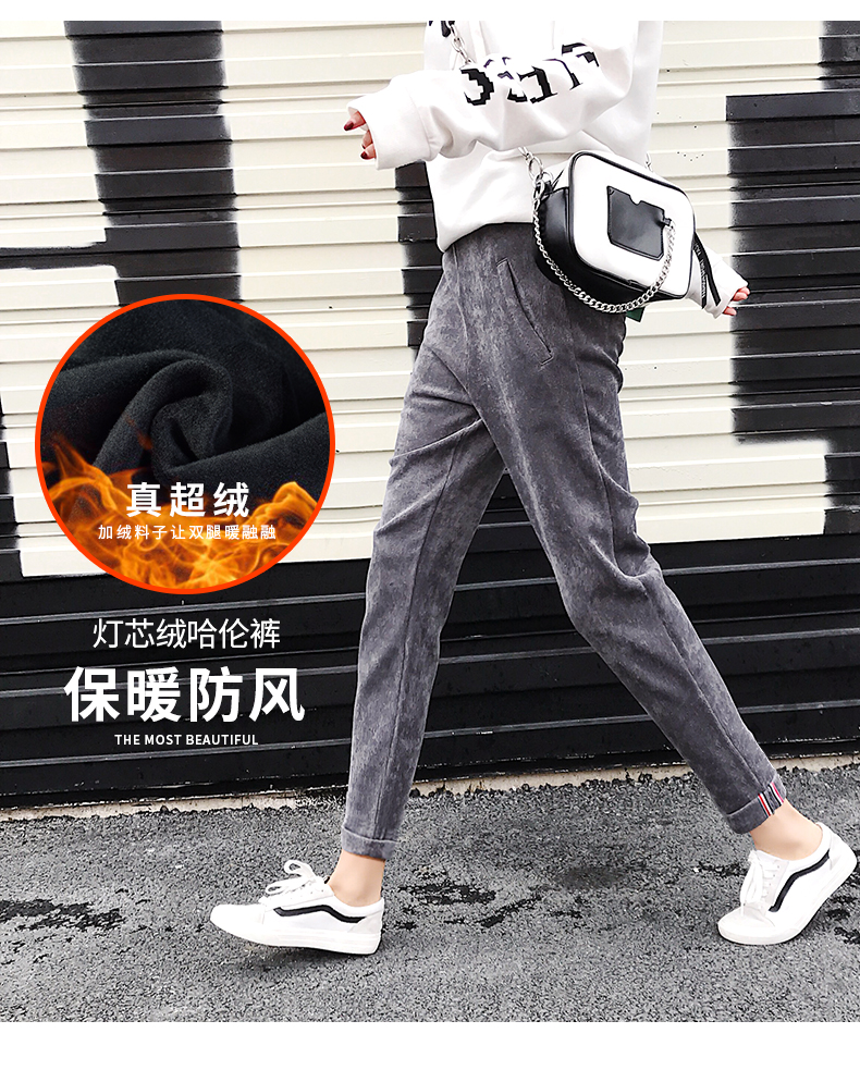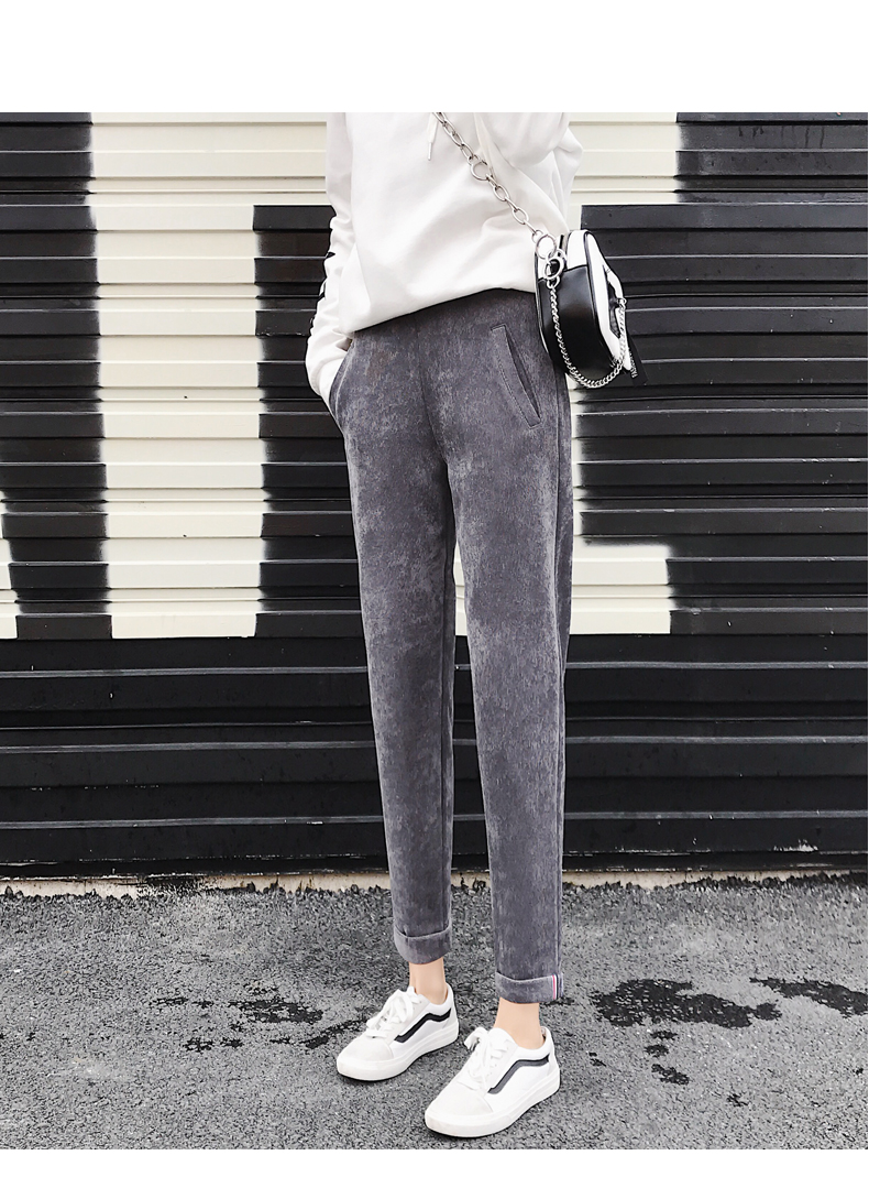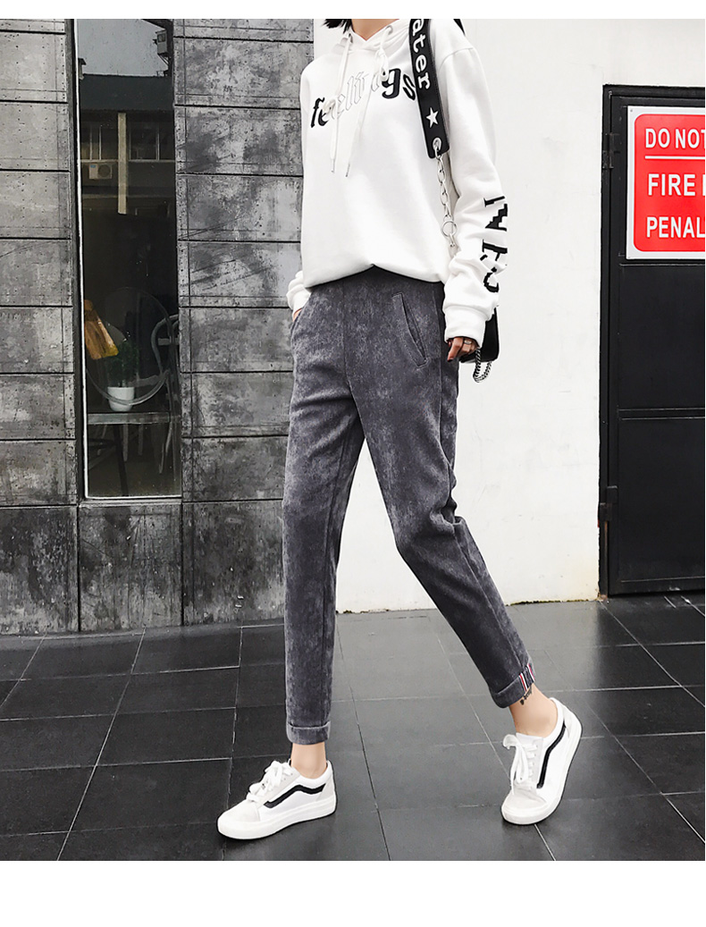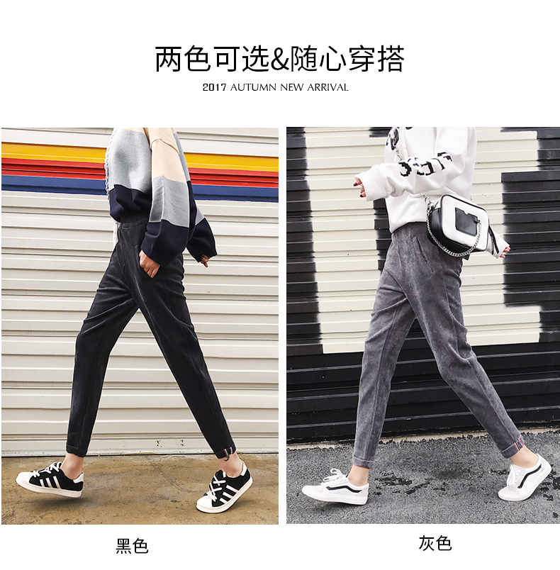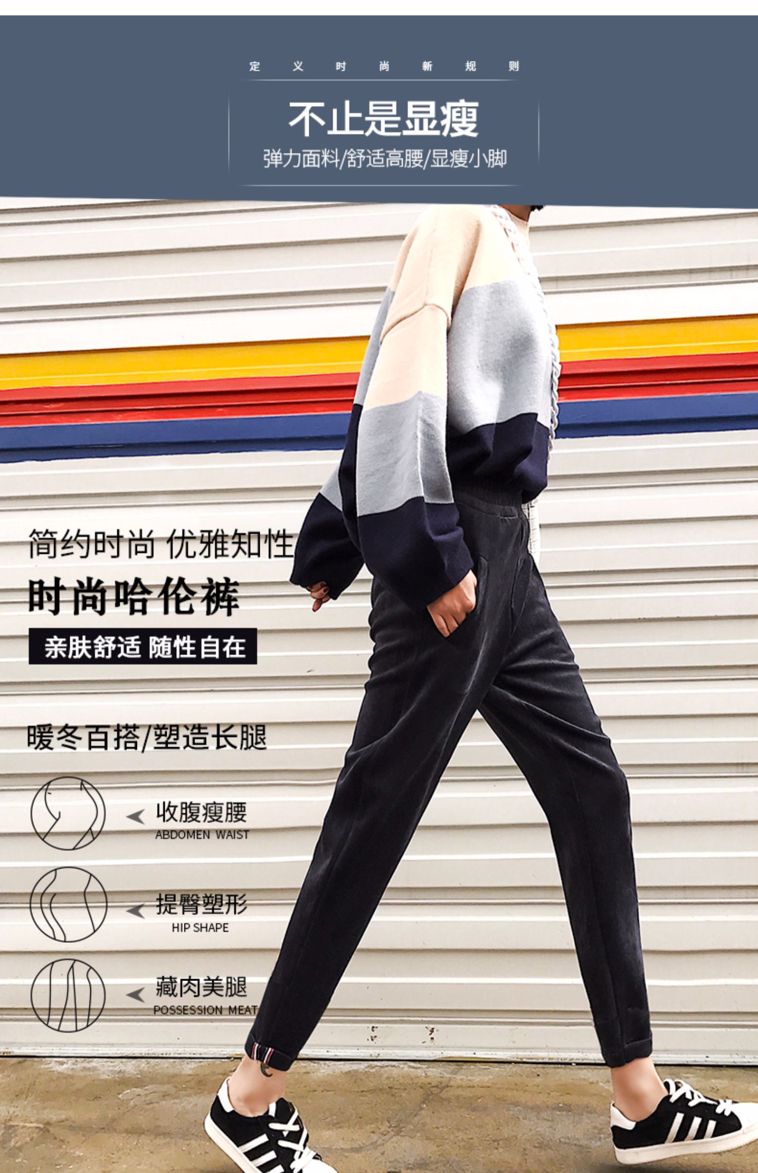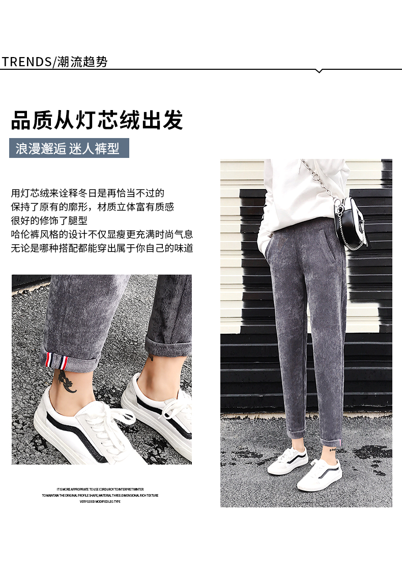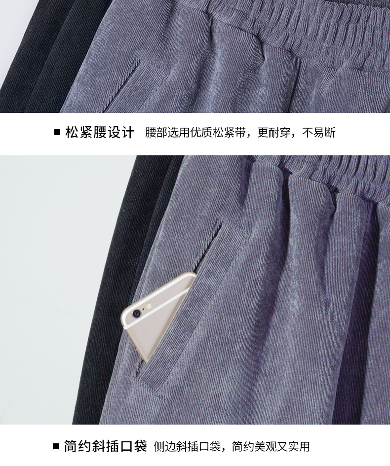 面料采用了超柔金丝绒,做旧复古感,不掉色不掉绒;松紧收腰的设计,上身舒适且有包容性;宽松的哈伦版型,很适合秋冬季节。