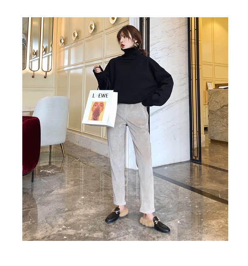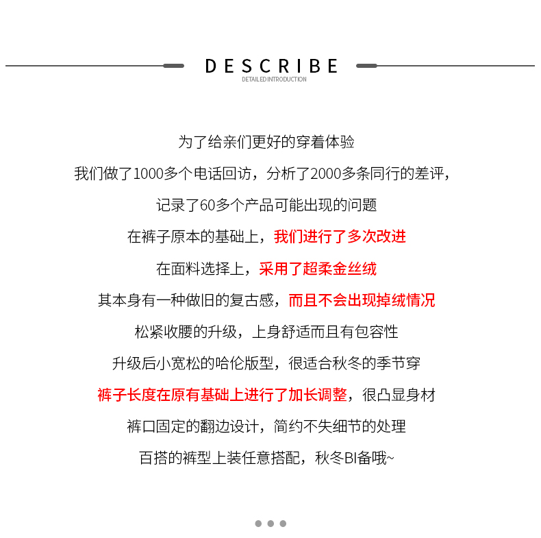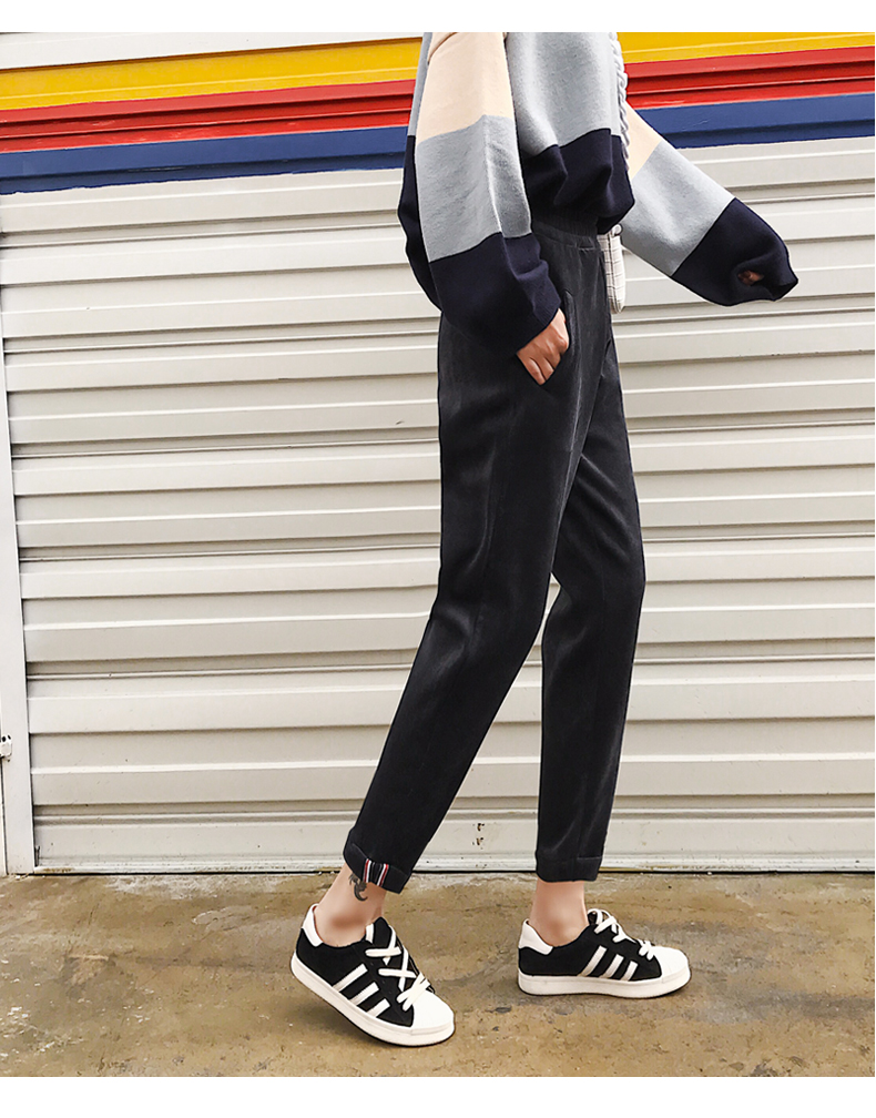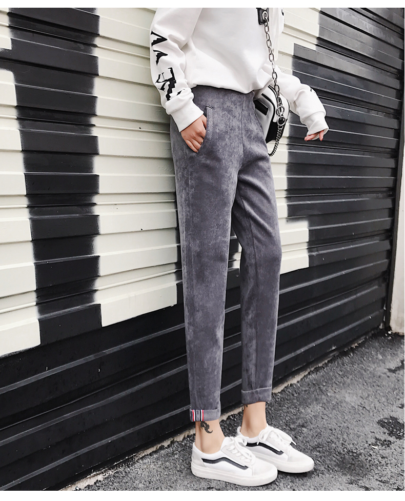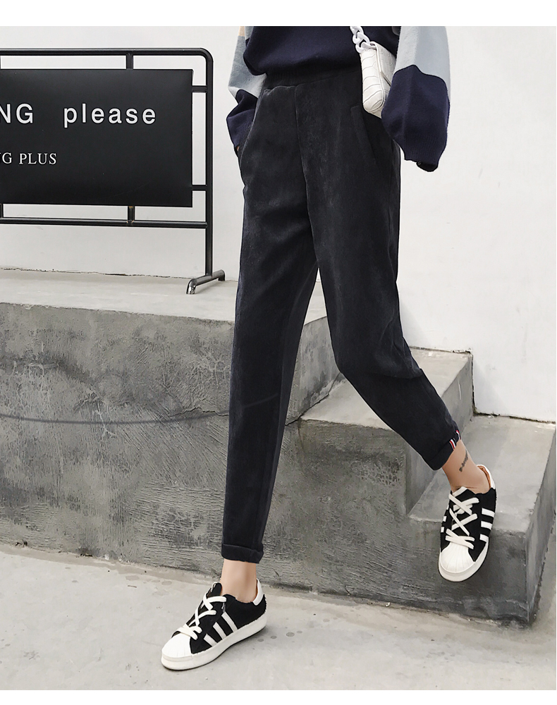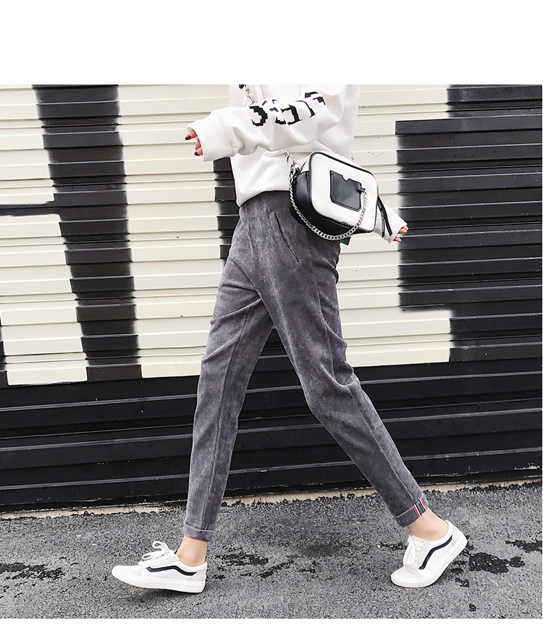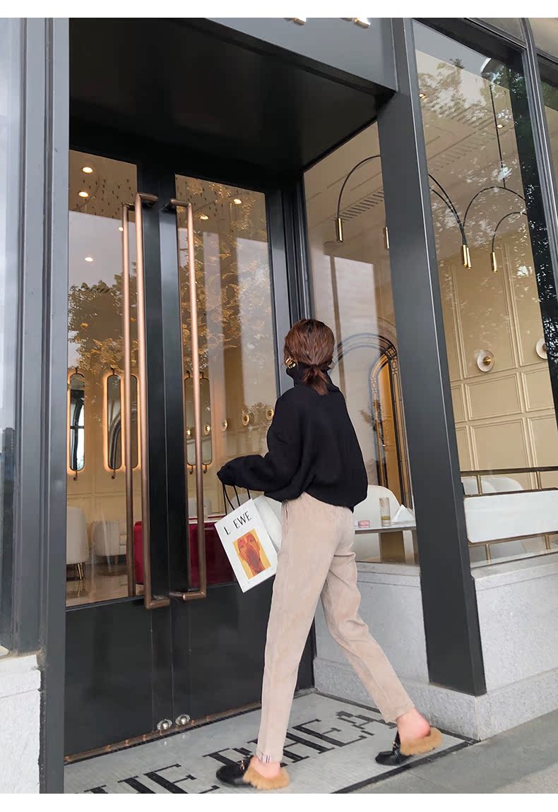 面料采用了超柔金丝绒,做旧复古感,不掉色不掉绒;松紧收腰的设计,上身舒适且有包容性;宽松的哈伦版型,很适合秋冬季节。