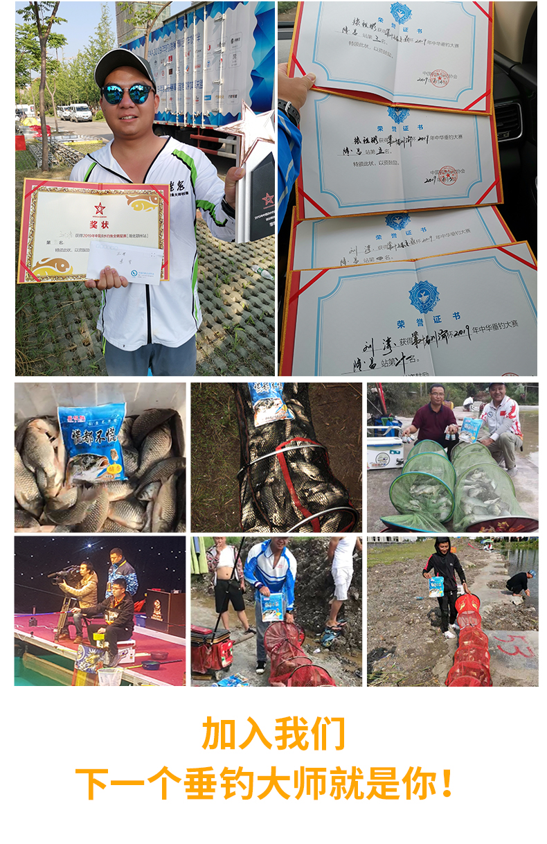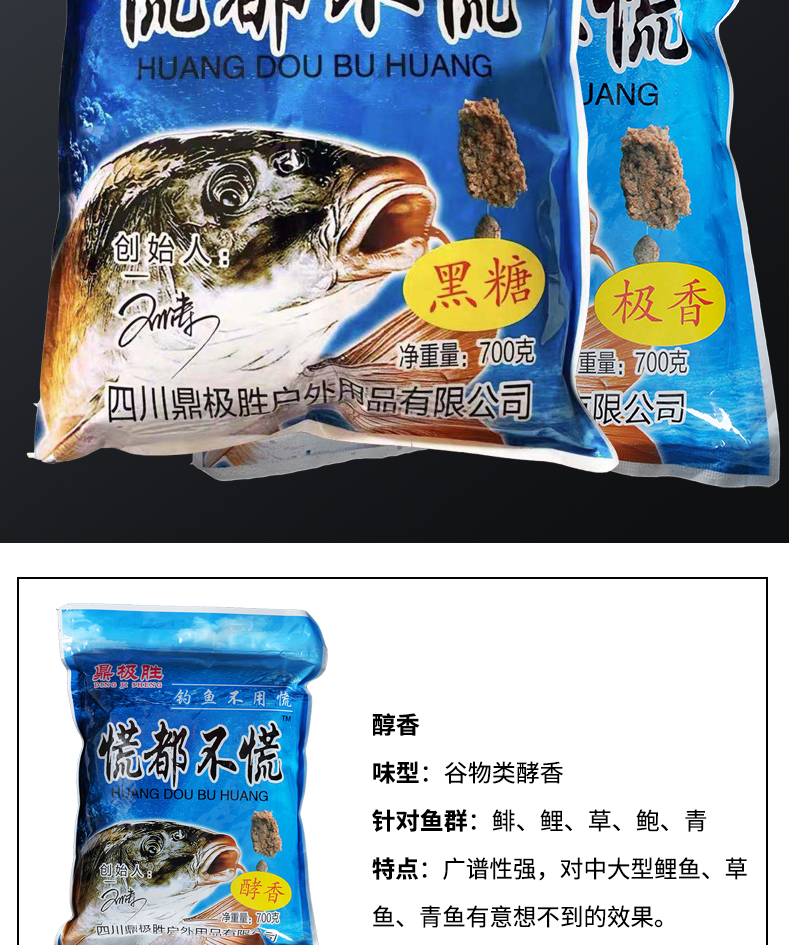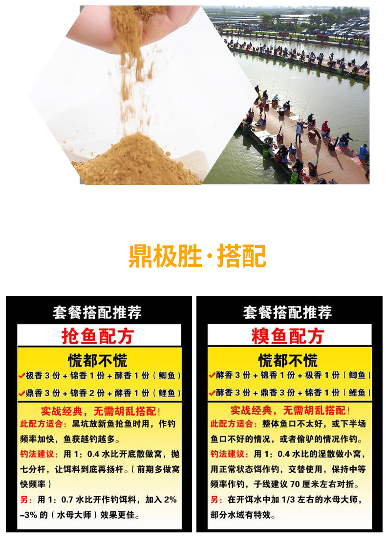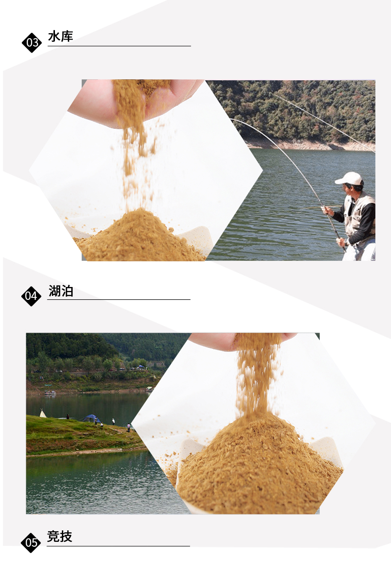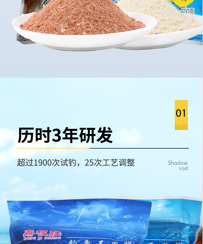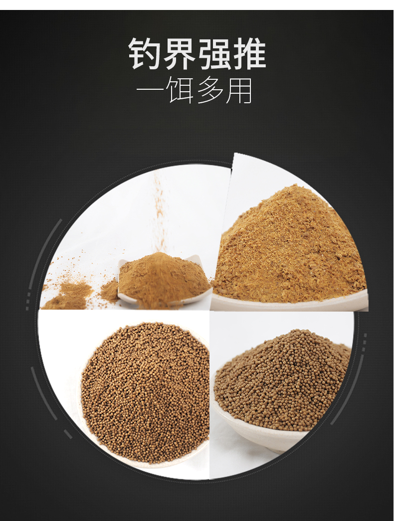 精选原料,集合多种天然谷物,特加龙王恨诱鱼因子、用上九一九、钓鱼成高手、专心做好每一款鱼饵!