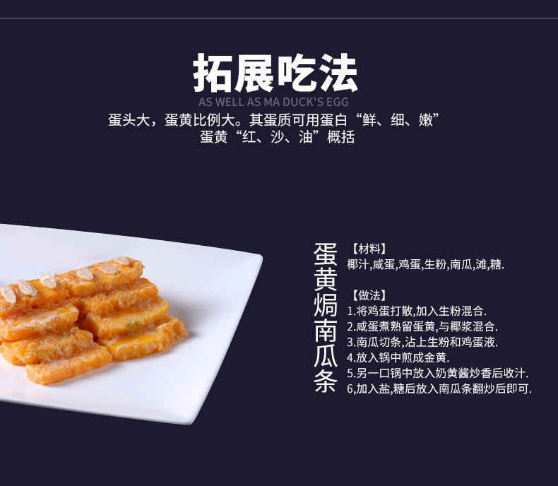 精选优质鸭蛋20枚,流油起沙,自然醇香,蛋黄松沙质地,细腻爽滑,口感咸香适中,古法腌制,手工制作,高温杀菌~