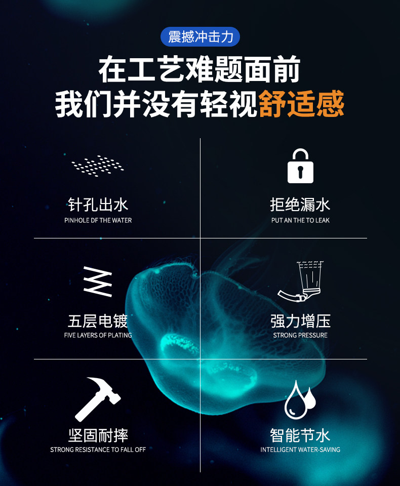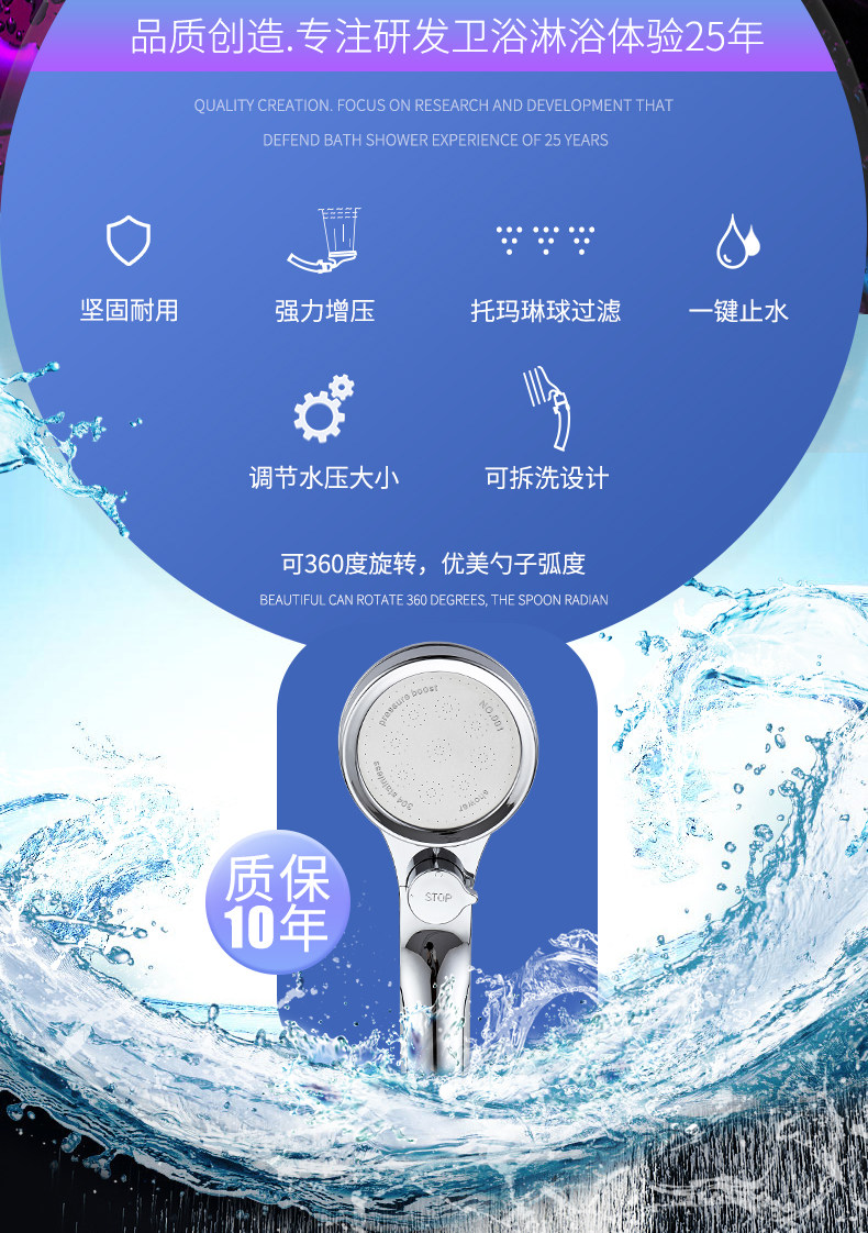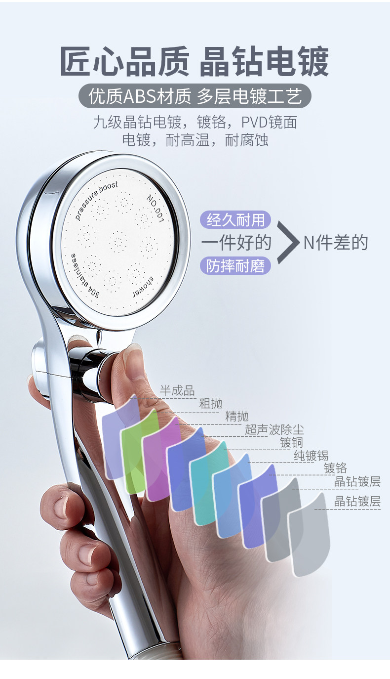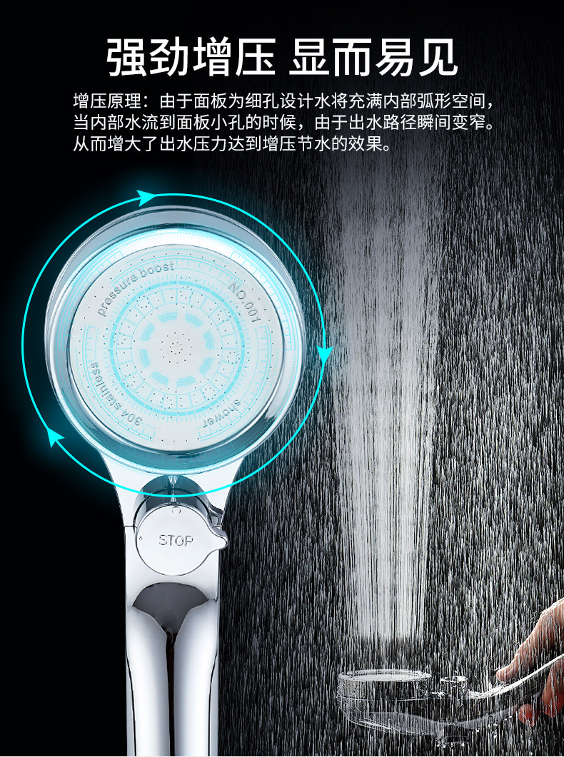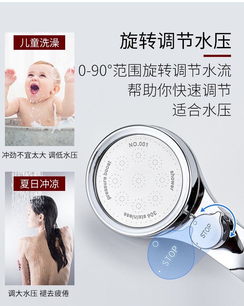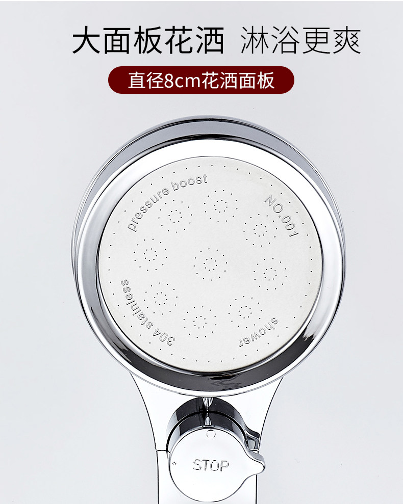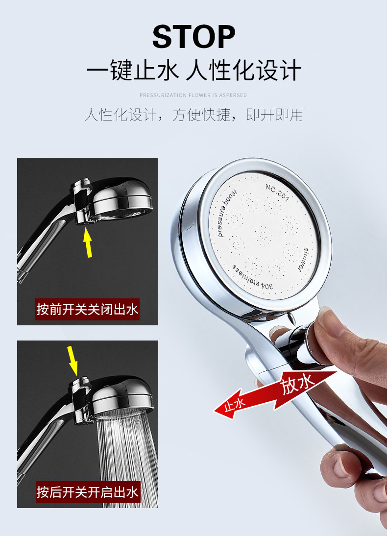【抖音爆款】超强增压花洒,强劲喷射,顶部可360°旋转,不锈钢面耐腐蚀,自带开关按钮,一键止水,操作自如,可拆洗设计,居家必备!【赠运费险】