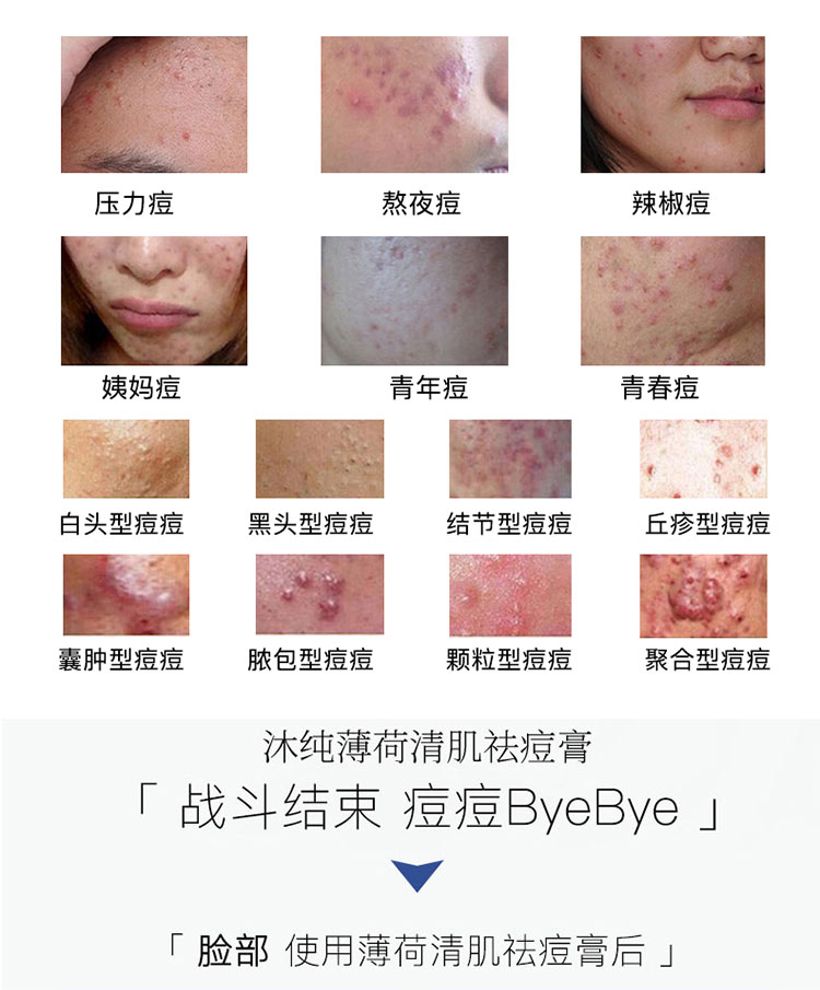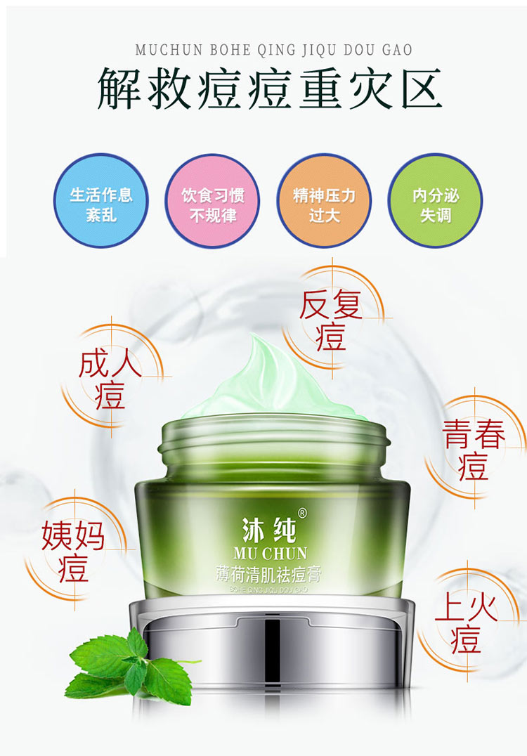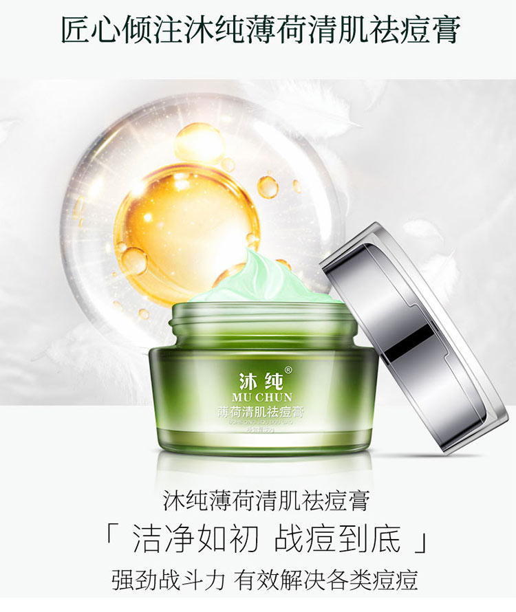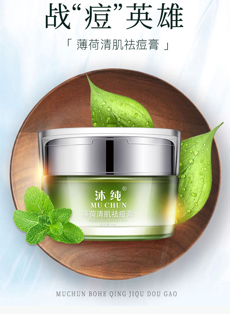 薄荷清肌祛痘膏,萃取植物精华,温和祛痘,专注解决各类顽固痘痘,平衡水油,深层修护,祛痘淡印,收缩毛孔,战“痘”到底!
