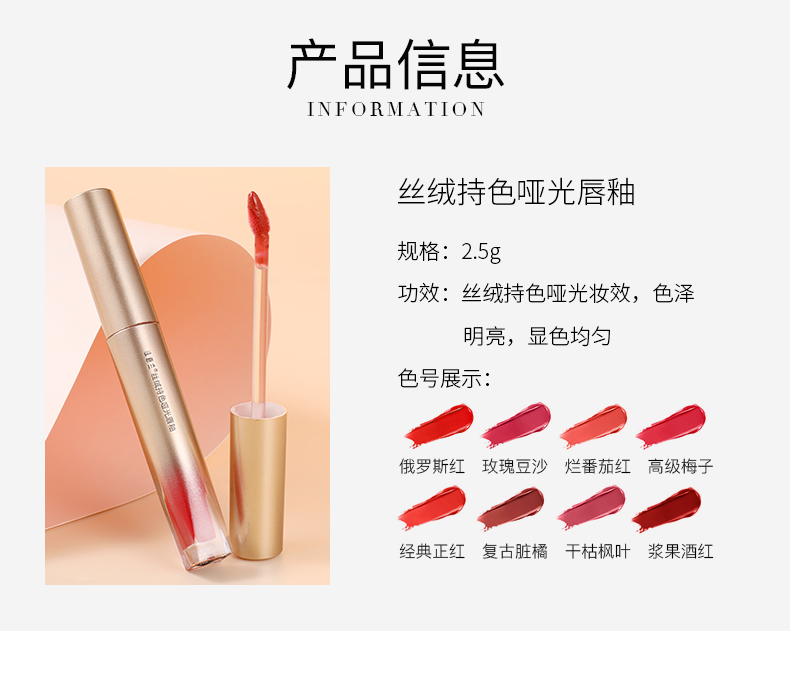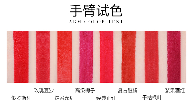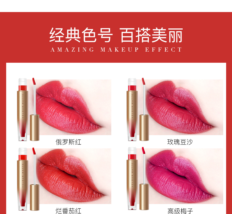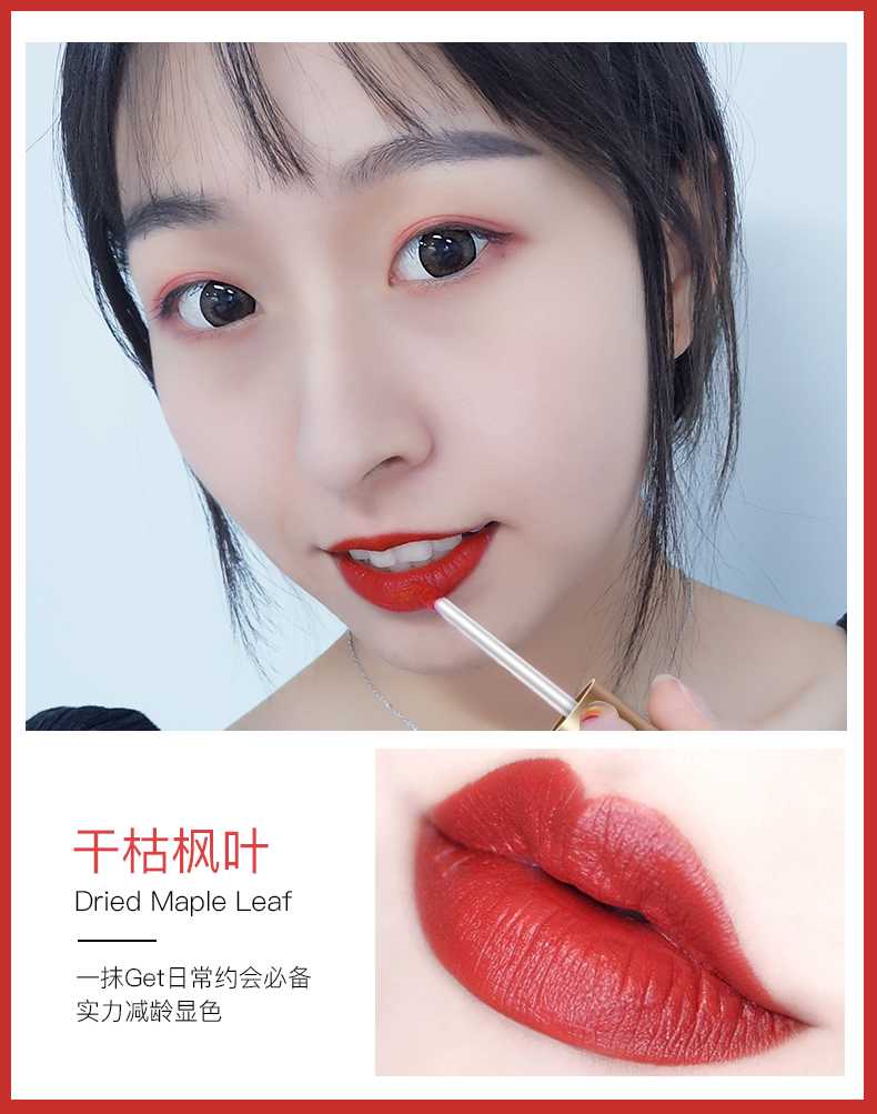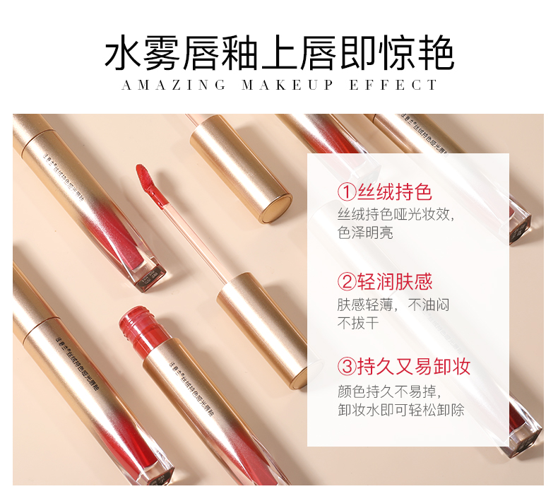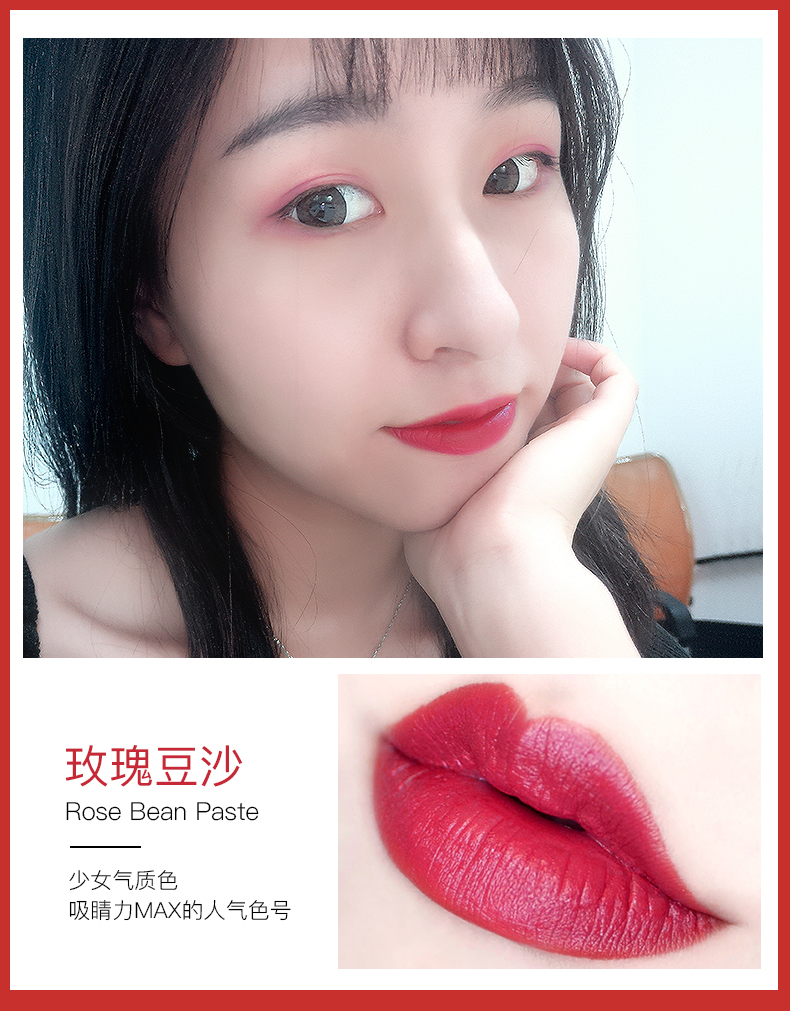 丝绒持色哑光唇釉,水雾唇釉上唇即惊艳,持久不易掉,卸妆水可轻松卸掉;不润不干,上嘴丝滑不显唇纹,持久力也超棒,8色可选~~