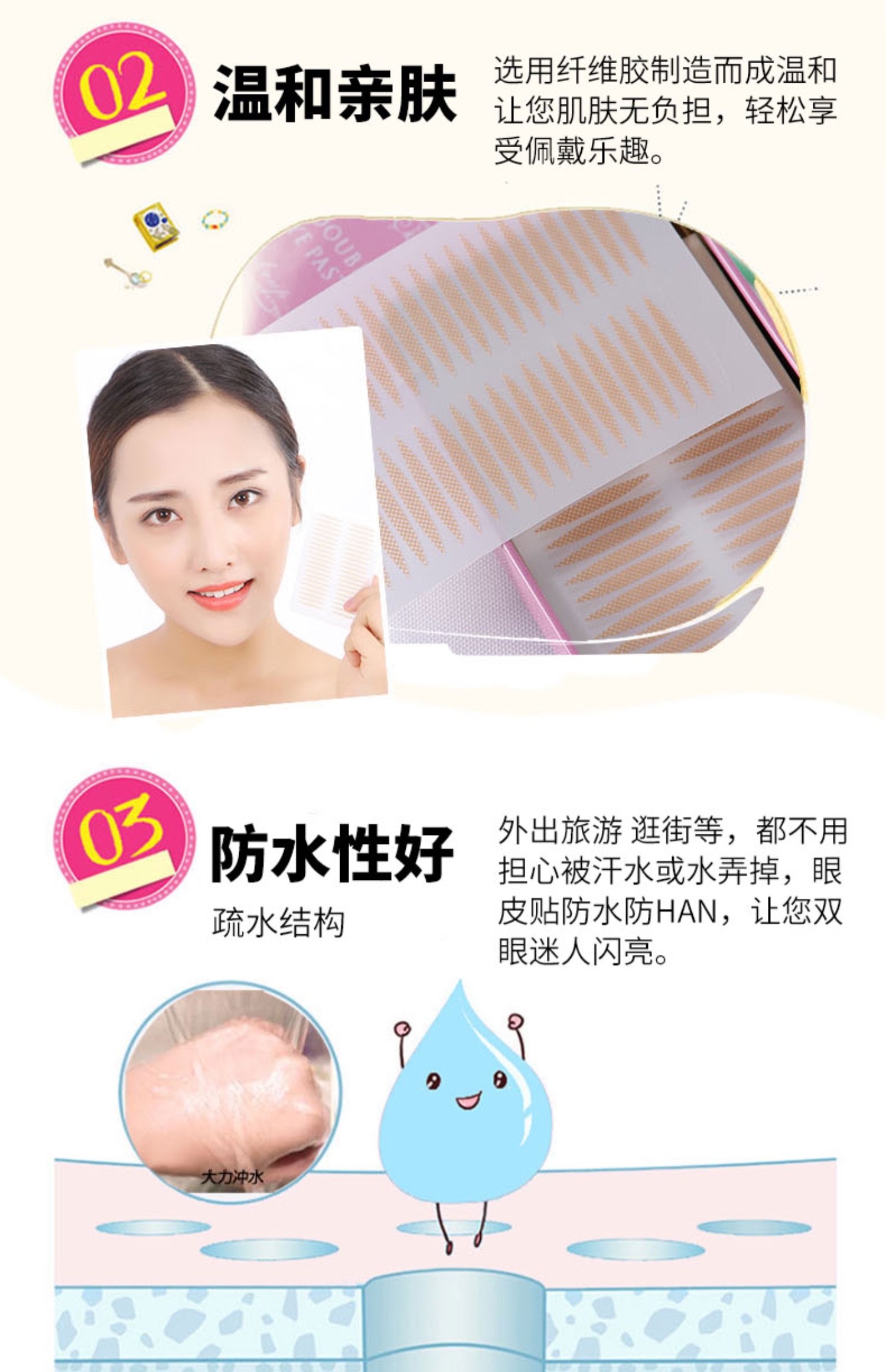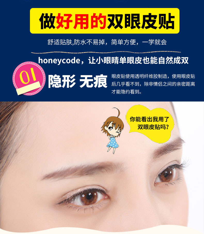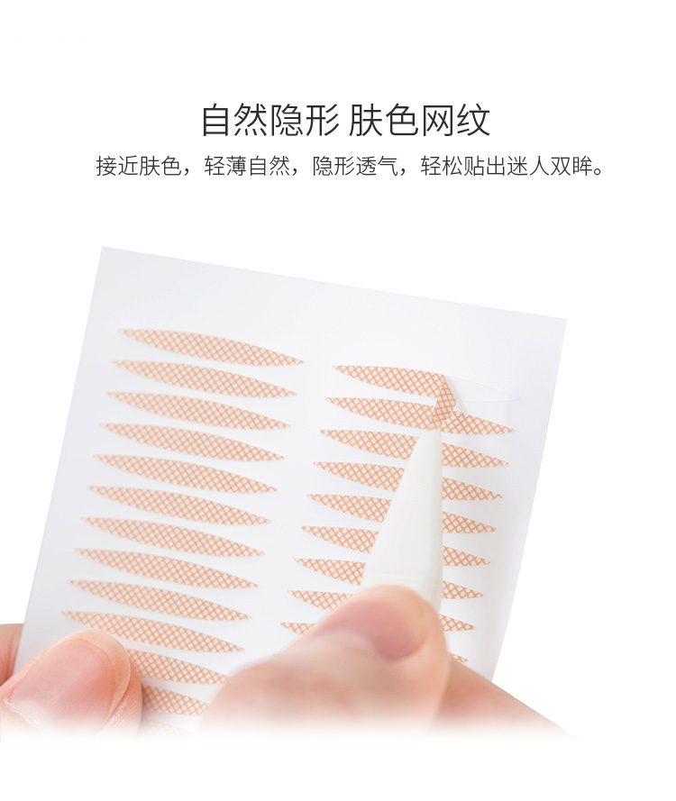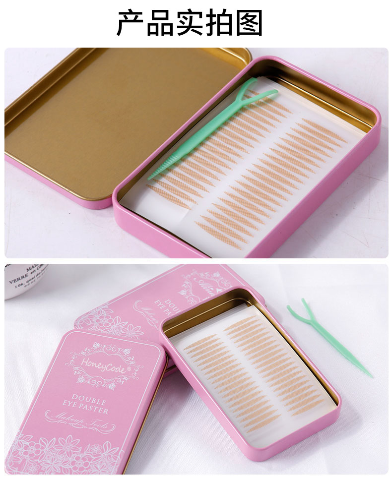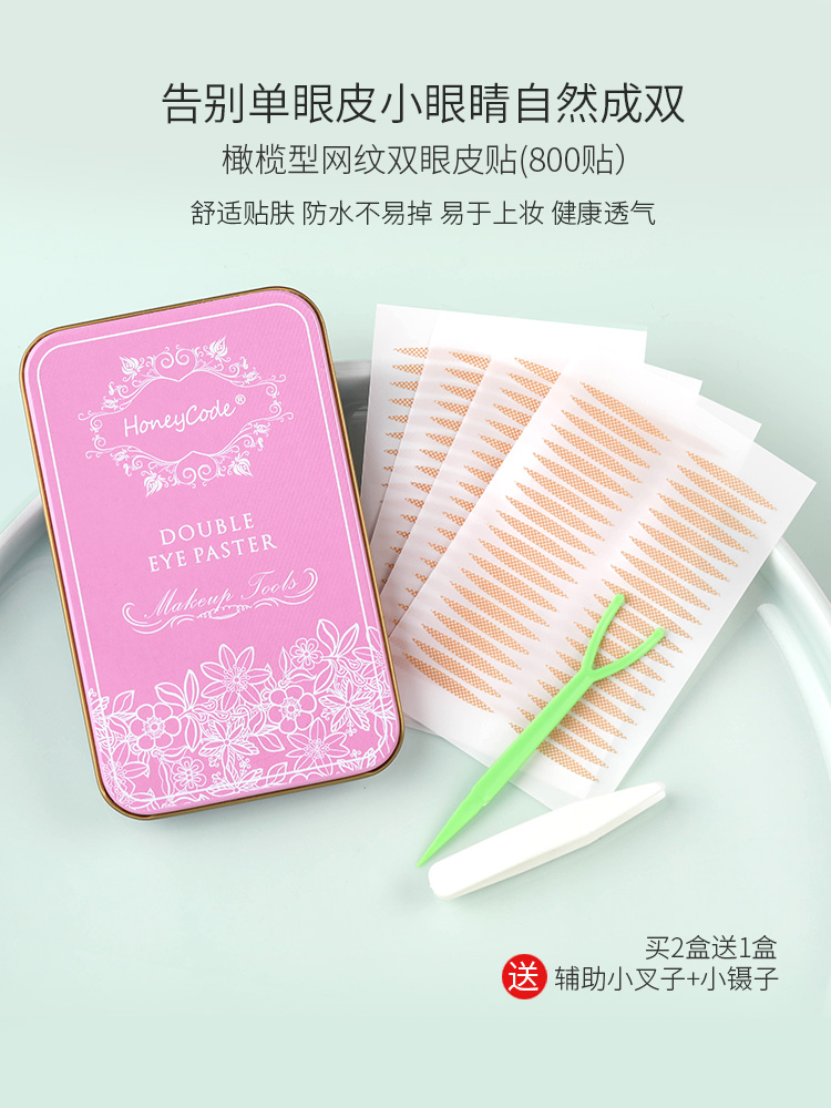 蕾丝网状,橄榄型双眼皮贴。隐形无痕,宛若天生。优质纤维,自然亲肤,防水防汗,易上妆。简单方便,一用就会。大眼睛的小秘密~铁盒装~800贴超大容量~送Y型叉~+小镊子