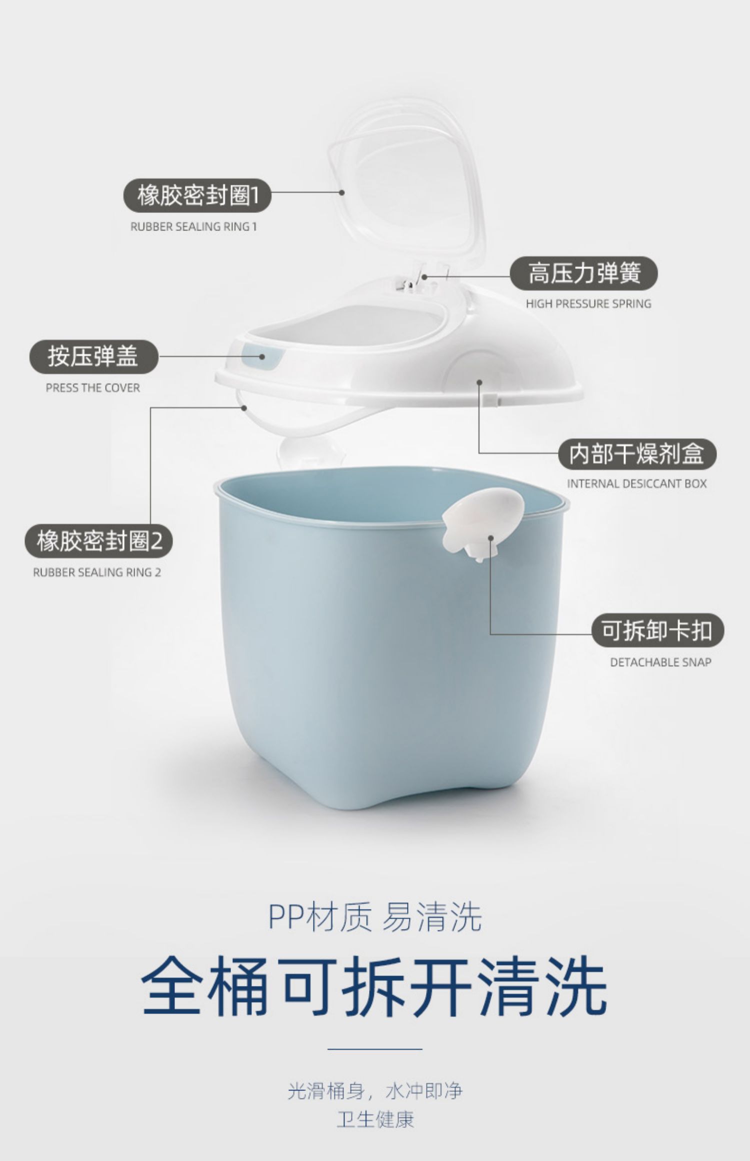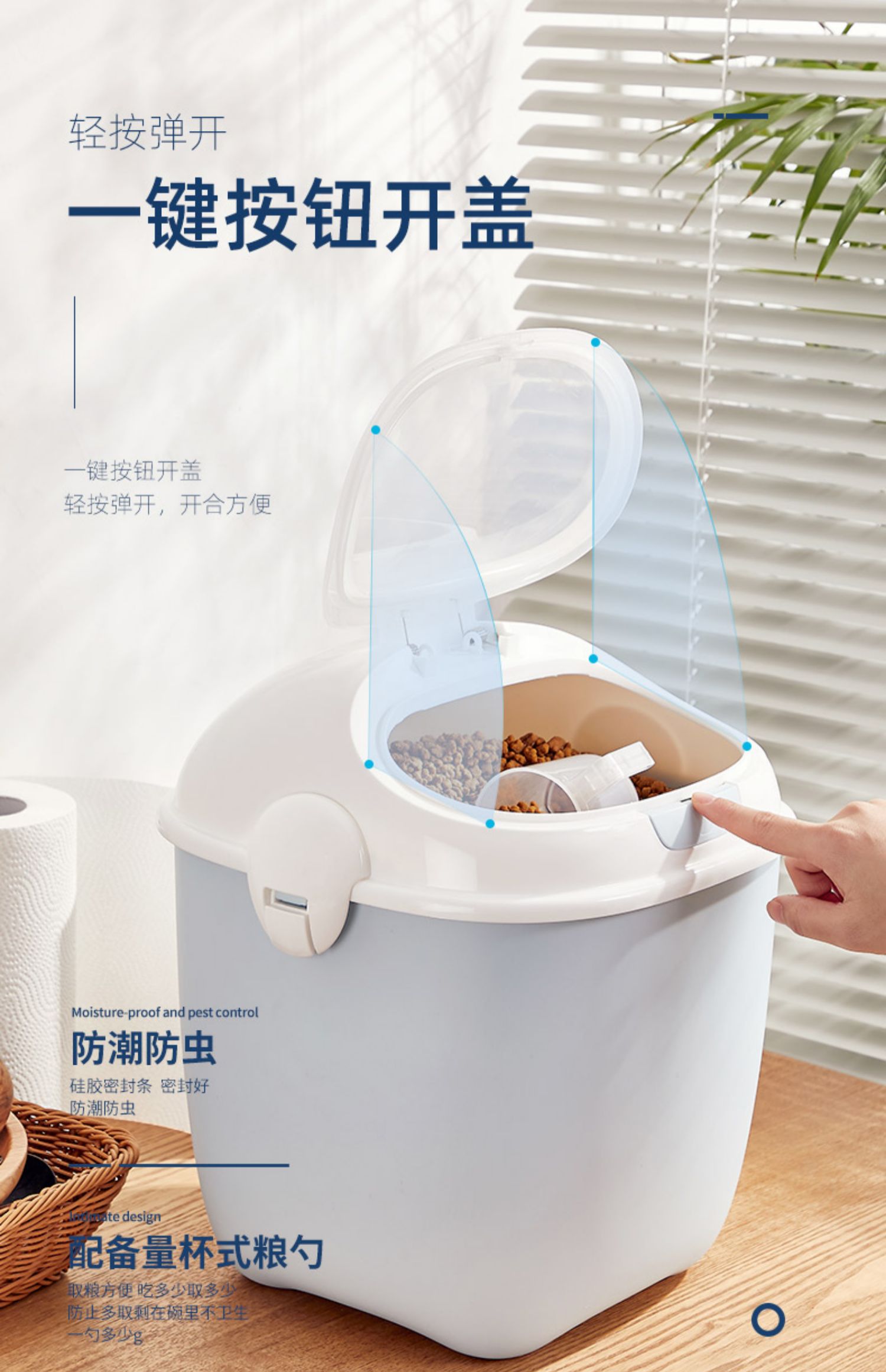【下单就送粮勺+干燥剂+量杯】可容纳十多斤储粮,双密封圈,密封性非常好,一键按钮开盖,全桶可拆卸清洗,确保主粮新鲜,铲史官必须拥有一个!!