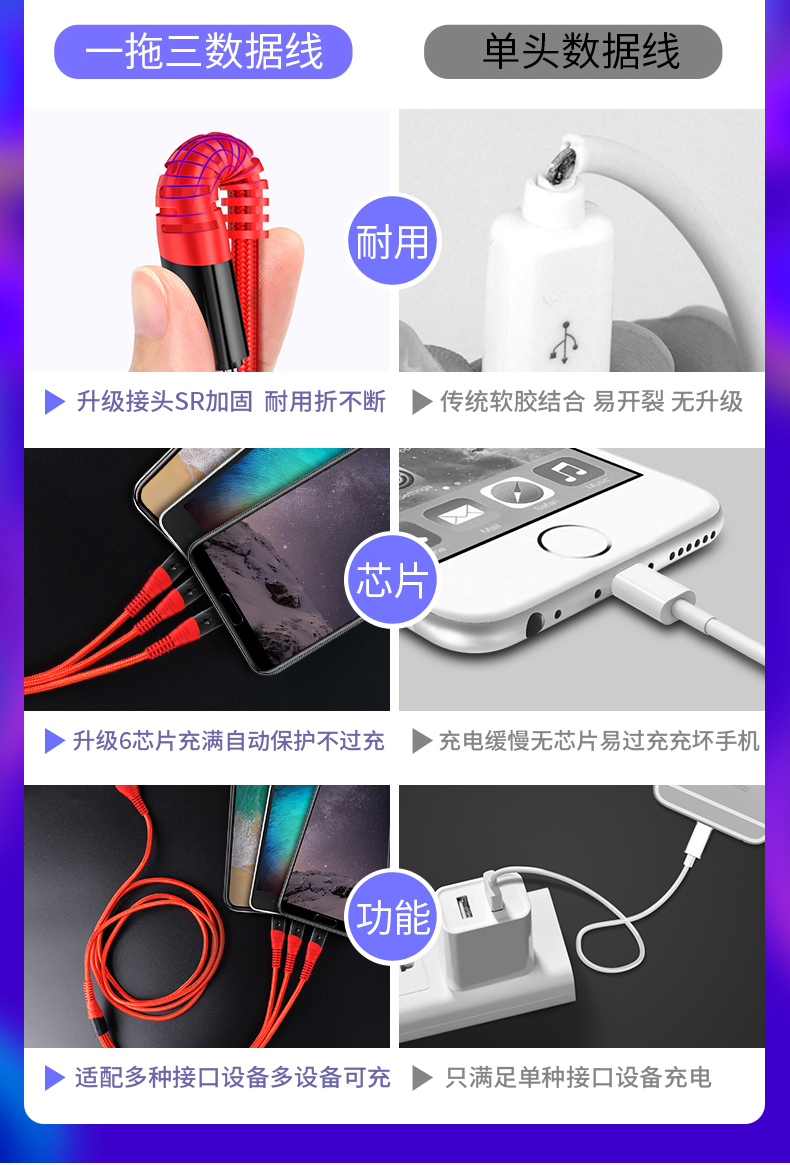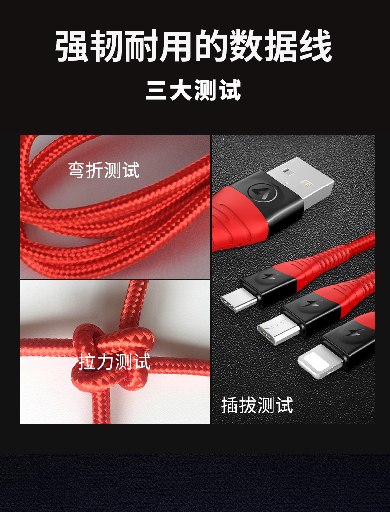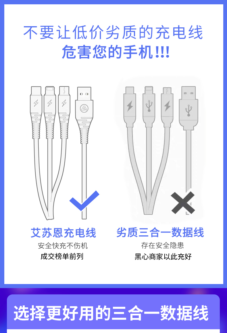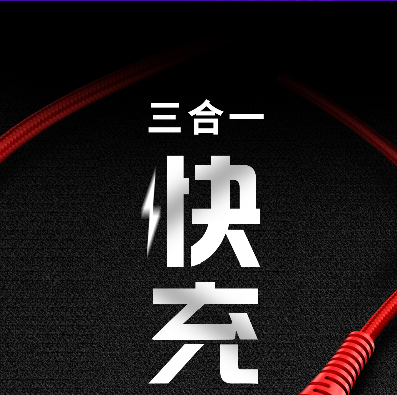 一拖三数据线,安卓苹果type,安全便捷善于充电,亮丽如新不氧化,升级大改造不伤机,涓流充电不过充,超柔软线身不折断,快充设计,三个设备一线搞定!
