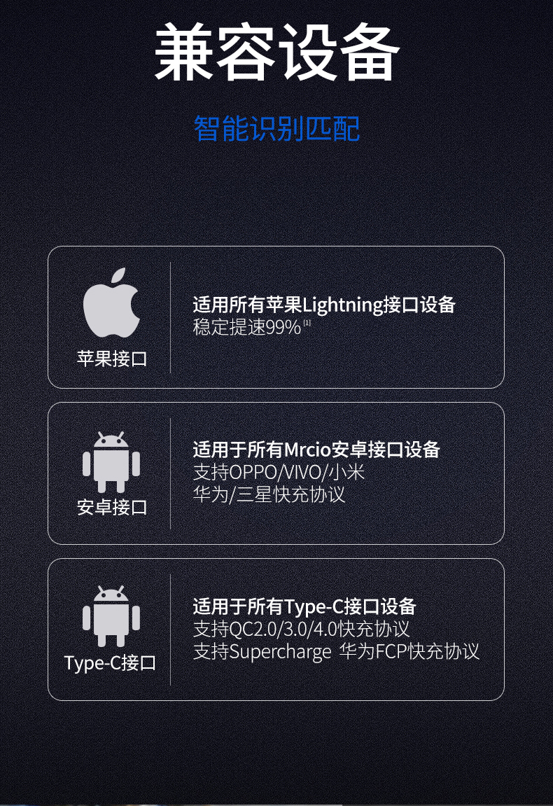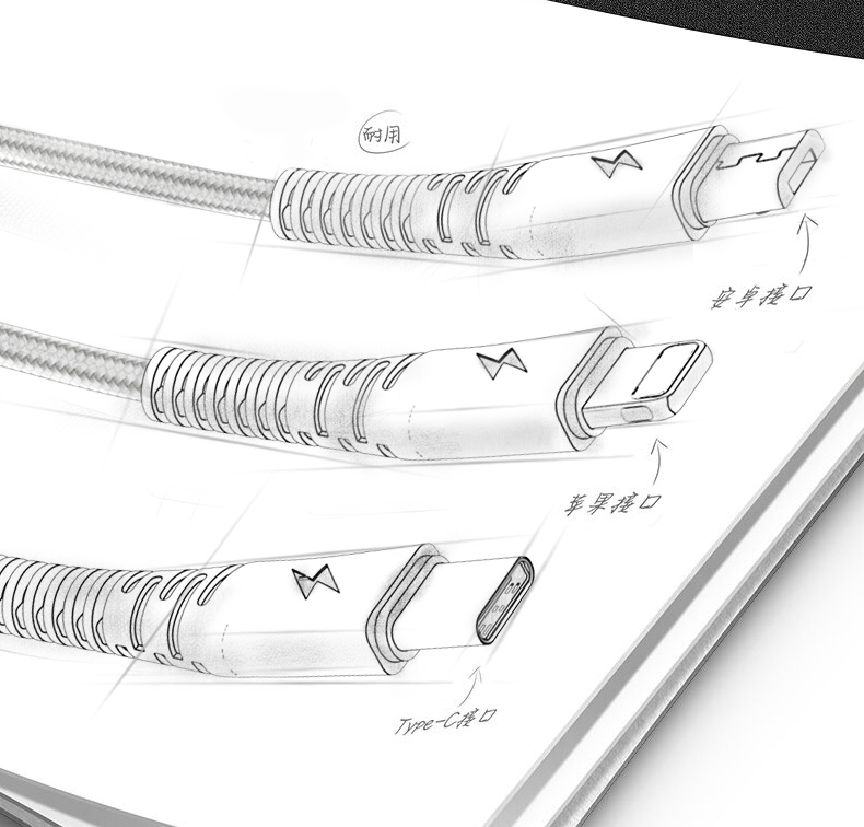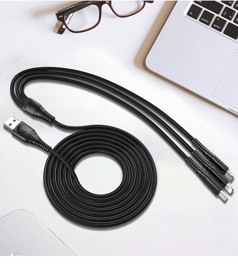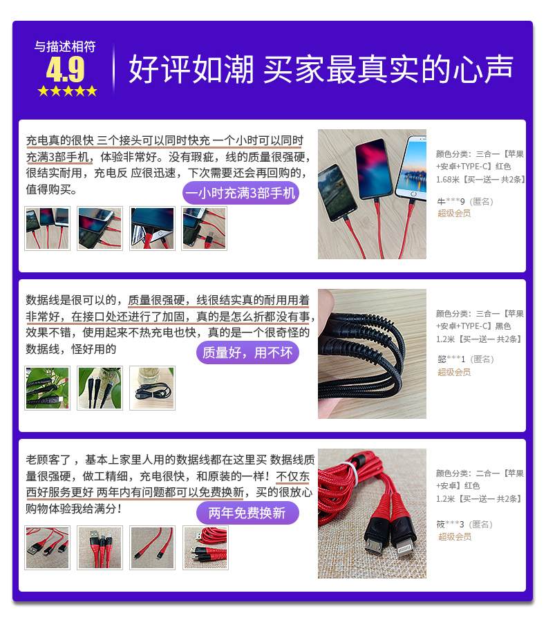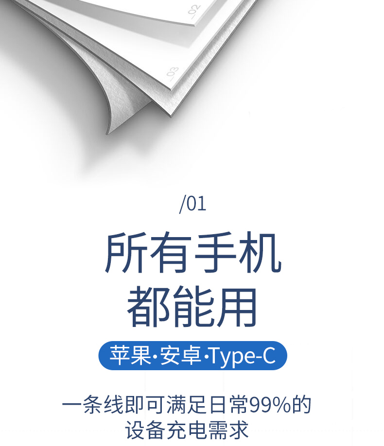 一拖三数据线,安卓苹果type,安全便捷善于充电,亮丽如新不氧化,升级大改造不伤机,涓流充电不过充,超柔软线身不折断,快充设计,三个设备一线搞定!